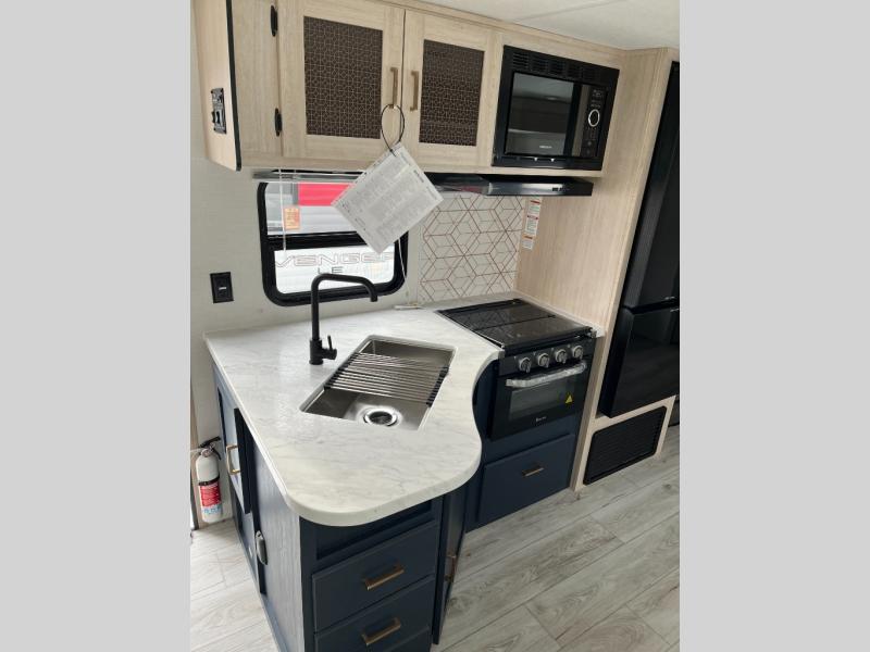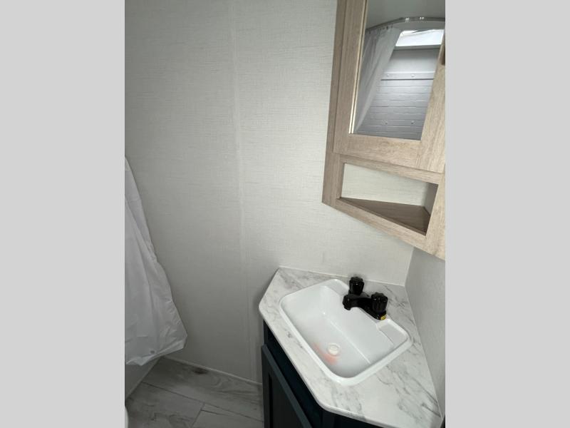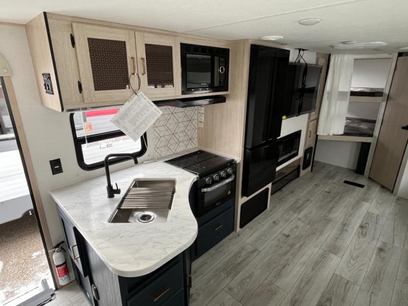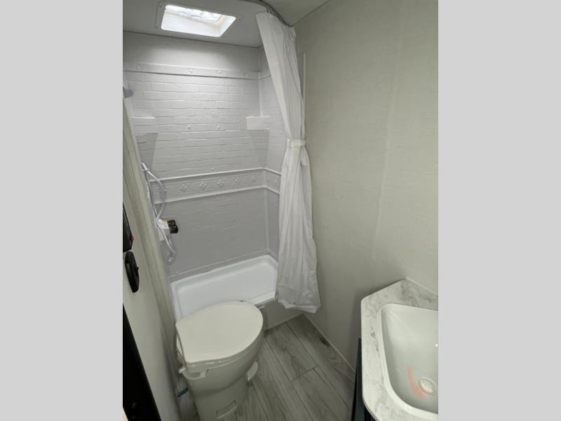 With any Avenger travel trailer by Prime Time, the exterior includes an aerodynamic smooth front metal, a diamond plate front rock guard for protection on the road, and four stabilizer jacks to keep your unit secure. There is a fully walkable roof plus an enclosed and heated underbelly that will help extend your camping season. The interior offers a 15,000 BTU air conditioner for the perfect climate inside, in-floor ducted heat, a systems monitor panel, and a Winegard 360+ antenna with Wi-Fi prep that will give you the option to stay connected as you camp. Each model also includes seamless Carefree Congoleum flooring, kitchen backsplash, shower pans in all models, and pleated nightshades throughout to name a few interior comforts!