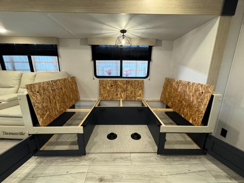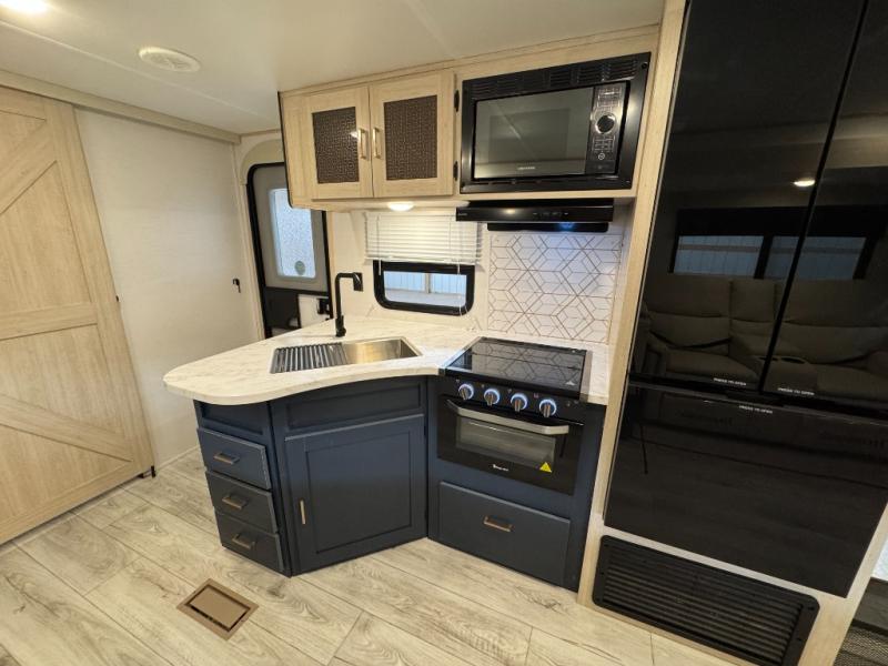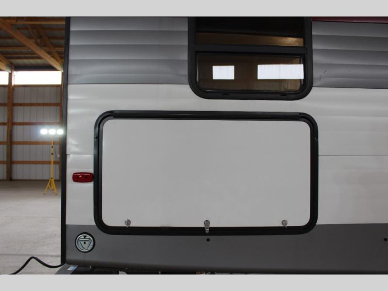 With any Avenger travel trailer by Prime Time, the exterior includes an aerodynamic smooth front metal, a diamond plate front rock guard for protection on the road, and four stabilizer jacks to keep your unit secure. There is a fully walkable roof plus an enclosed and heated underbelly that will help extend your camping season. The interior offers a 15,000 BTU air conditioner for the perfect climate inside, in-floor ducted heat, a systems monitor panel, and a Winegard 360+ antenna with Wi-Fi prep that will give you the option to stay connected as you camp. Each model also includes seamless Carefree Congoleum flooring, kitchen backsplash, shower pans in all models, and pleated nightshades throughout to name a few interior comforts!