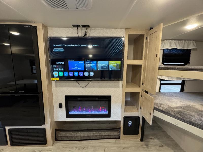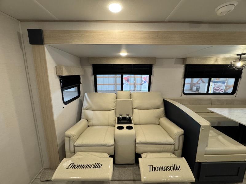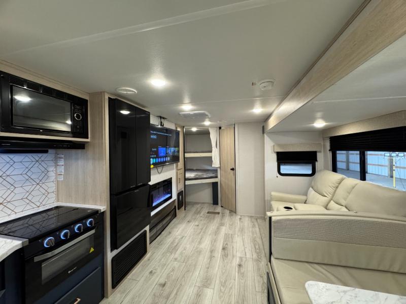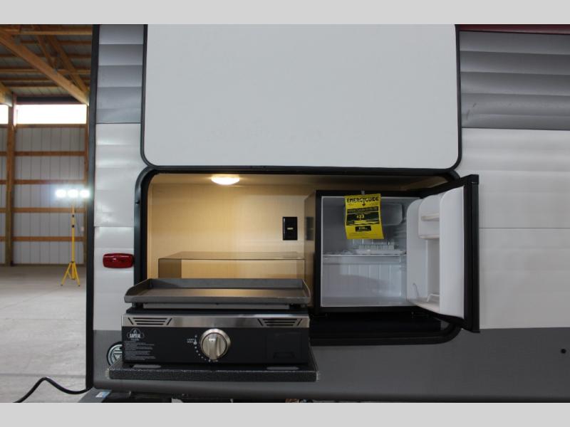 You and your family will love this trailer with all the sleeping accommodations, the privacy and the outdoor features! There are double-size bunks next to the full bathroom, a private front bedroom with space savings sliding doors, a walk-around queen bed, dual wardrobes, and overhead cabinets for storage. The large slide offers more floor space while cooking with full amenities including a pantry, and the theater seat and U-shaped dinette offer plenty of seating. This model also includes an outside kitchen that provides the cook another choice when feeding everyone, plus the 16' power awning gives you protection from the elements.