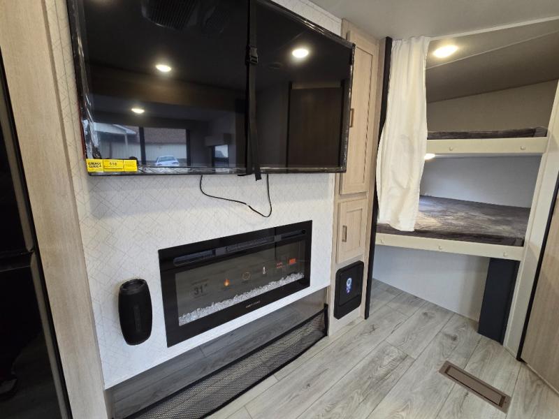 You and your family will love this trailer with all the sleeping accommodations, the privacy and the outdoor features! There are double-size bunks next to the full bathroom, a private front bedroom with space savings sliding doors, a walk-around queen bed, dual wardrobes, and overhead cabinets for storage. The large slide offers more floor space while cooking with full amenities including a pantry, and the theater seat and U-shaped dinette offer plenty of seating. This model also includes an outside kitchen that provides the cook another choice when feeding everyone, plus the 16' power awning gives you protection from the elements.