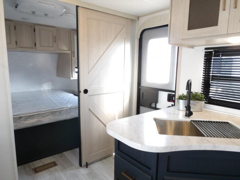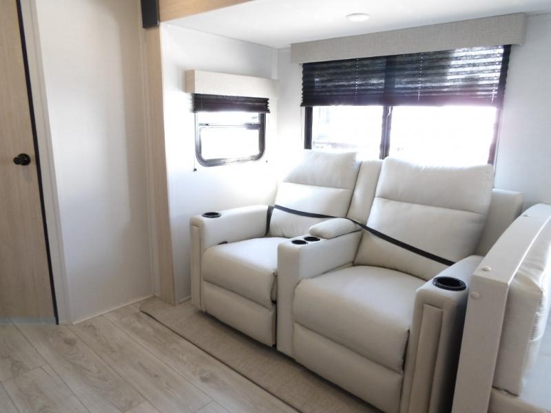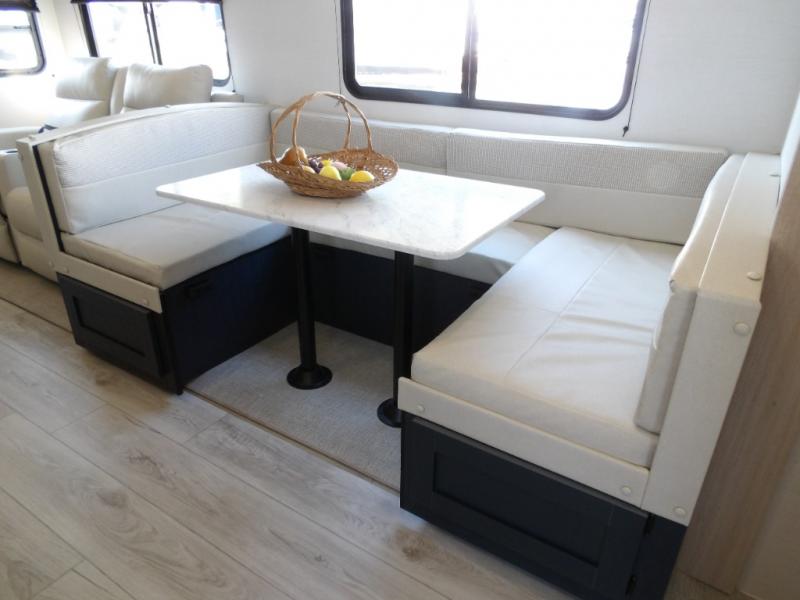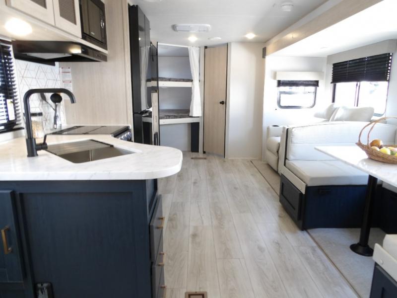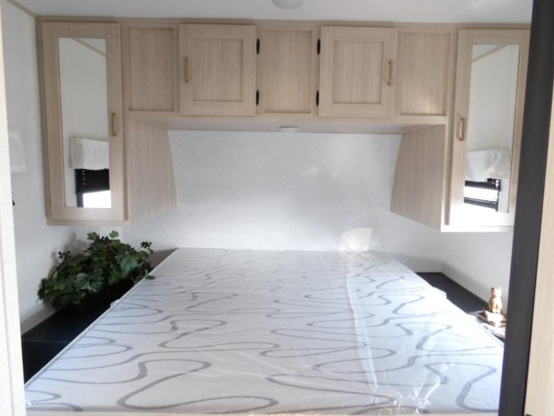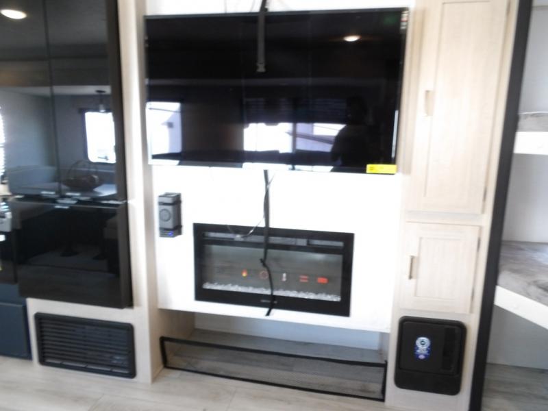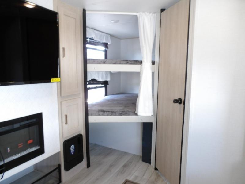 You and your family will love this trailer with all the sleeping accommodations, the privacy and the outdoor features! There are double-size bunks next to the full bathroom, a private front bedroom with space savings sliding doors, a walk-around queen bed, dual wardrobes, and overhead cabinets for storage. The large slide offers more floor space while cooking with full amenities including a pantry, and the theater seat and U-shaped dinette offer plenty of seating. This model also includes an outside kitchen that provides the cook another choice when feeding everyone, plus the 16' power awning gives you protection from the elements.