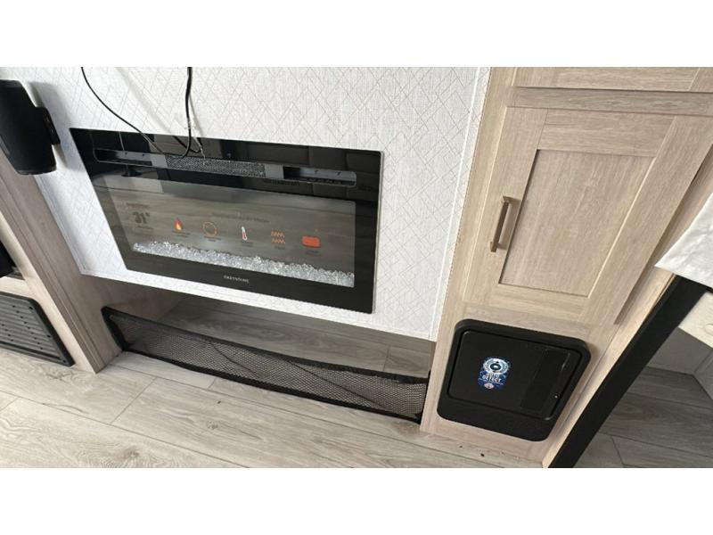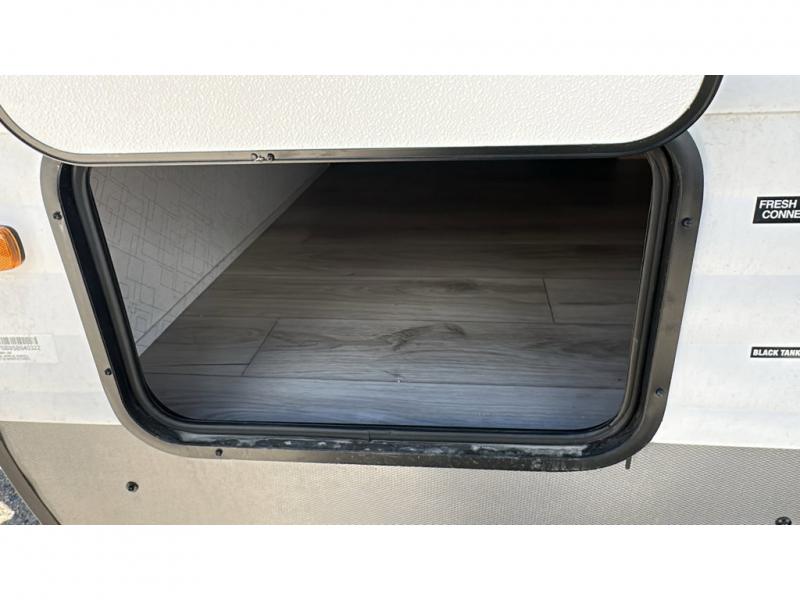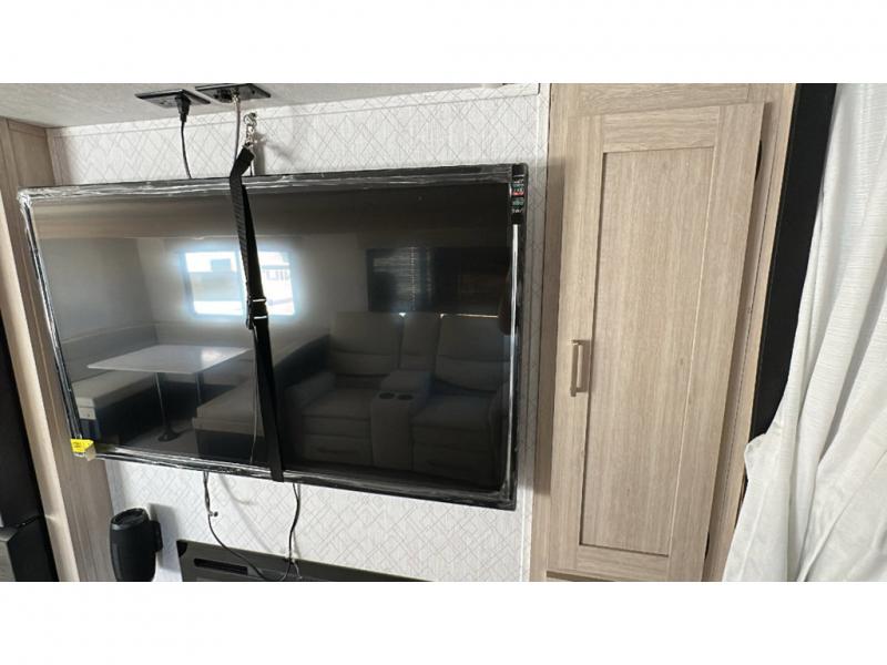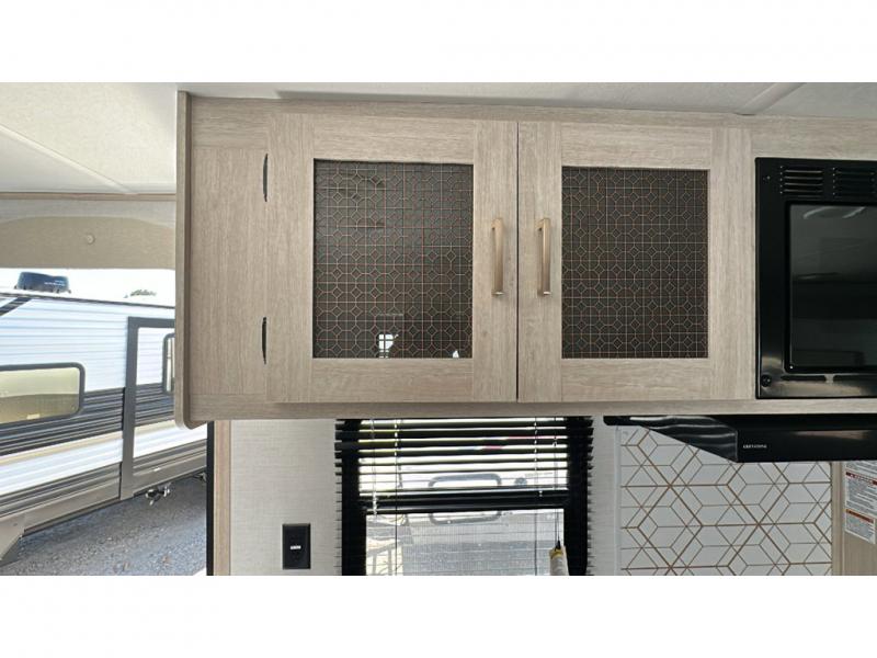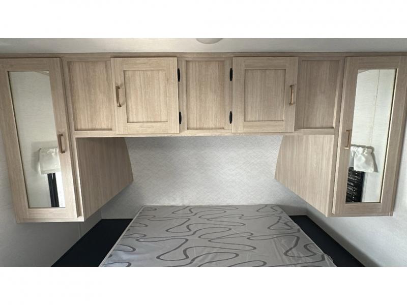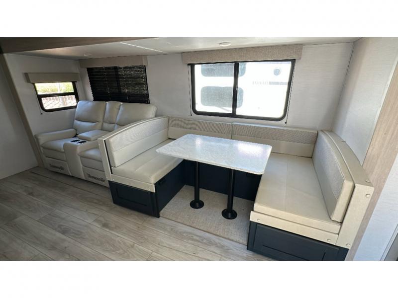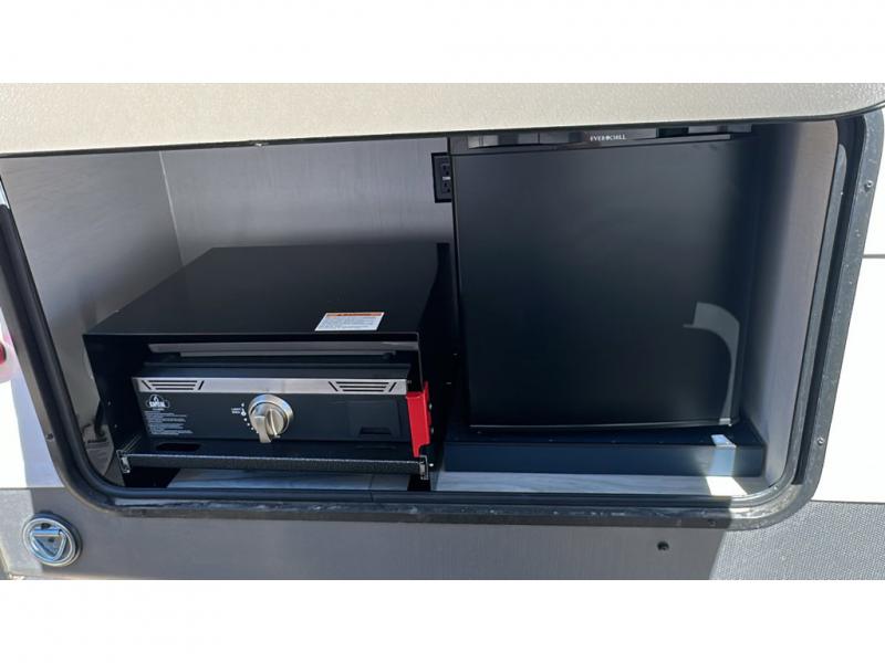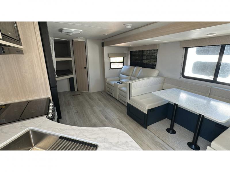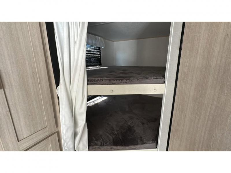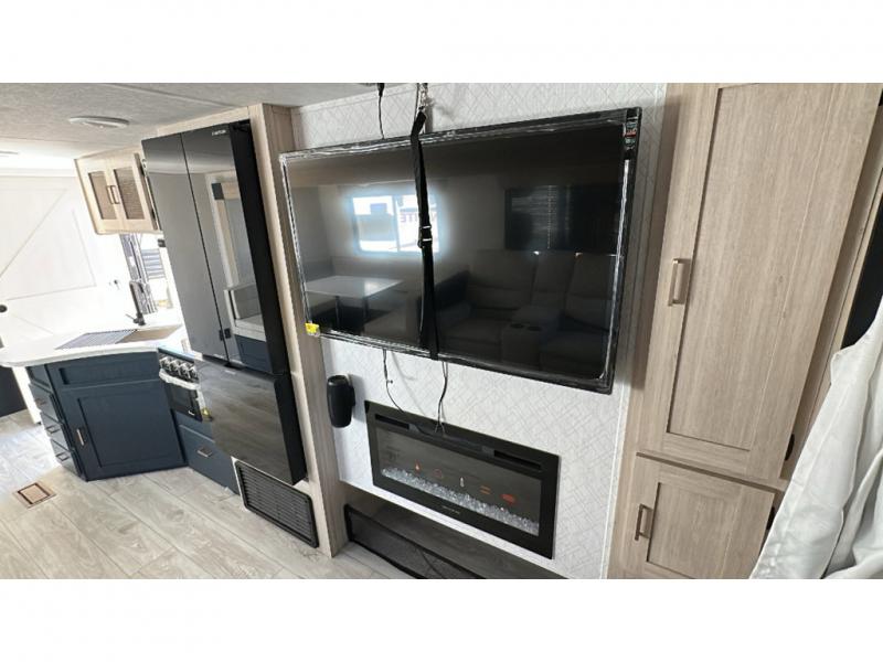 You and your family will love this trailer with all the sleeping accommodations, the privacy and the outdoor features! There are double-size bunks next to the full bathroom, a private front bedroom with space savings sliding doors, a walk-around queen bed, dual wardrobes, and overhead cabinets for storage. The large slide offers more floor space while cooking with full amenities including a pantry, and the theater seat and U-shaped dinette offer plenty of seating. This model also includes an outside kitchen that provides the cook another choice when feeding everyone, plus the 16' power awning gives you protection from the elements.