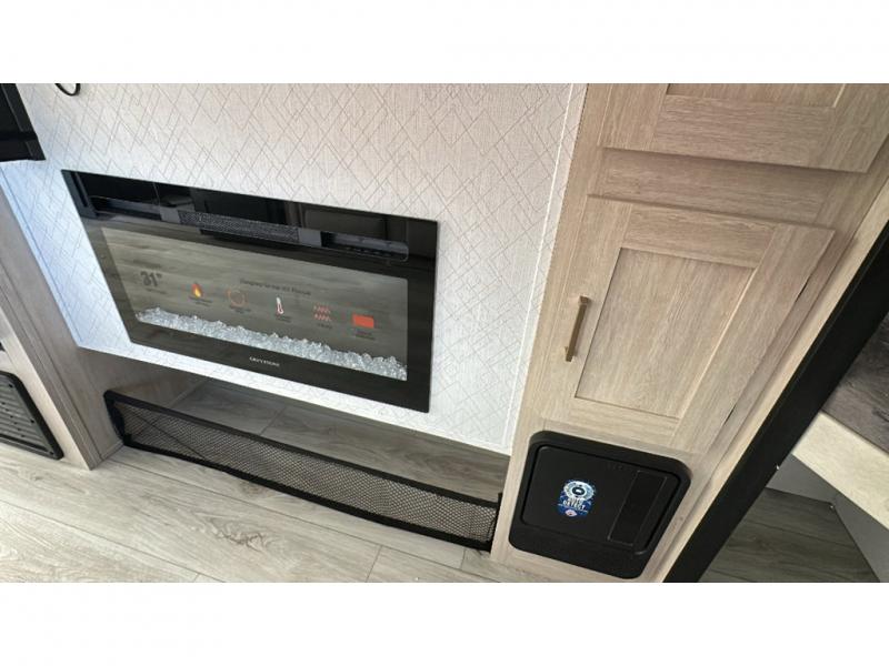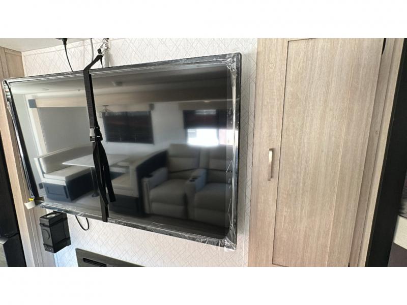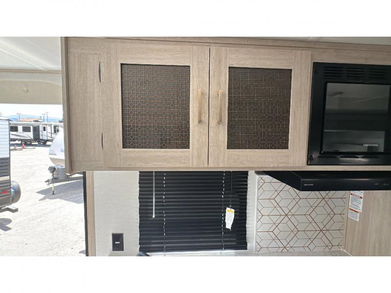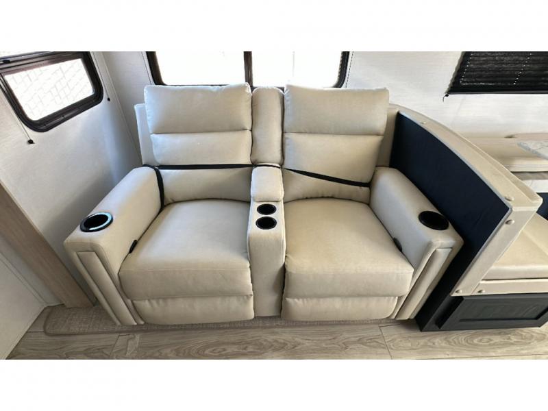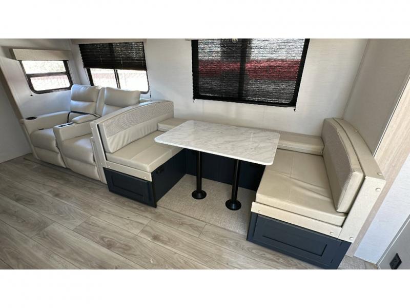 You and your family will love this trailer with all the sleeping accommodations, the privacy and the outdoor features! There are double-size bunks next to the full bathroom, a private front bedroom with space savings sliding doors, a walk-around queen bed, dual wardrobes, and overhead cabinets for storage. The large slide offers more floor space while cooking with full amenities including a pantry, and the theater seat and U-shaped dinette offer plenty of seating. This model also includes an outside kitchen that provides the cook another choice when feeding everyone, plus the 16' power awning gives you protection from the elements.