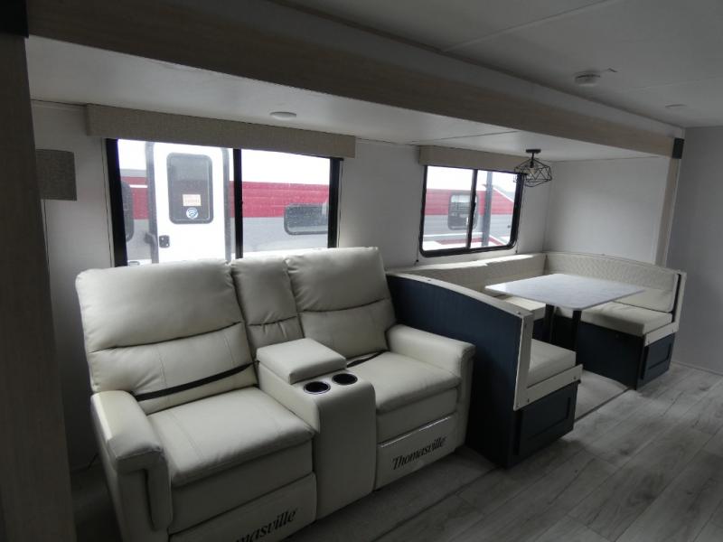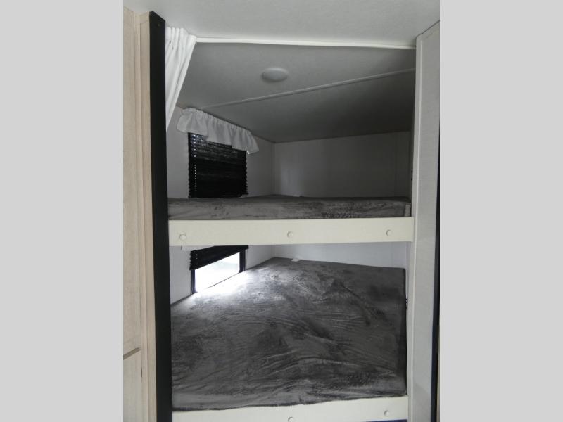 You and your family will love this trailer with all the sleeping accommodations, the privacy and the outdoor features! There are double-size bunks next to the full bathroom, a private front bedroom with space savings sliding doors, a walk-around queen bed, dual wardrobes, and overhead cabinets for storage. The large slide offers more floor space while cooking with full amenities including a pantry, and the theater seat and U-shaped dinette offer plenty of seating. This model also includes an outside kitchen that provides the cook another choice when feeding everyone, plus the 16' power awning gives you protection from the elements.