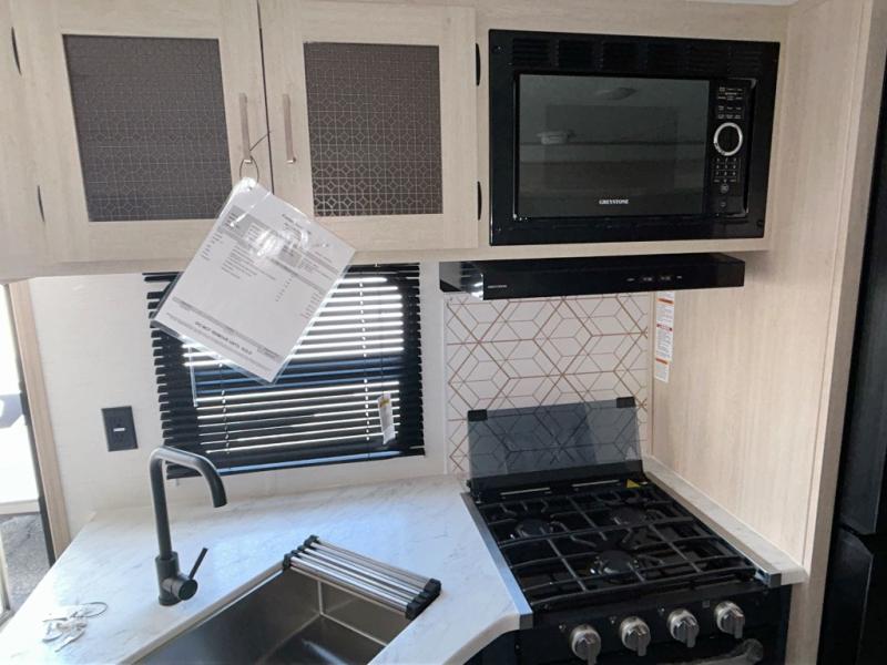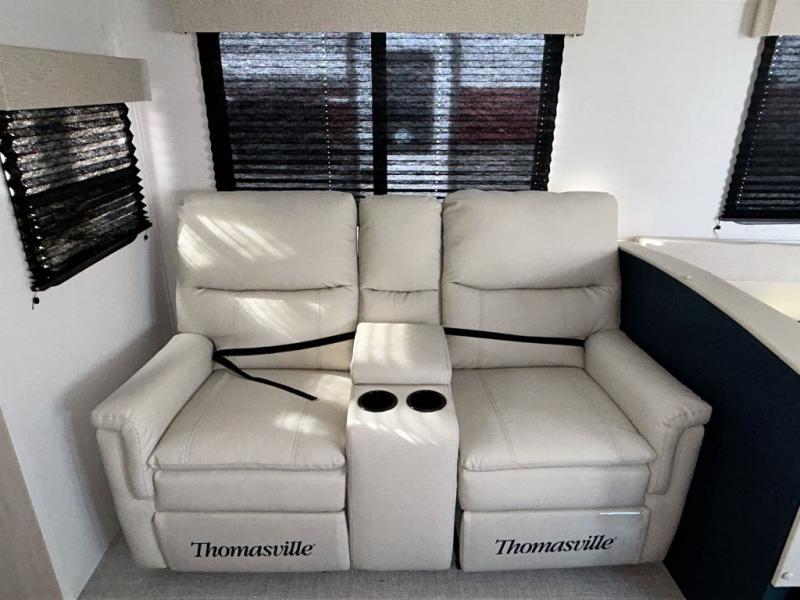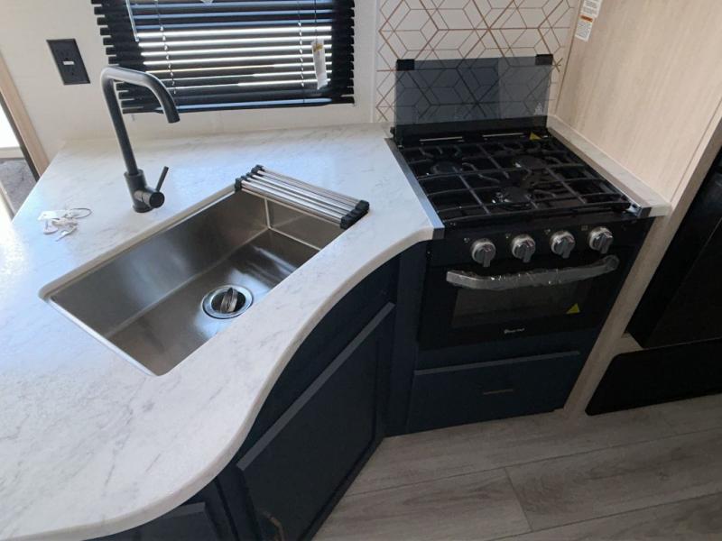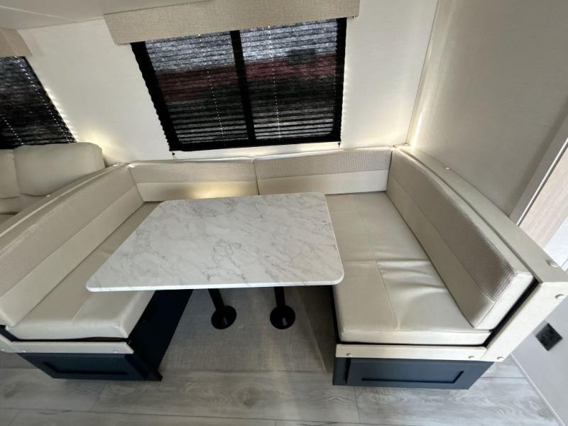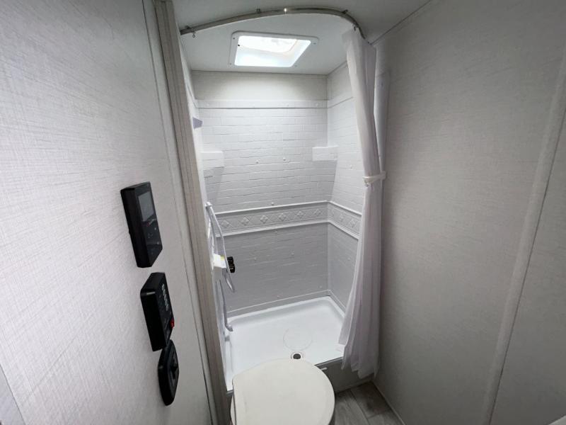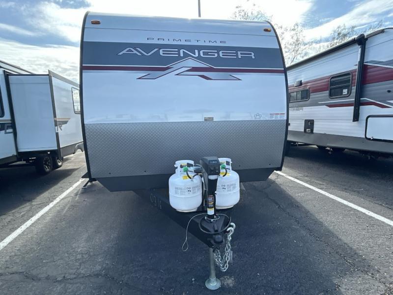 With any Avenger travel trailer by Prime Time, the exterior includes an aerodynamic smooth front metal, a diamond plate front rock guard for protection on the road, and four stabilizer jacks to keep your unit secure. There is a fully walkable roof plus an enclosed and heated underbelly that will help extend your camping season. The interior offers a 15,000 BTU air conditioner for the perfect climate inside, in-floor ducted heat, a systems monitor panel, and a Winegard 360+ antenna with Wi-Fi prep that will give you the option to stay connected as you camp. Each model also includes seamless Carefree Congoleum flooring, kitchen backsplash, shower pans in all models, and pleated nightshades throughout to name a few interior comforts!