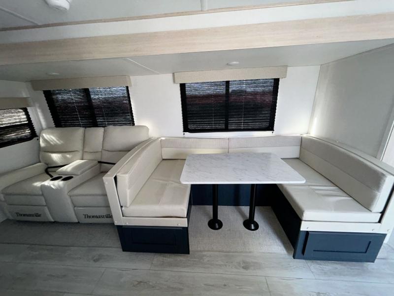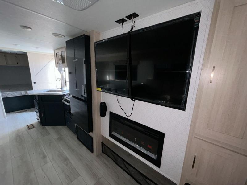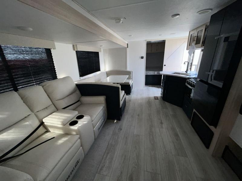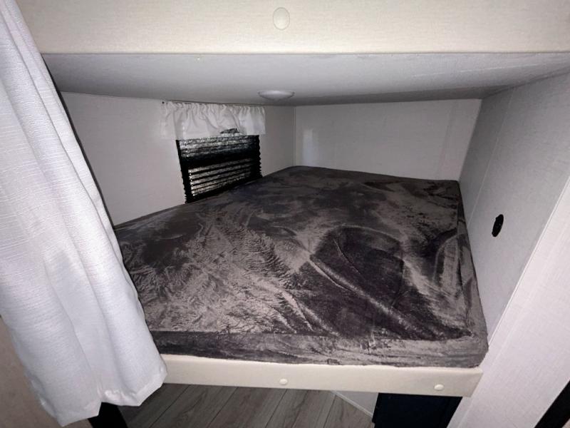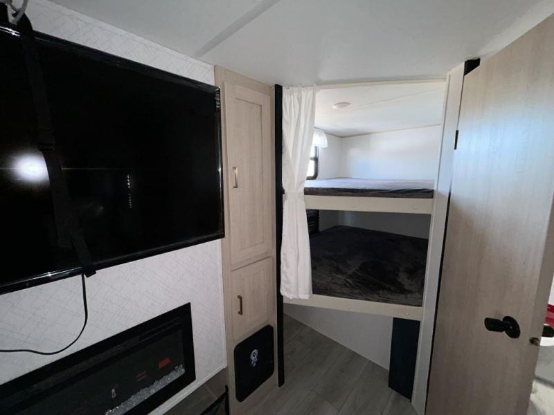 You and your family will love this trailer with all the sleeping accommodations, the privacy and the outdoor features! There are double-size bunks next to the full bathroom, a private front bedroom with space savings sliding doors, a walk-around queen bed, dual wardrobes, and overhead cabinets for storage. The large slide offers more floor space while cooking with full amenities including a pantry, and the theater seat and U-shaped dinette offer plenty of seating. This model also includes an outside kitchen that provides the cook another choice when feeding everyone, plus the 16' power awning gives you protection from the elements.