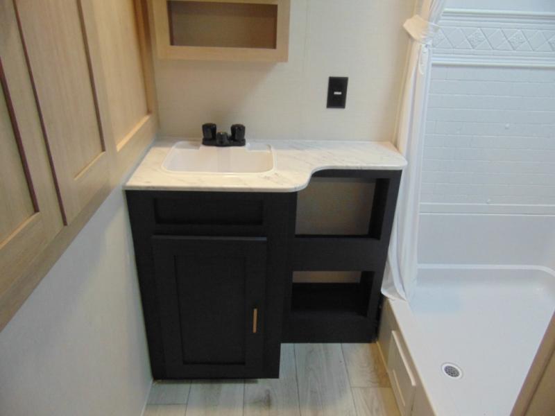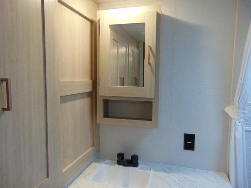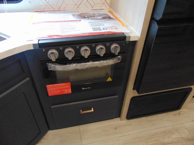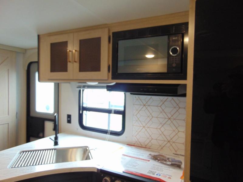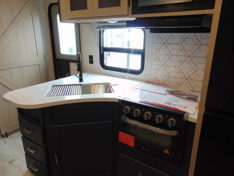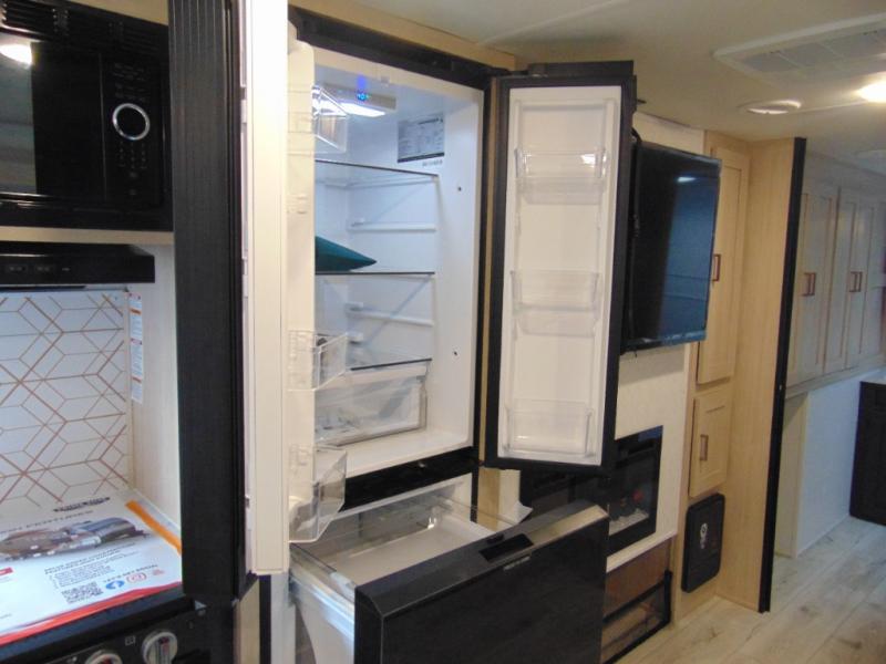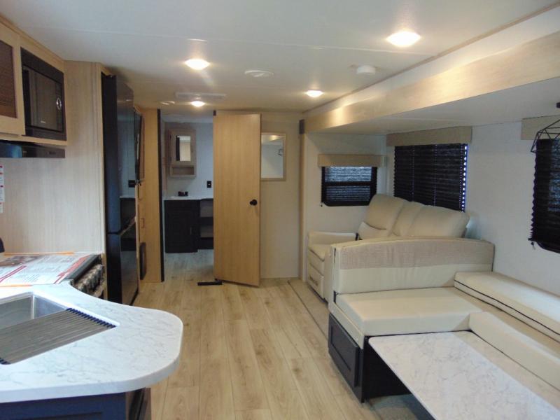 Step inside and discover a spacious interior thoughtfully designed for modern RV living. The rear kitchen features a full-size refrigerator, microwave, stove, and ample counter space, making meal preparation easy and convenient. The living area offers a comfortable dinette and sofa, perfect for relaxing, dining, or entertaining. The private bedroom provides a cozy retreat at the end of the day, while the well-appointed bathroom ensures convenience on every trip.