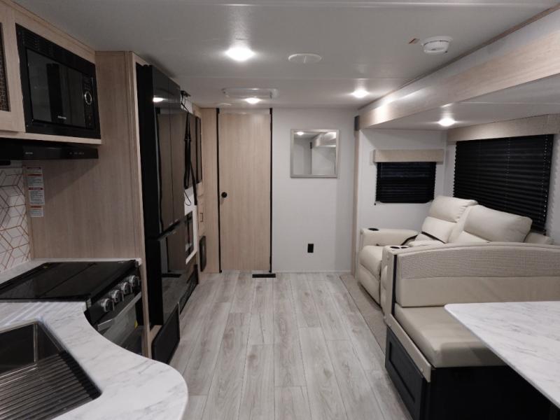 With any Avenger travel trailer by Prime Time, the exterior includes an aerodynamic smooth front metal, a diamond plate front rock guard for protection on the road, and four stabilizer jacks to keep your unit secure. There is a fully walkable roof plus an enclosed and heated underbelly that will help extend your camping season. The interior offers a 15,000 BTU air conditioner for the perfect climate inside, in-floor ducted heat, a systems monitor panel, and a Winegard 360+ antenna with Wi-Fi prep that will give you the option to stay connected as you camp. Each model also includes seamless Carefree Congoleum flooring, kitchen backsplash, shower pans in all models, and pleated nightshades throughout to name a few interior comforts!