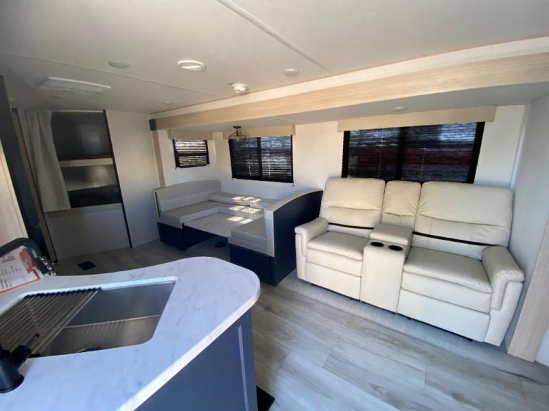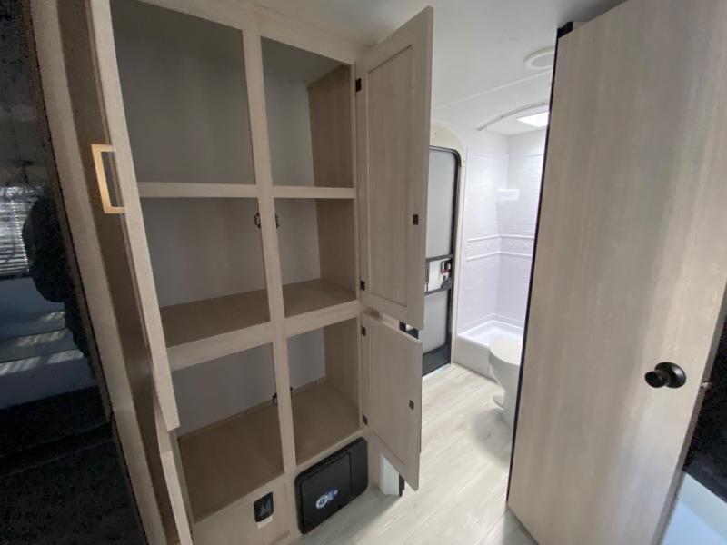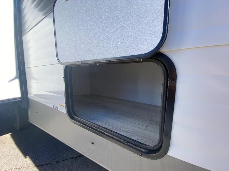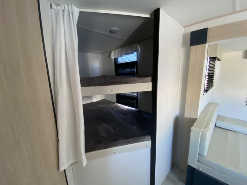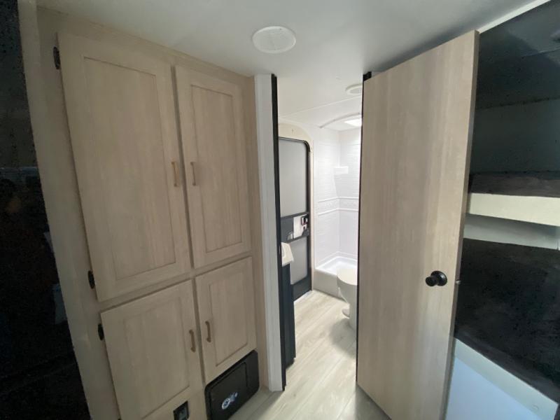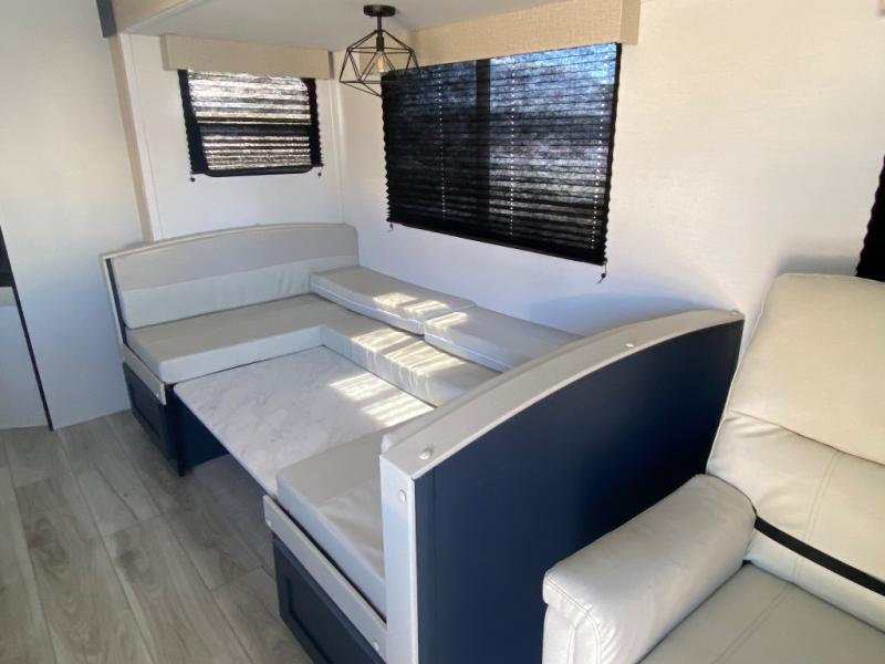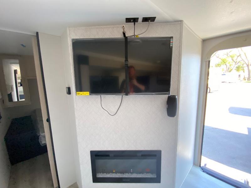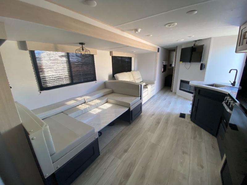 Your family will love this trailer and camping anywhere you go! With a full and half bathroom, you will have the easiest time getting ready in the morning and cleaning up after a full day of hiking. The half bathroom is completely secluded within the front bedroom creating an enticing master suite for the owner of this trailer, and the full bathroom contains the second exterior entry door so that everyone else can quickly get inside to use the restroom while outside playing. The large slide is going to make the main living space feel open and inviting, and the double-size bunks provide you with compact sleeping for four. There is also a large pantry for storing your snacks and a fireplace for keeping the interior cozy.