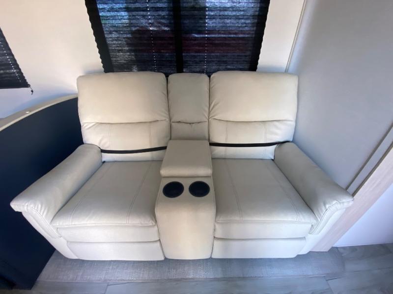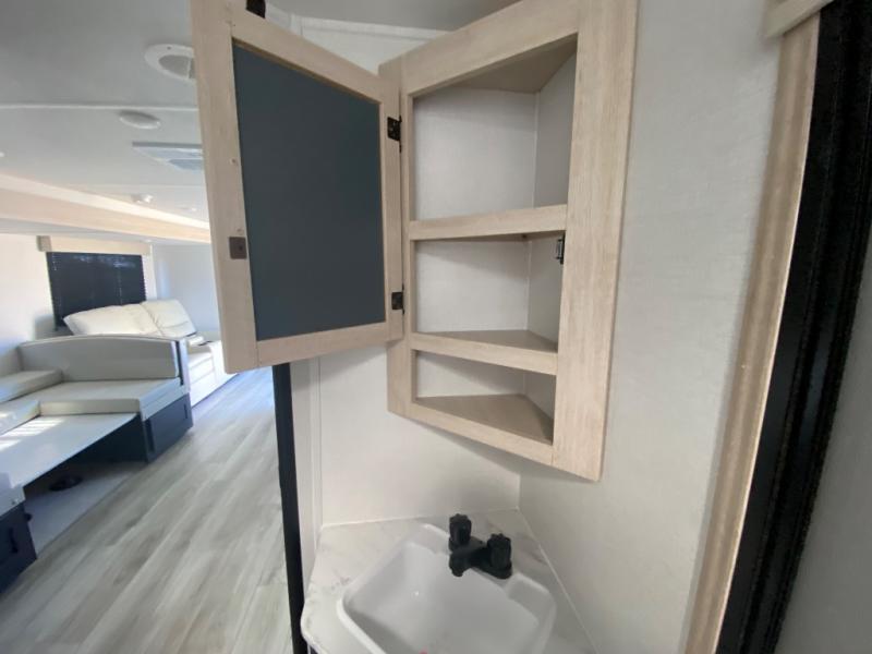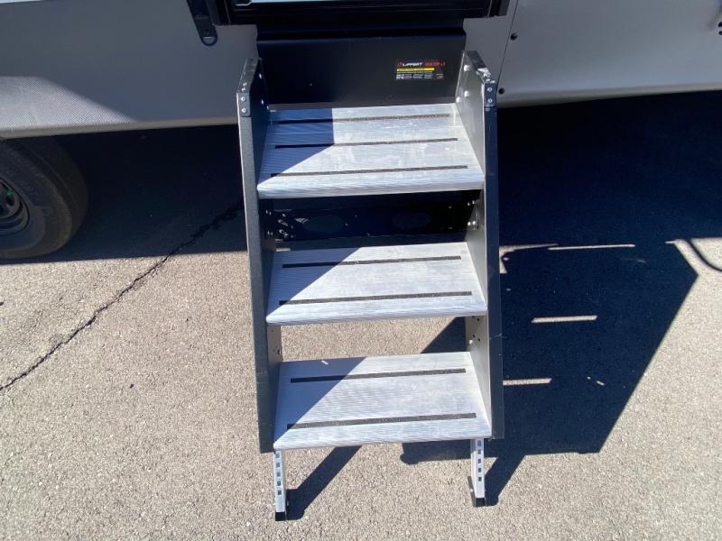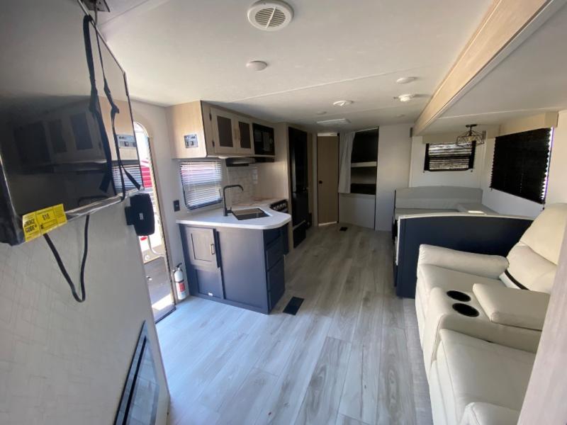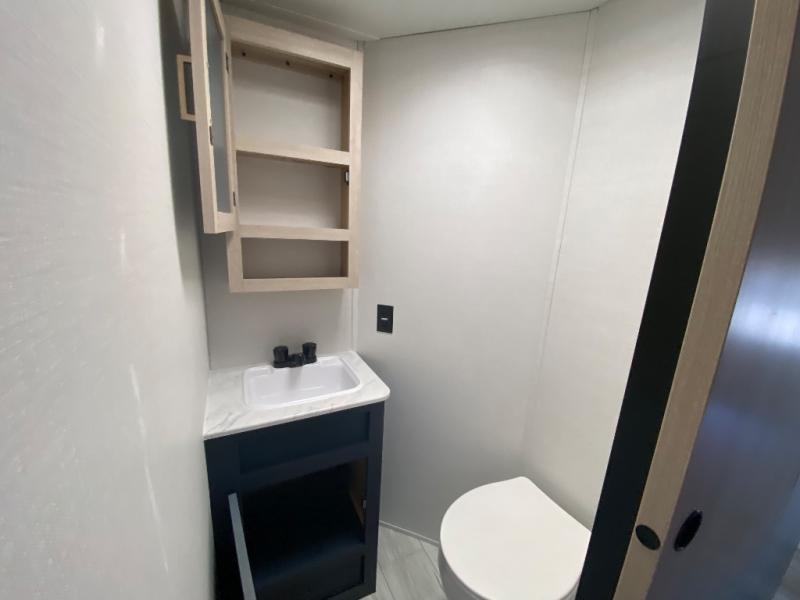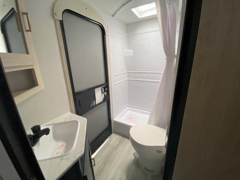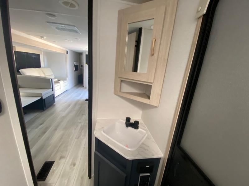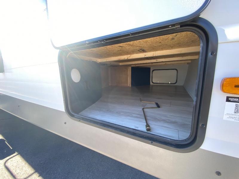 Your family will love this trailer and camping anywhere you go! With a full and half bathroom, you will have the easiest time getting ready in the morning and cleaning up after a full day of hiking. The half bathroom is completely secluded within the front bedroom creating an enticing master suite for the owner of this trailer, and the full bathroom contains the second exterior entry door so that everyone else can quickly get inside to use the restroom while outside playing. The large slide is going to make the main living space feel open and inviting, and the double-size bunks provide you with compact sleeping for four. There is also a large pantry for storing your snacks and a fireplace for keeping the interior cozy.
