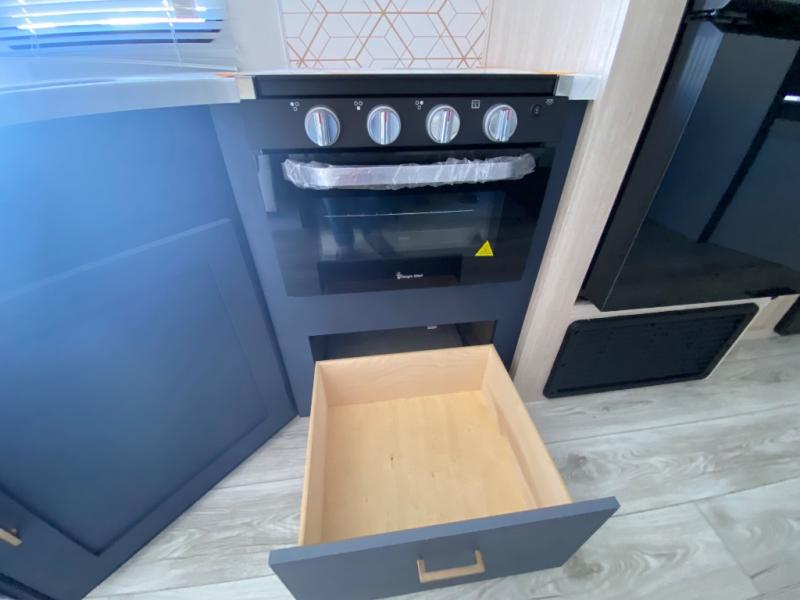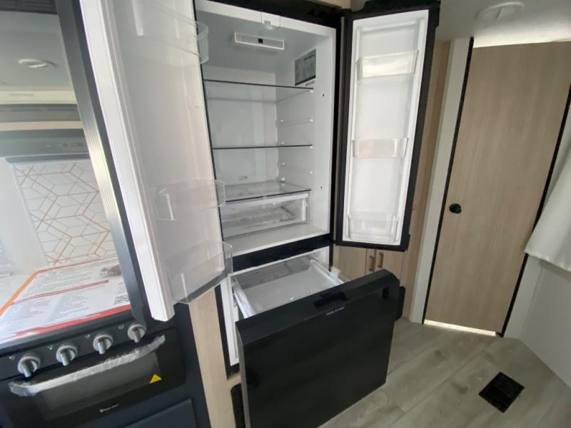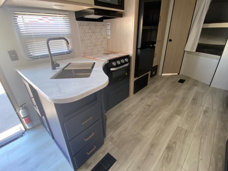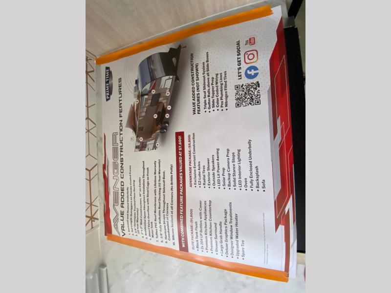 With any Avenger travel trailer by Prime Time, the exterior includes an aerodynamic smooth front metal, a diamond plate front rock guard for protection on the road, and four stabilizer jacks to keep your unit secure. There is a fully walkable roof plus an enclosed and heated underbelly that will help extend your camping season. The interior offers a 15,000 BTU air conditioner for the perfect climate inside, in-floor ducted heat, a systems monitor panel, and a Winegard 360+ antenna with Wi-Fi prep that will give you the option to stay connected as you camp. Each model also includes seamless Carefree Congoleum flooring, kitchen backsplash, shower pans in all models, and pleated nightshades throughout to name a few interior comforts!
