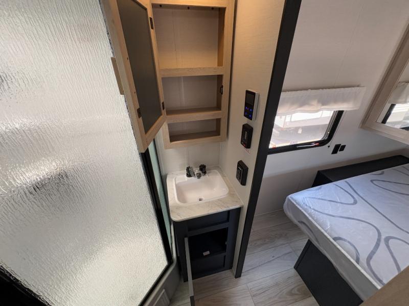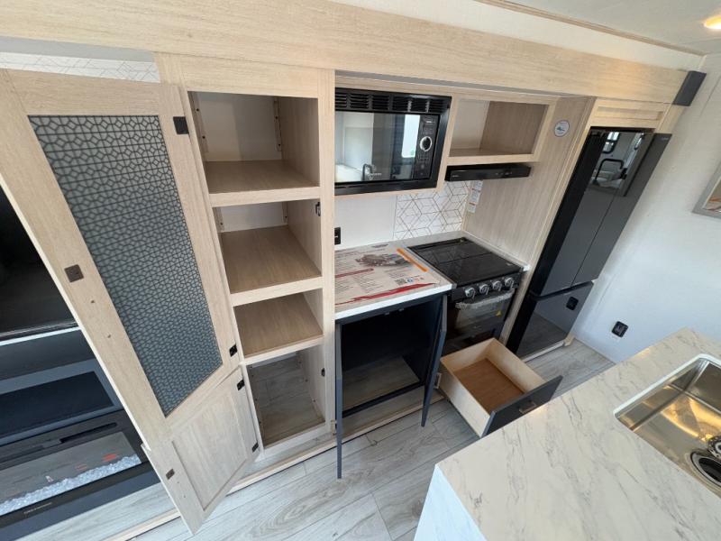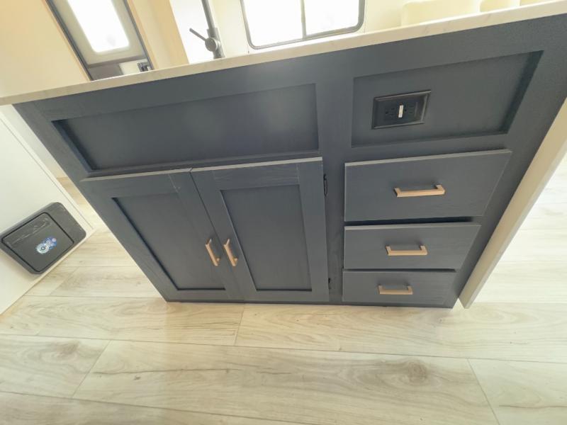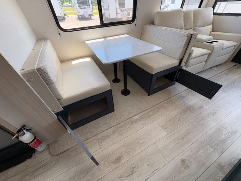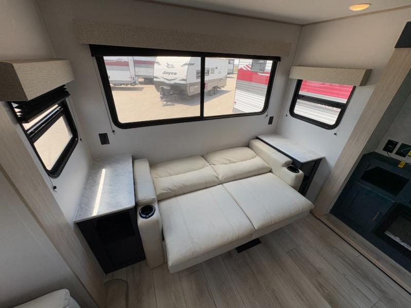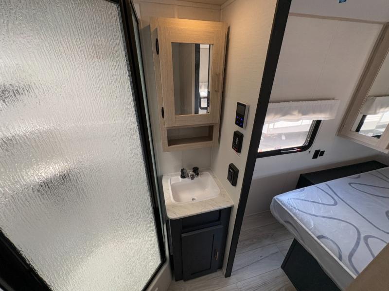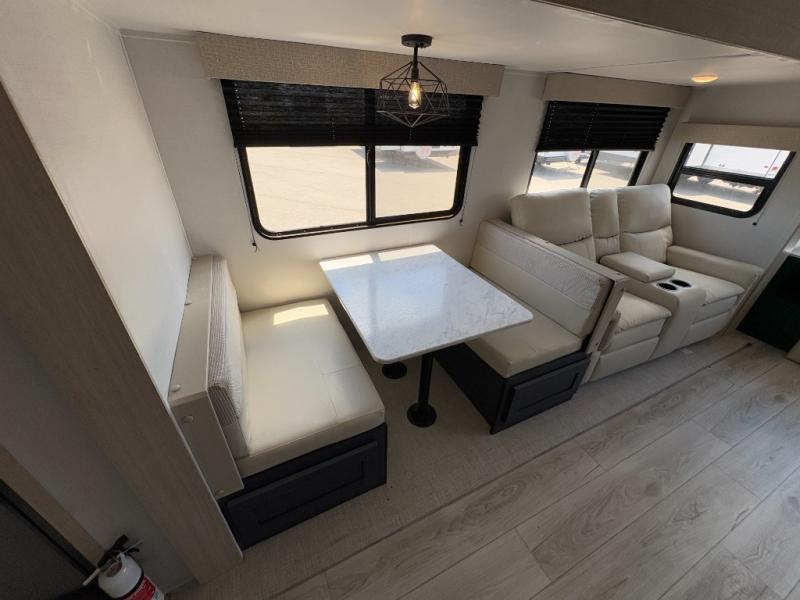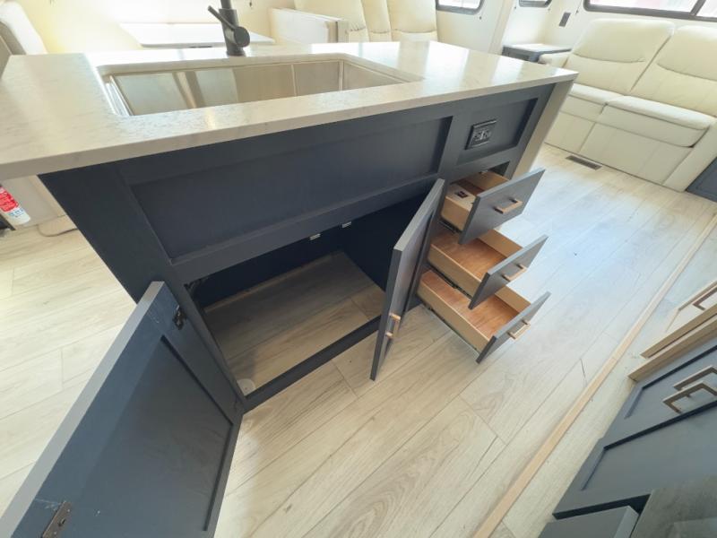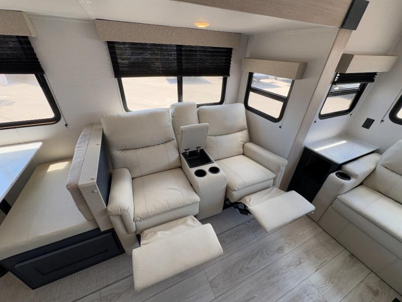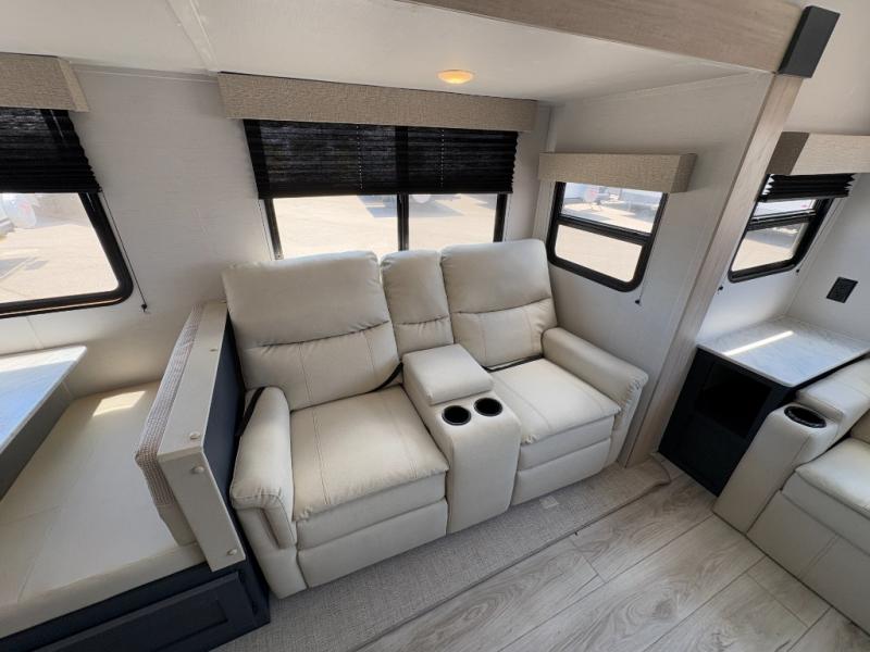 A couple or family will enjoy all the space in the main living and kitchen area, and the privacy in the front bedroom. As you spend each night sleeping on the queen-size bed in the master suite, you will appreciate the convenience of discreetly entering the full bathroom with a neo-angled shower without waking up your guests who are sleeping on the sofa or booth dinette. Because there are two opposing slides included in the central living area, there is plenty of space to prep dinner or wash dishes on the kitchen island.