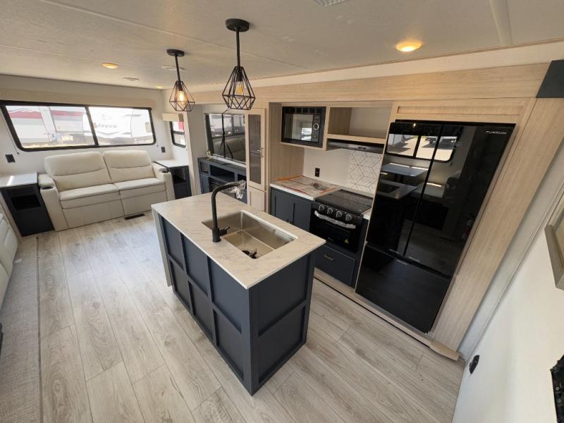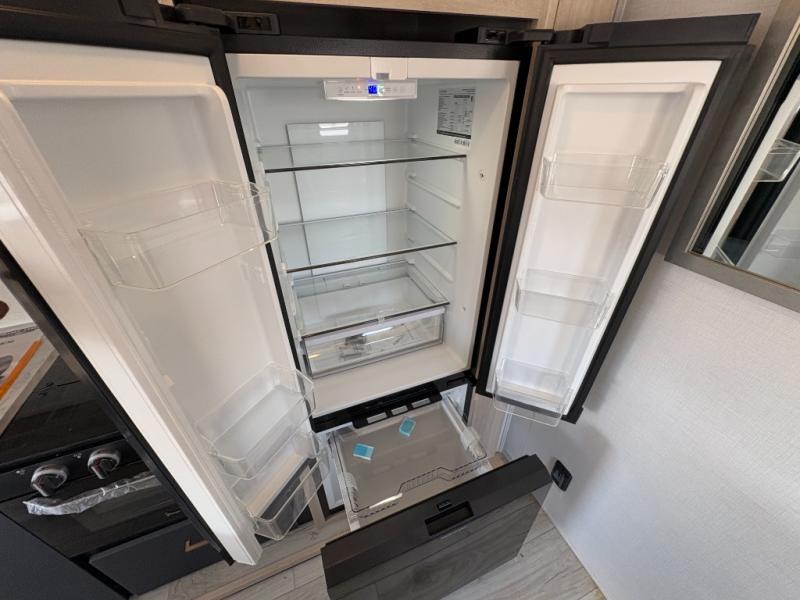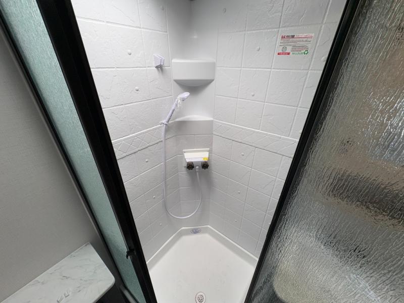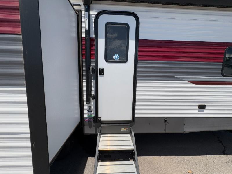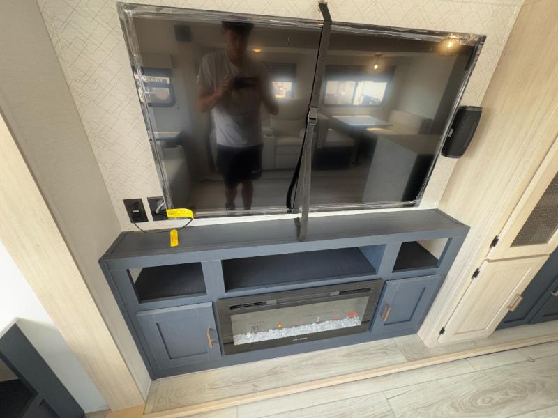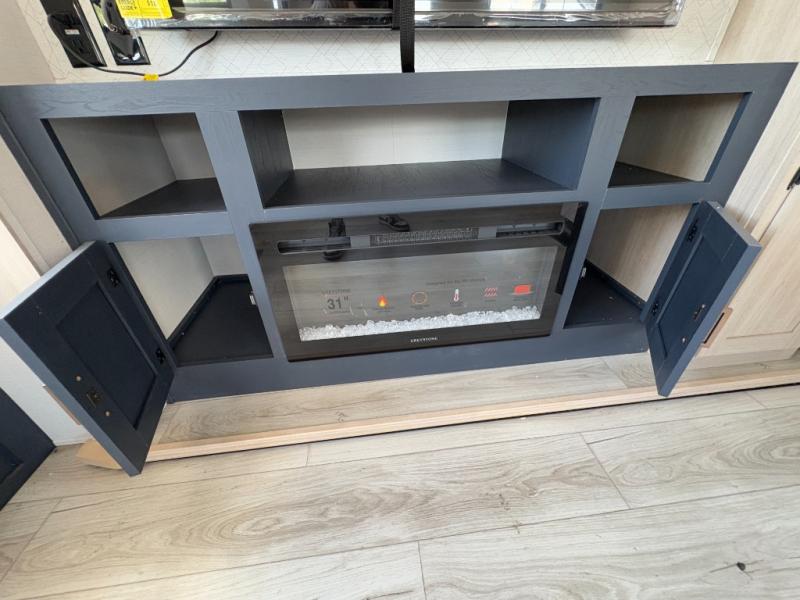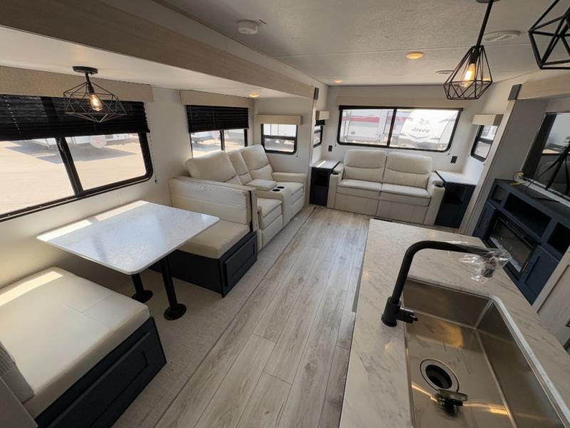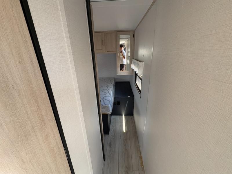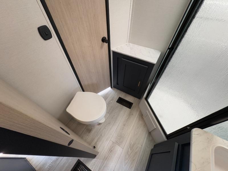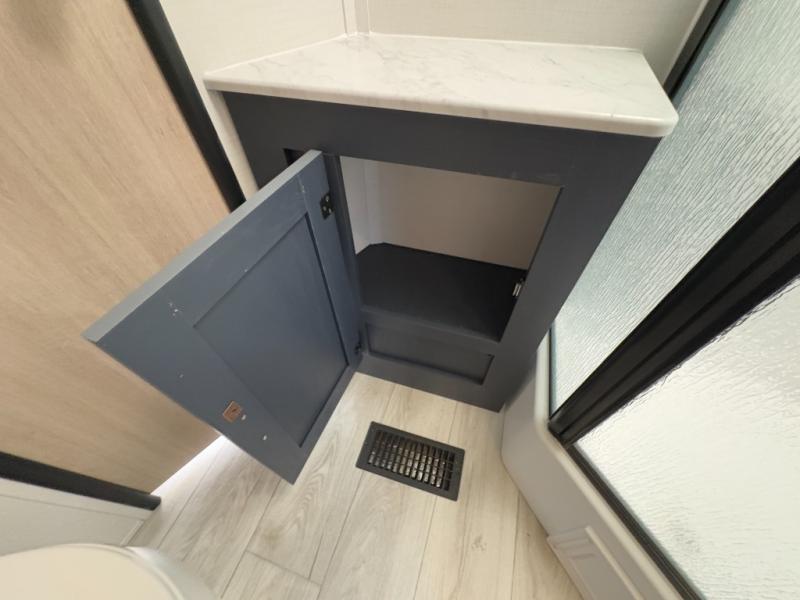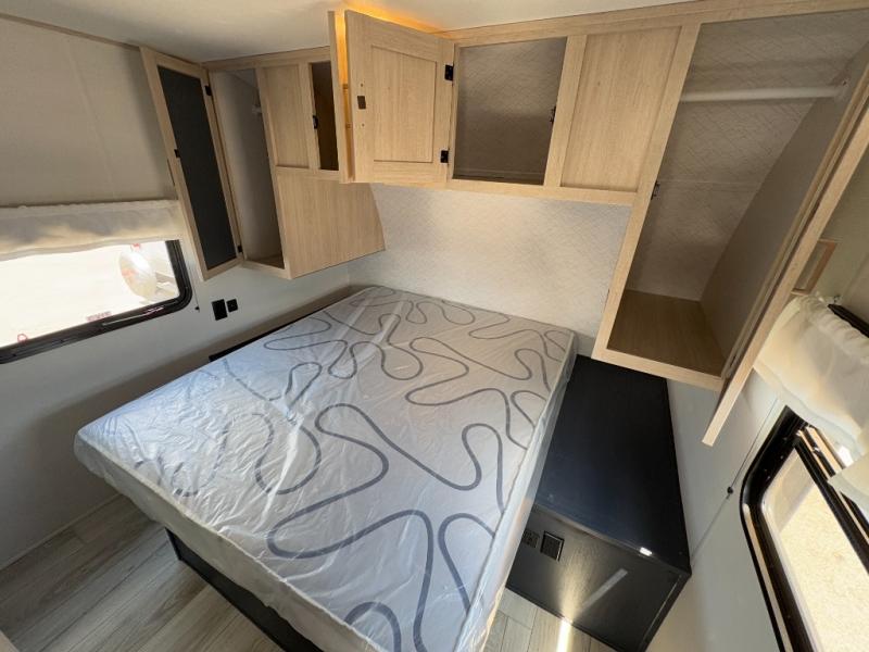 A couple or family will enjoy all the space in the main living and kitchen area, and the privacy in the front bedroom. As you spend each night sleeping on the queen-size bed in the master suite, you will appreciate the convenience of discreetly entering the full bathroom with a neo-angled shower without waking up your guests who are sleeping on the sofa or booth dinette. Because there are two opposing slides included in the central living area, there is plenty of space to prep dinner or wash dishes on the kitchen island.