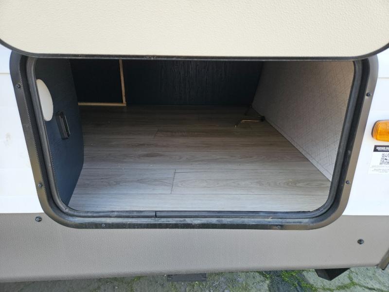 A couple or family will enjoy all the space in the main living and kitchen area, and the privacy in the front bedroom. As you spend each night sleeping on the queen-size bed in the master suite, you will appreciate the convenience of discreetly entering the full bathroom with a neo-angled shower without waking up your guests who are sleeping on the sofa or booth dinette. Because there are two opposing slides included in the central living area, there is plenty of space to prep dinner or wash dishes on the kitchen island.