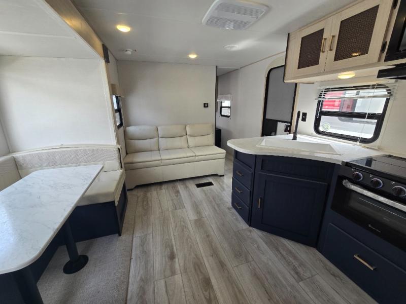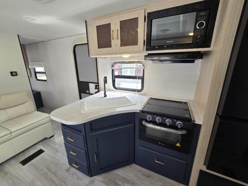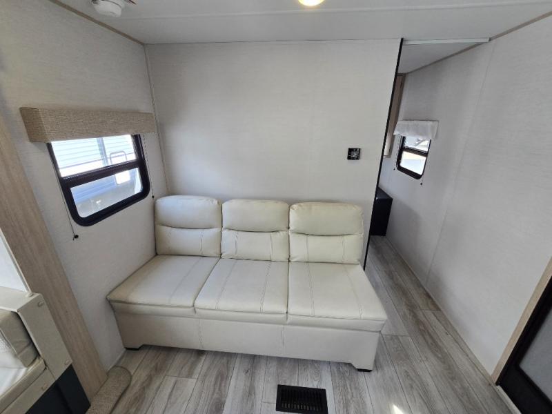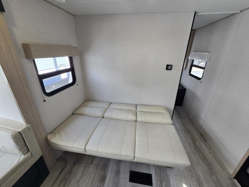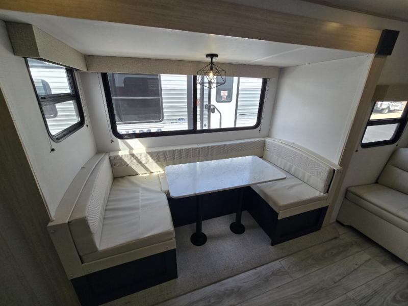 This rear bath travel trailer offers privacy to change and get cleaned up as well as linen storage so you will have everything you need in one place. The walk-around queen bed in the private bedroom, plus the furniture which folds down into extra sleeping space at night allows five or six to sleep comfortably after hiking or relaxing and enjoying the outdoors. The cook will appreciate the three-burner range to make snacks and meals to eat at the U-shaped dinette slide or outside under the 15' power awning that creates a covered outdoor living area protected from the elements.