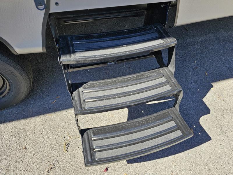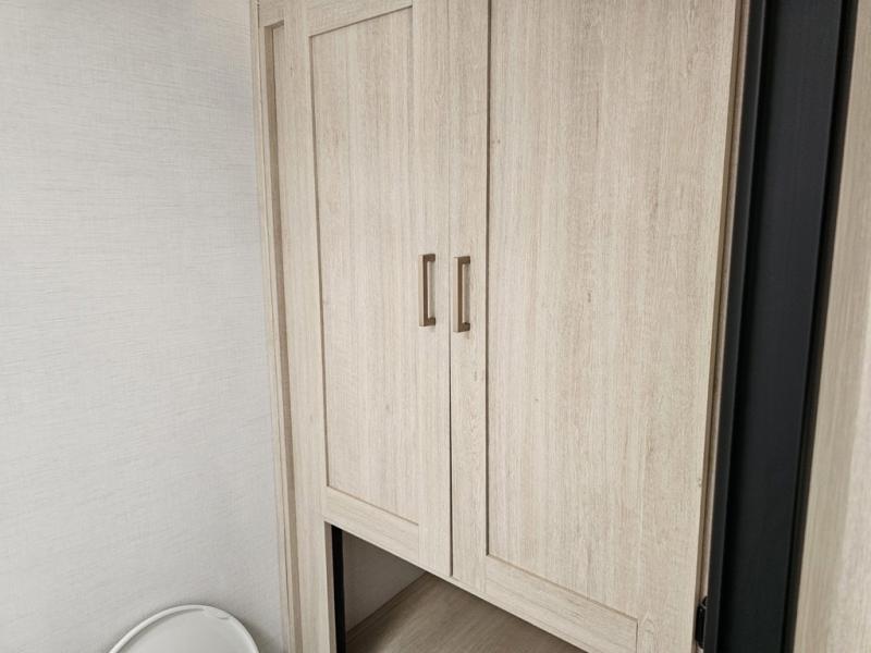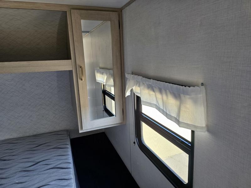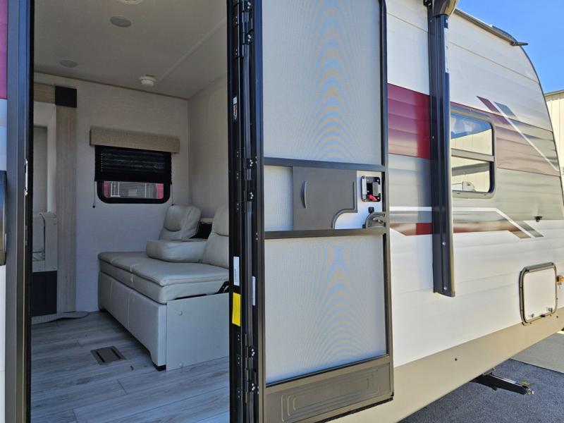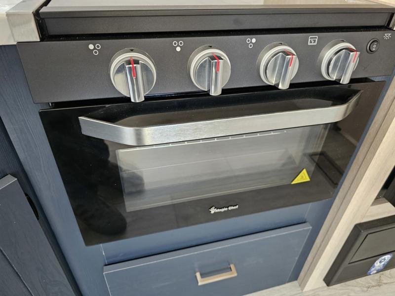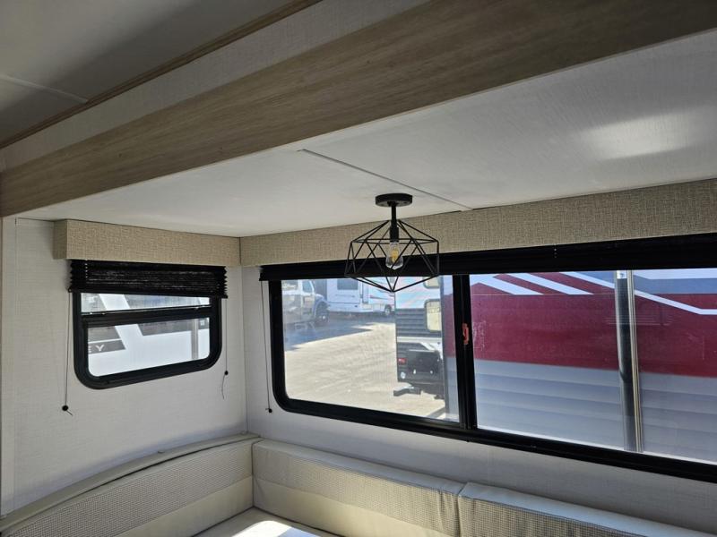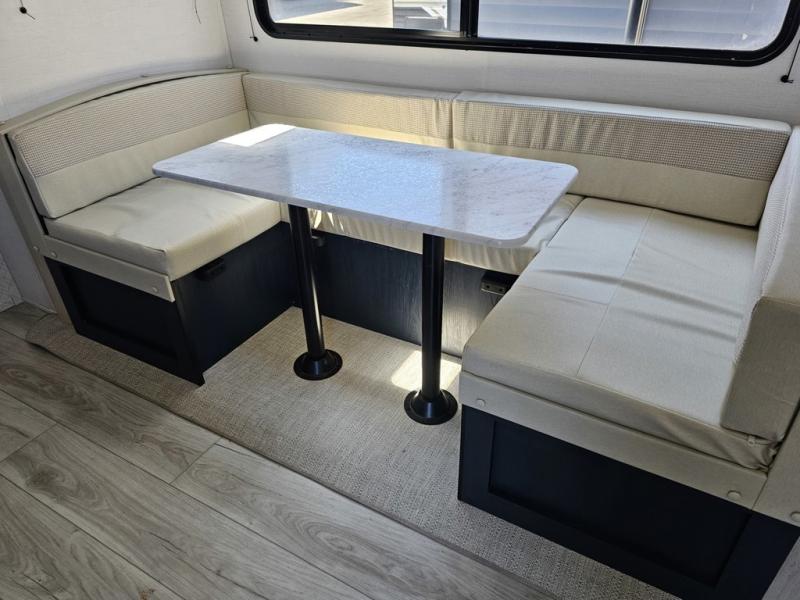 This rear bath travel trailer offers privacy to change and get cleaned up as well as linen storage so you will have everything you need in one place. The walk-around queen bed in the private bedroom, plus the furniture which folds down into extra sleeping space at night allows five or six to sleep comfortably after hiking or relaxing and enjoying the outdoors. The cook will appreciate the three-burner range to make snacks and meals to eat at the U-shaped dinette slide or outside under the 15' power awning that creates a covered outdoor living area protected from the elements.