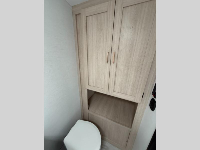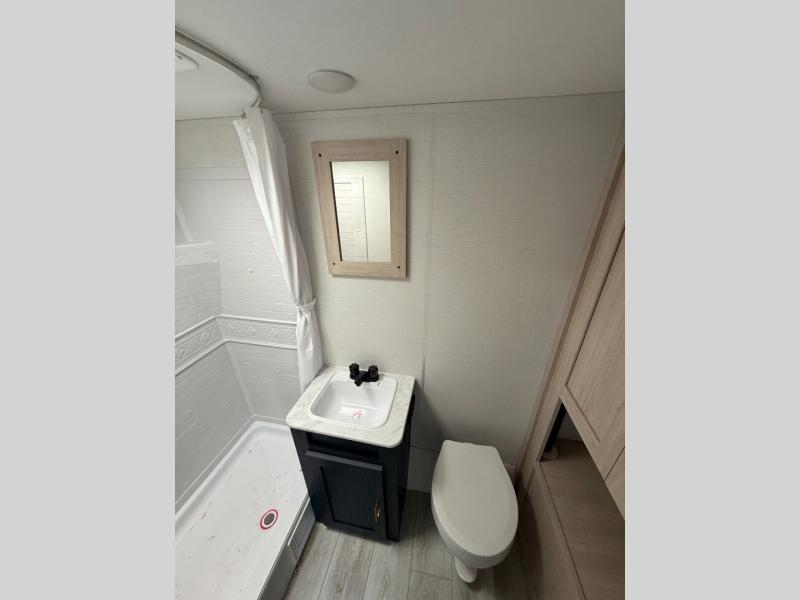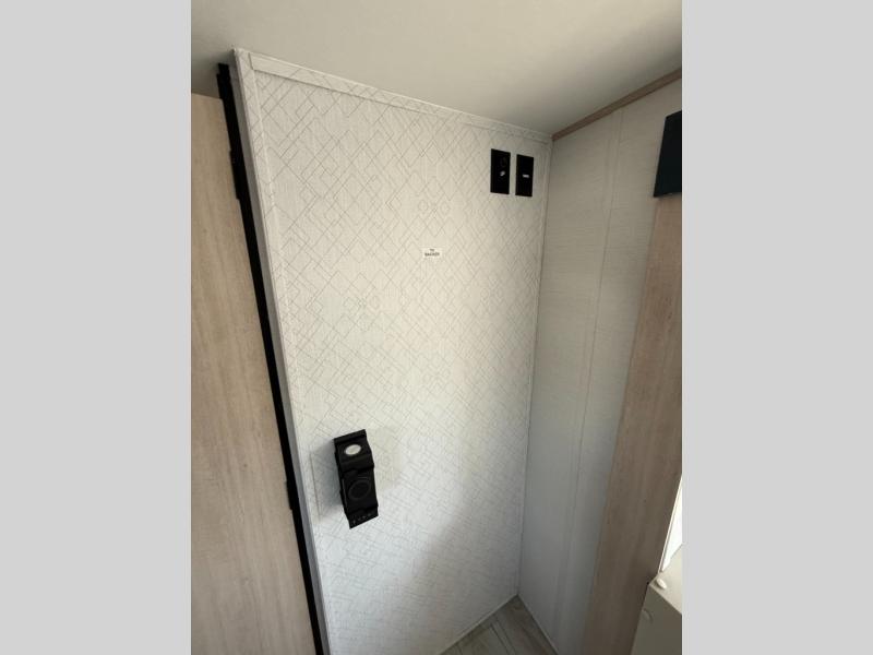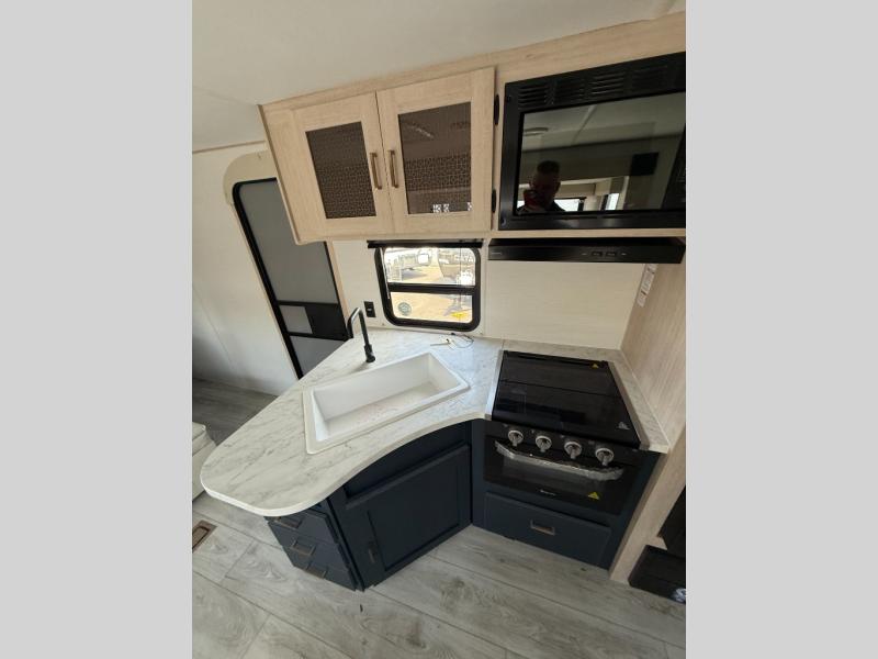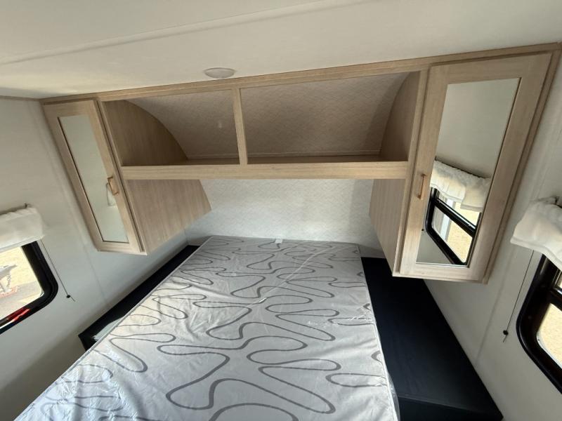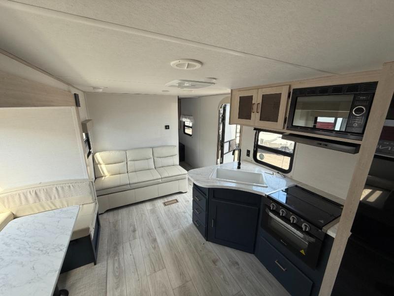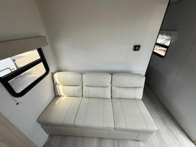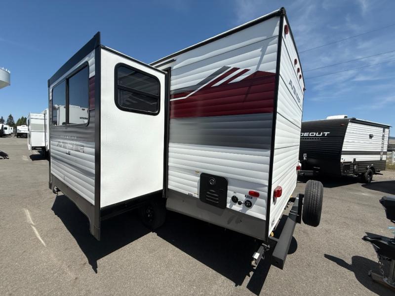 This rear bath travel trailer offers privacy to change and get cleaned up as well as linen storage so you will have everything you need in one place. The walk-around queen bed in the private bedroom, plus the furniture which folds down into extra sleeping space at night allows five or six to sleep comfortably after hiking or relaxing and enjoying the outdoors. The cook will appreciate the three-burner range to make snacks and meals to eat at the U-shaped dinette slide or outside under the 15' power awning that creates a covered outdoor living area protected from the elements.
