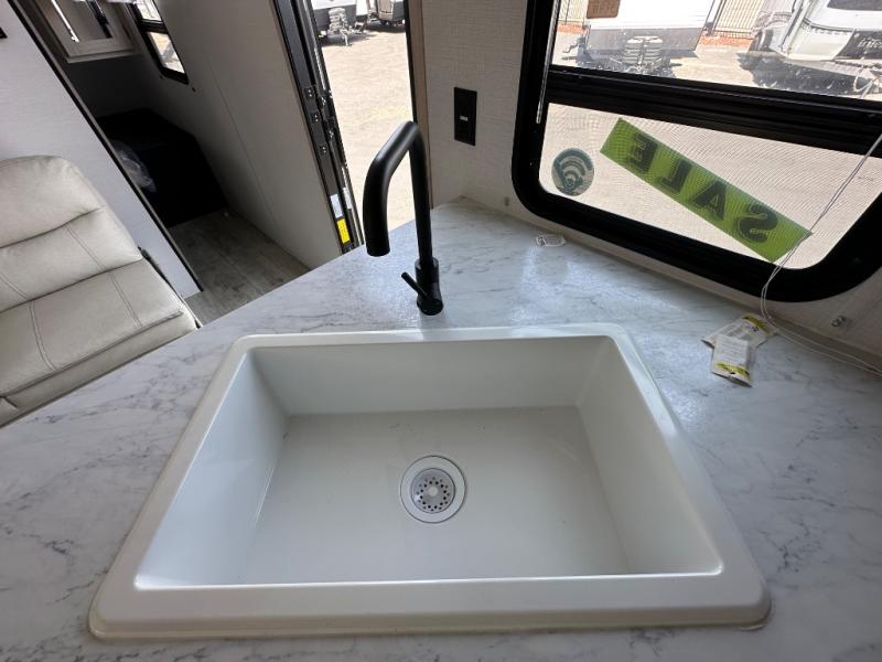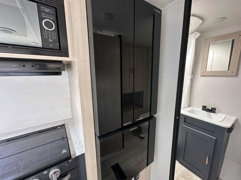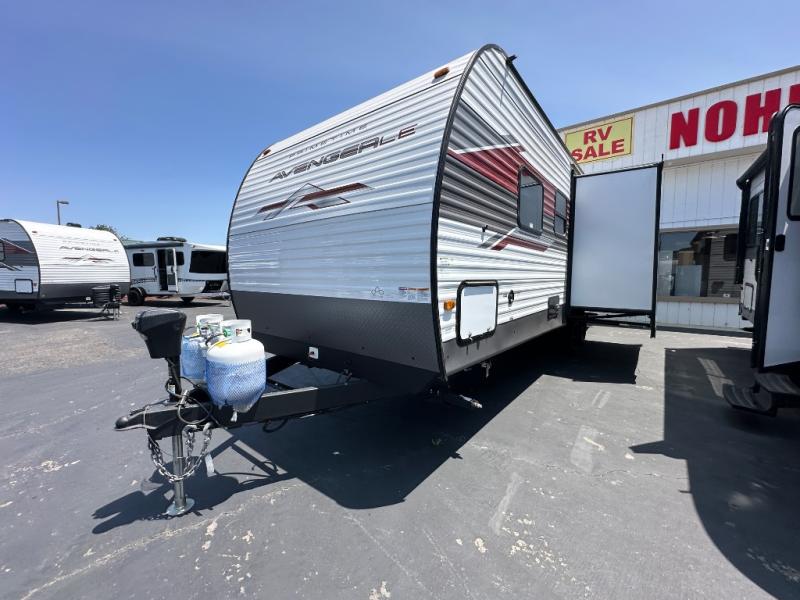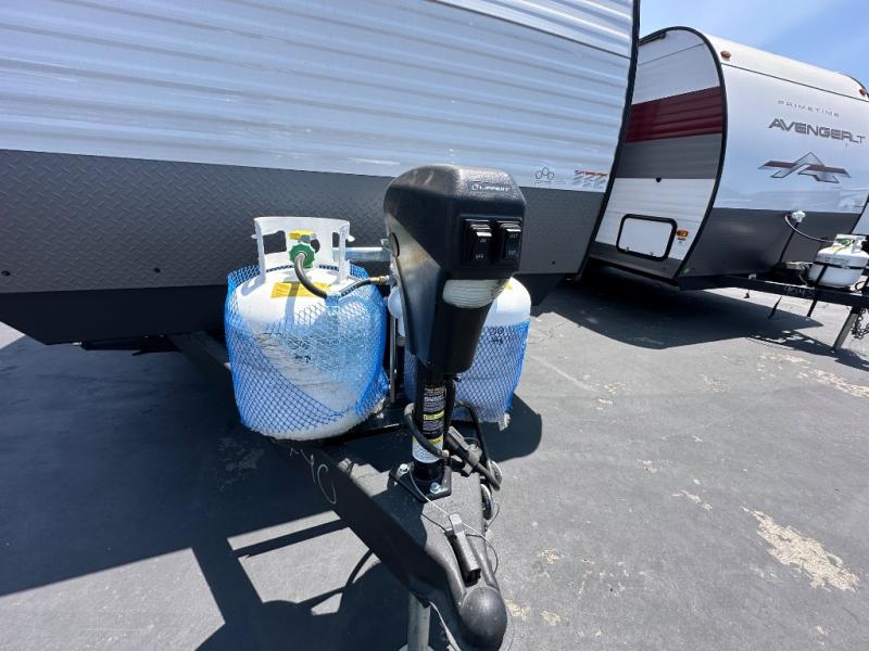 With any Avenger LE travel trailer by Prime Time RV you will enjoy at-home comforts while at the campground! Durable construction begins with an enclosed and heated underbelly, a one-piece roof membrane, and diamond plate front rock guard for added protection against debris during transport. There are also locking magnetic latches on the baggage doors, fully vented windows throughout, four stabilizer jacks, plus solar prep if you want the option to go off-grid. The interior will have you feeling right at home with residential extended ball bearing drawer glides, seamless Carefree Congoleum flooring, an XL single basin kitchen sink, and shower pans in all models that will make it easy to get in and out of the bath. Some of the convenient appliances and equipment you will appreciate are the 15,000 BTU A/C, 12V high-capacity water pump, Slim Profile range hood, and the Winegard 360+ antenna with Wi-Fi prep!