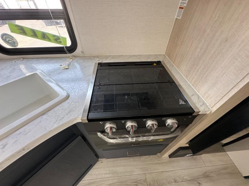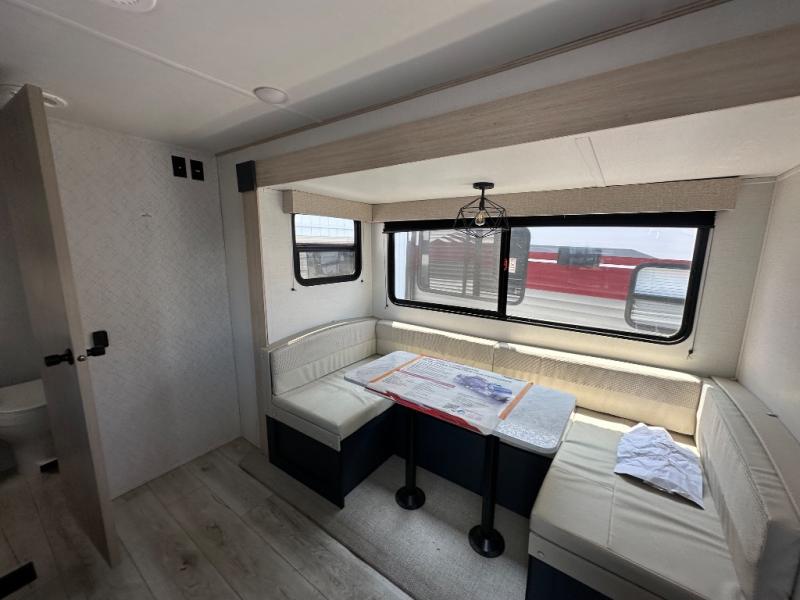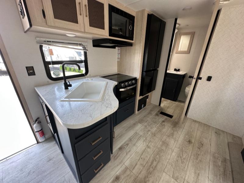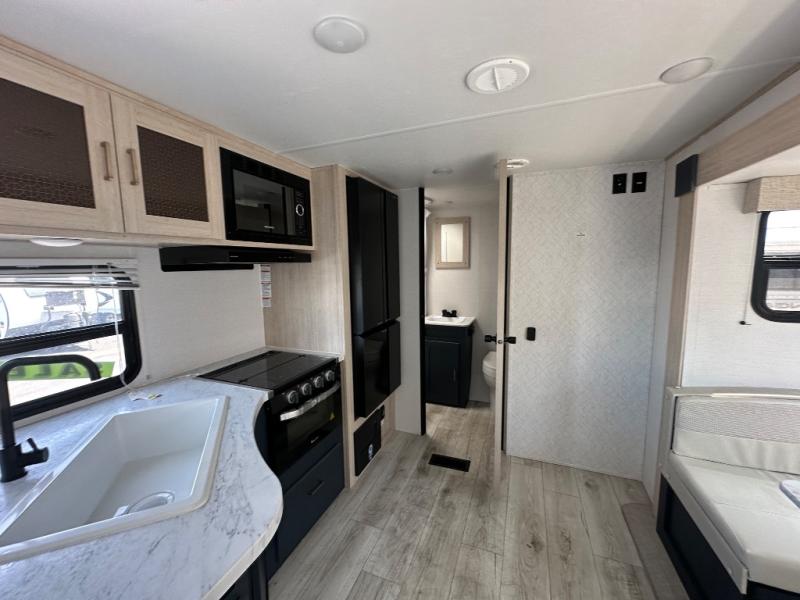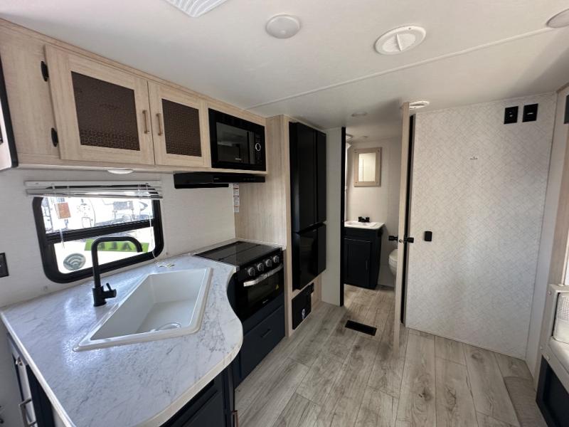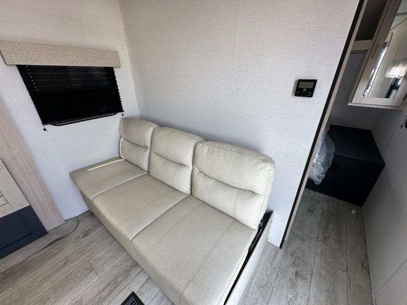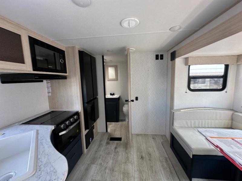 This rear bath travel trailer offers privacy to change and get cleaned up as well as linen storage so you will have everything you need in one place. The walk-around queen bed in the private bedroom, plus the furniture which folds down into extra sleeping space at night allows five or six to sleep comfortably after hiking or relaxing and enjoying the outdoors. The cook will appreciate the three-burner range to make snacks and meals to eat at the U-shaped dinette slide or outside under the 15' power awning that creates a covered outdoor living area protected from the elements.