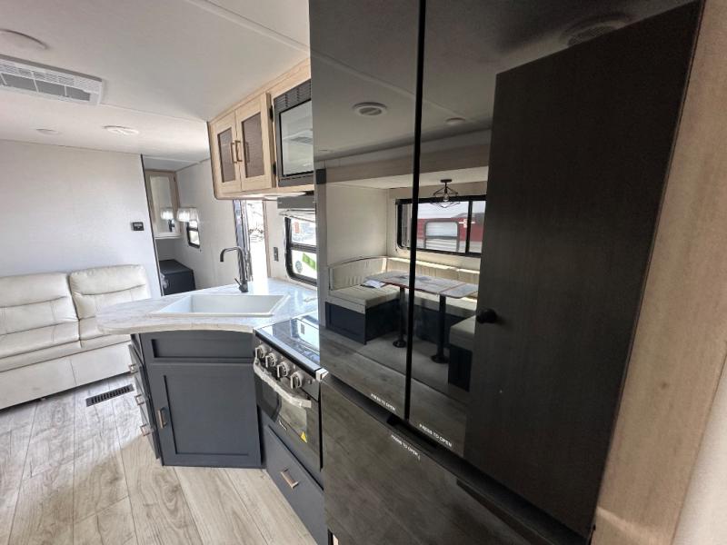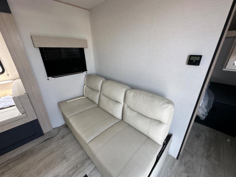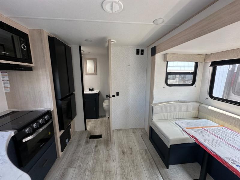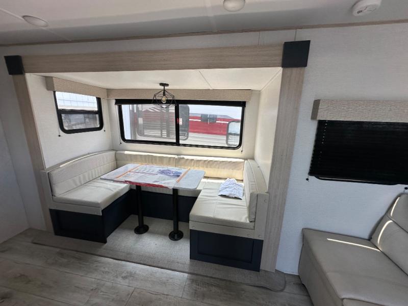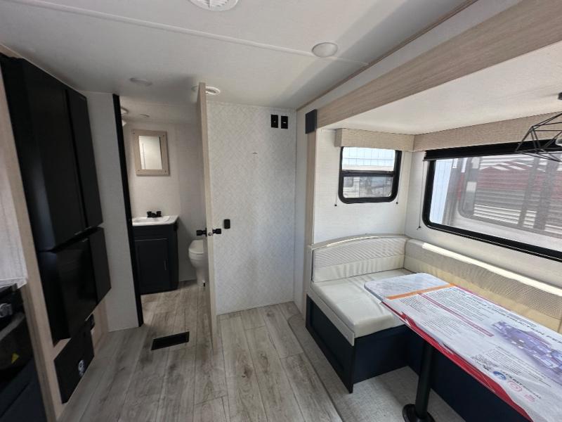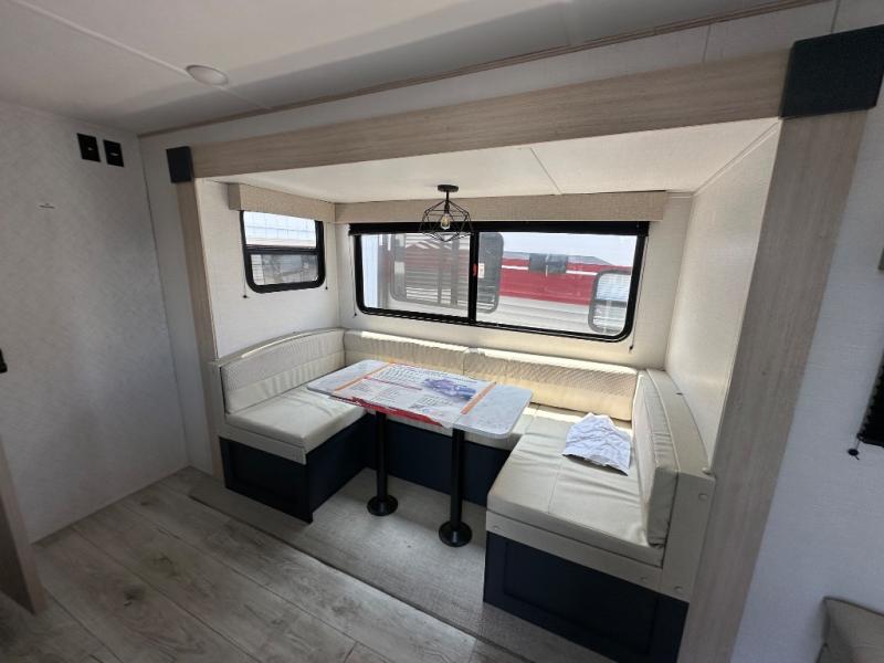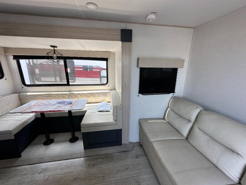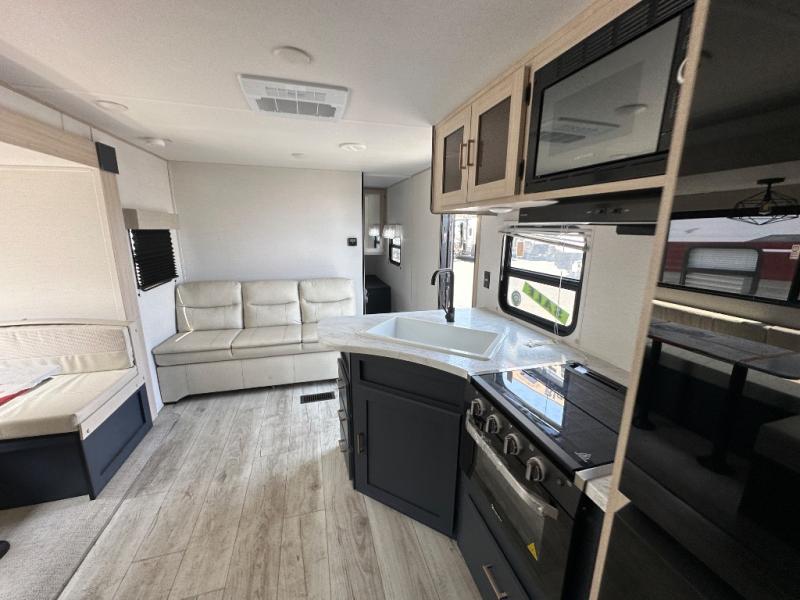 This rear bath travel trailer offers privacy to change and get cleaned up as well as linen storage so you will have everything you need in one place. The walk-around queen bed in the private bedroom, plus the furniture which folds down into extra sleeping space at night allows five or six to sleep comfortably after hiking or relaxing and enjoying the outdoors. The cook will appreciate the three-burner range to make snacks and meals to eat at the U-shaped dinette slide or outside under the 15' power awning that creates a covered outdoor living area protected from the elements.