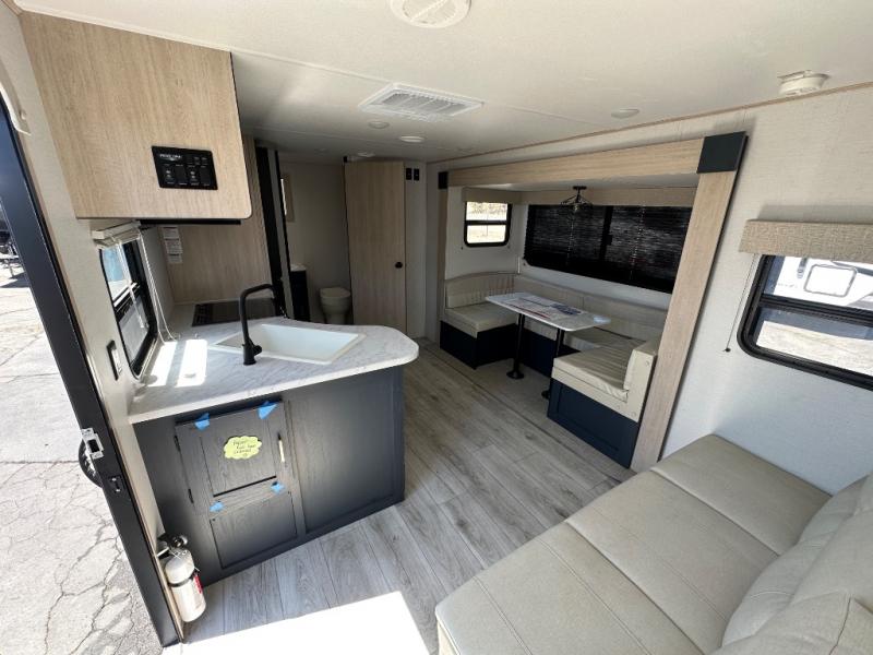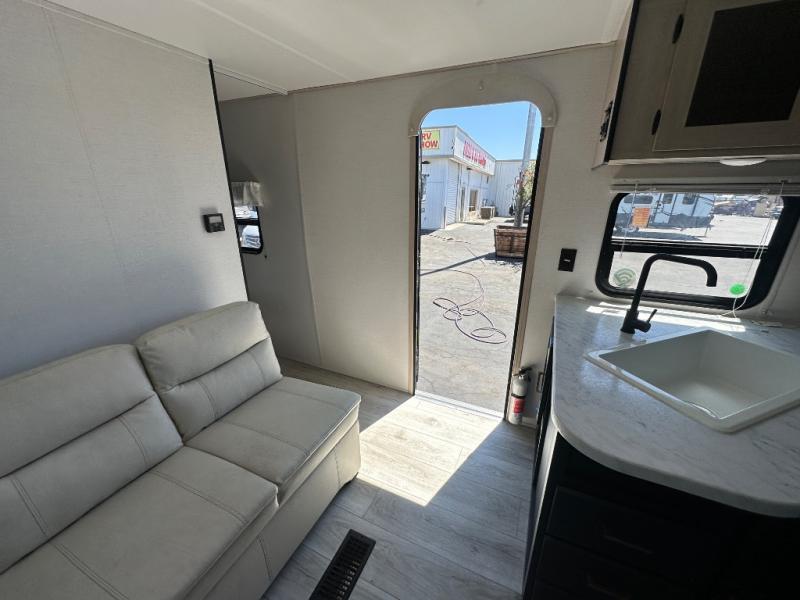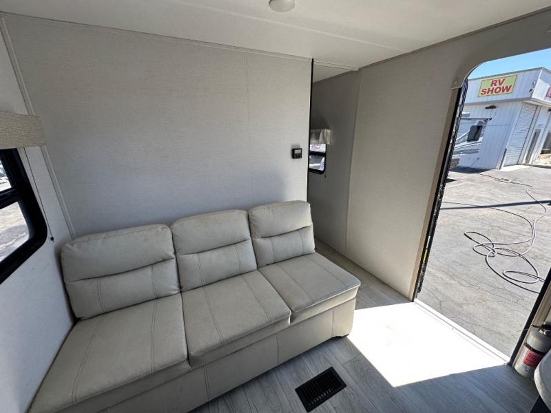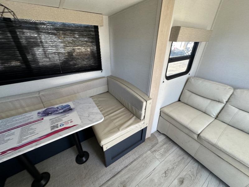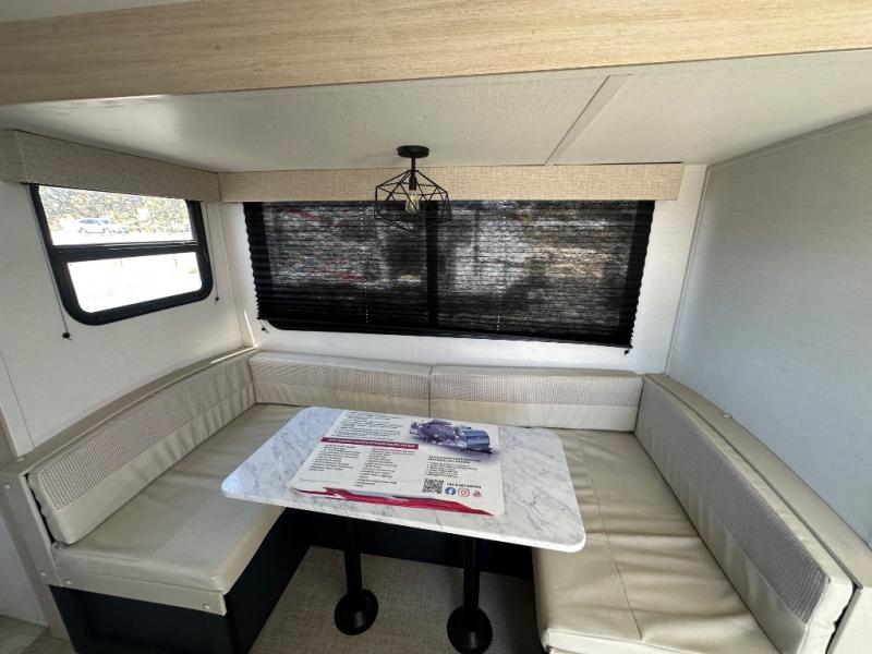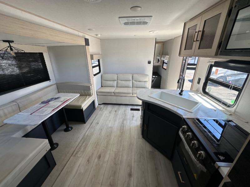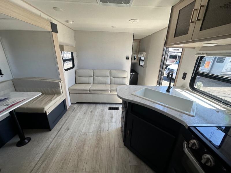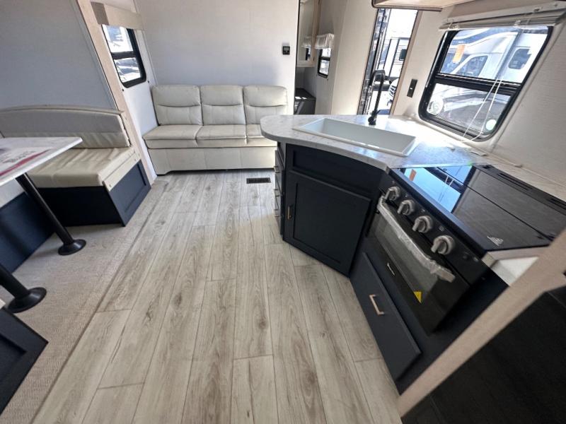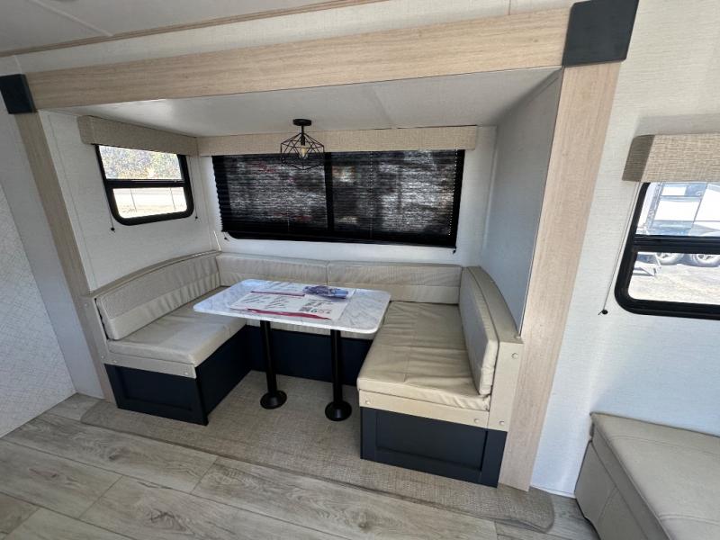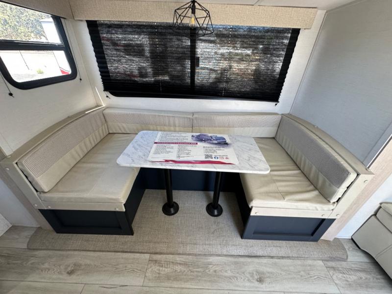 This rear bath travel trailer offers privacy to change and get cleaned up as well as linen storage so you will have everything you need in one place. The walk-around queen bed in the private bedroom, plus the furniture which folds down into extra sleeping space at night allows five or six to sleep comfortably after hiking or relaxing and enjoying the outdoors. The cook will appreciate the three-burner range to make snacks and meals to eat at the U-shaped dinette slide or outside under the 15' power awning that creates a covered outdoor living area protected from the elements.