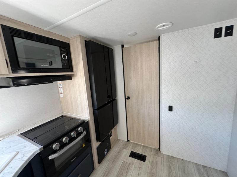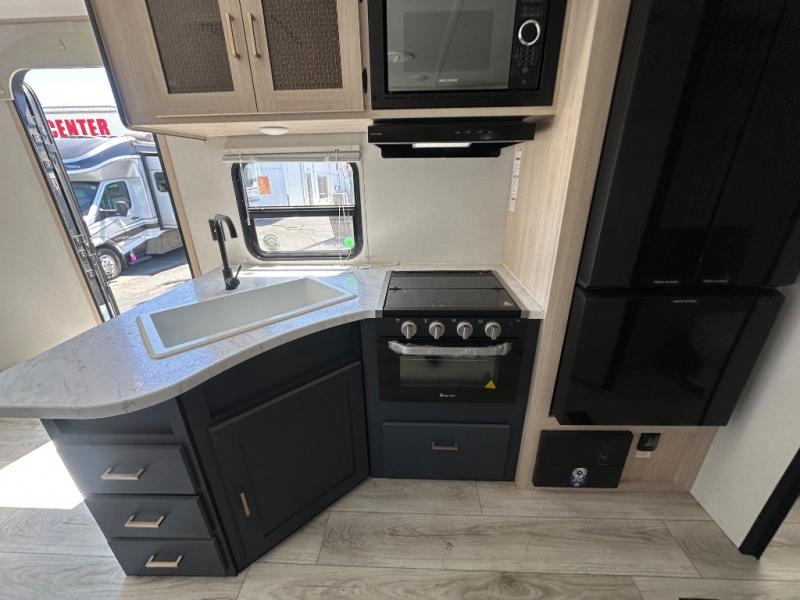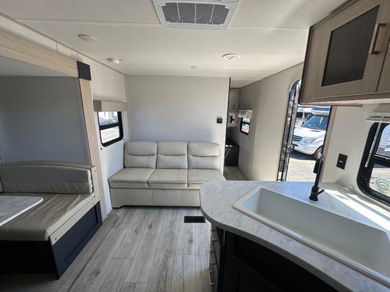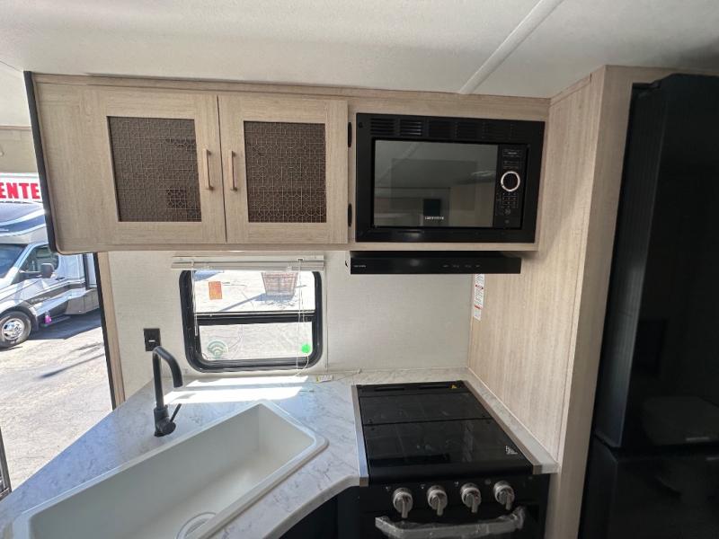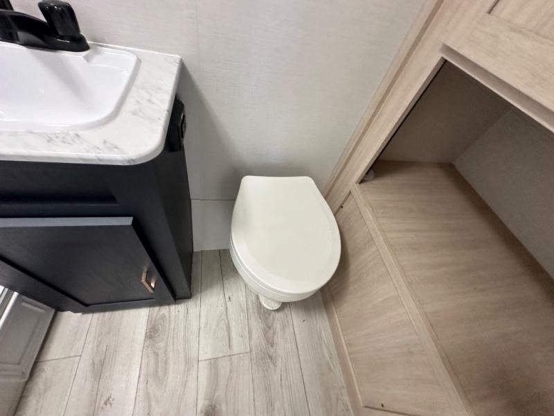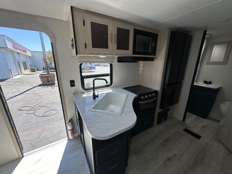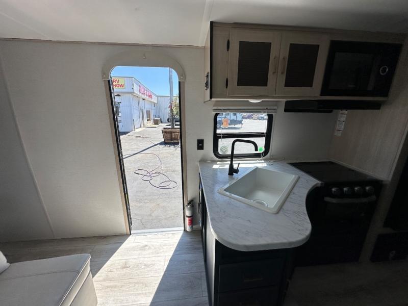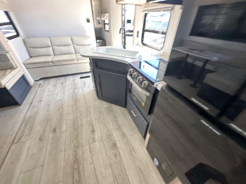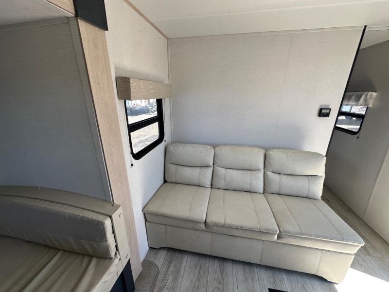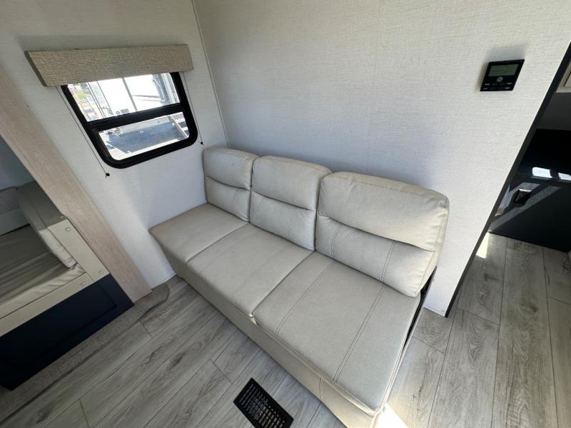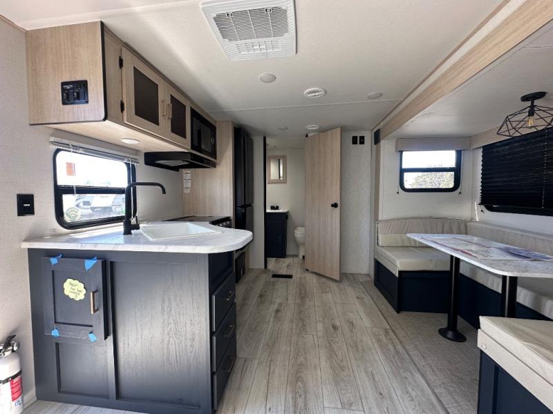 This rear bath travel trailer offers privacy to change and get cleaned up as well as linen storage so you will have everything you need in one place. The walk-around queen bed in the private bedroom, plus the furniture which folds down into extra sleeping space at night allows five or six to sleep comfortably after hiking or relaxing and enjoying the outdoors. The cook will appreciate the three-burner range to make snacks and meals to eat at the U-shaped dinette slide or outside under the 15' power awning that creates a covered outdoor living area protected from the elements.