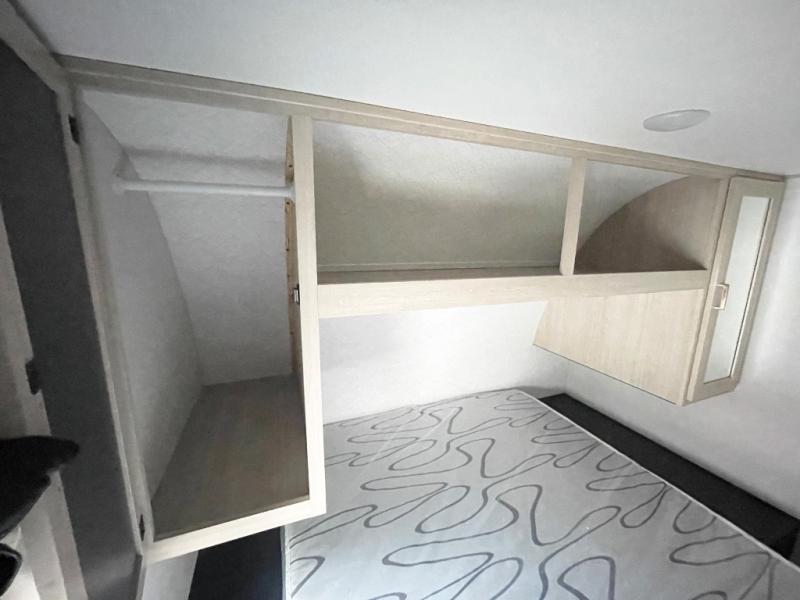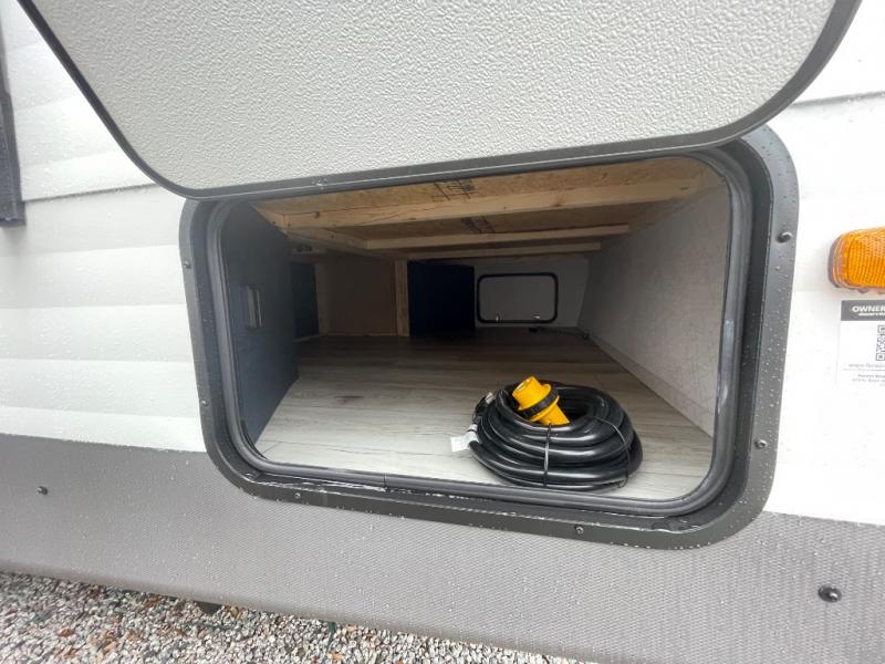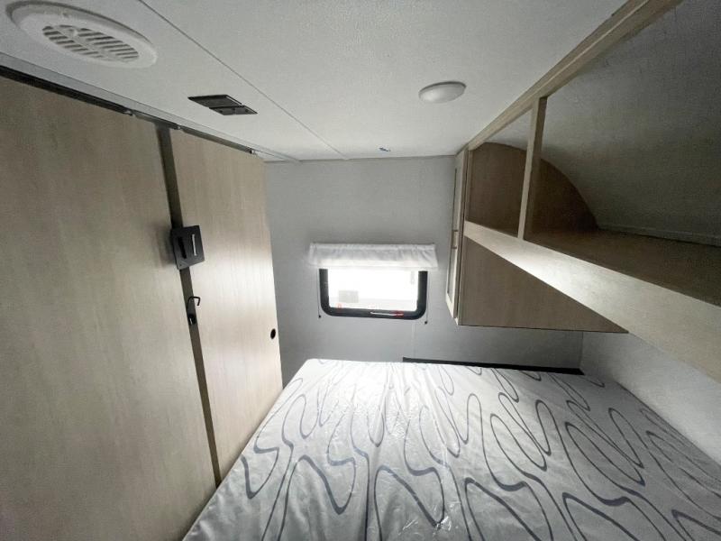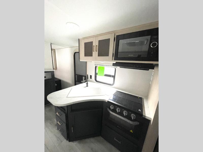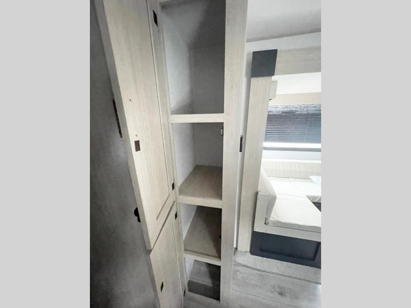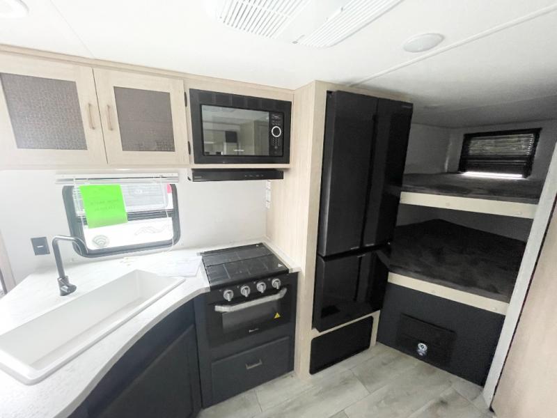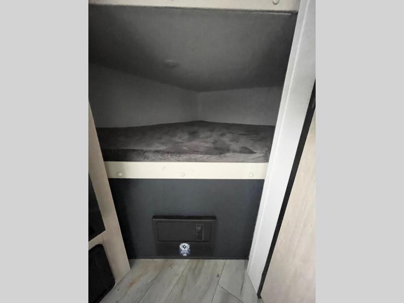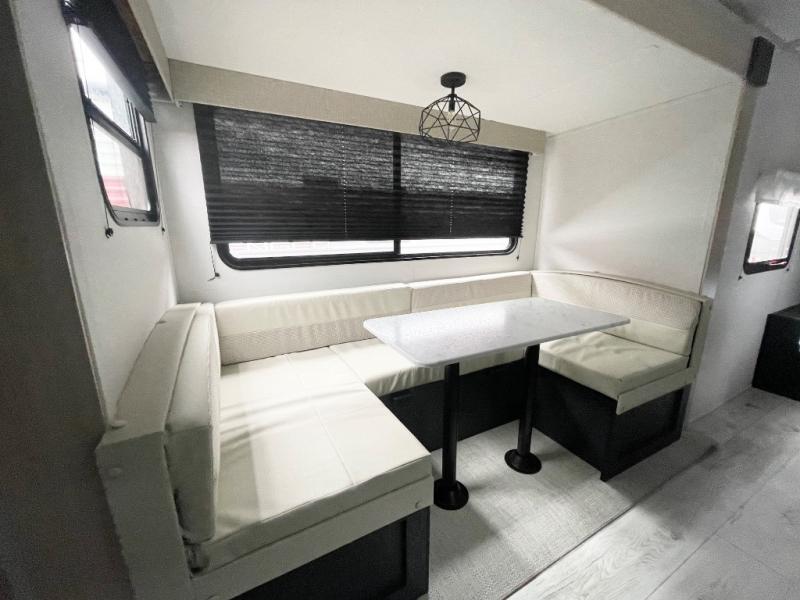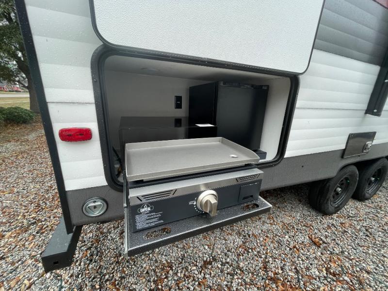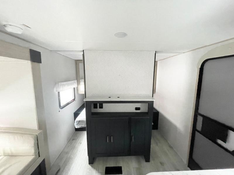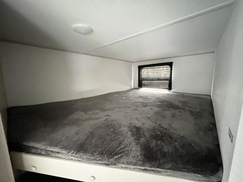 Gather the crew, load up and head out to enjoy a long-weekend at the state park! This trailer offers sleeping accommodations for eight because of the double-size bunks, the U-shaped dinette, and the queen bed. There is a rear corner full bathroom with a medicine cabinet to store personal belongings. You will find full kitchen amenities inside, as well as an outdoor kitchen where you can watch the kids play while making dinner. The single slide provides more living space in the interior, as well as extra sleeping space on the U-shaped dinette.