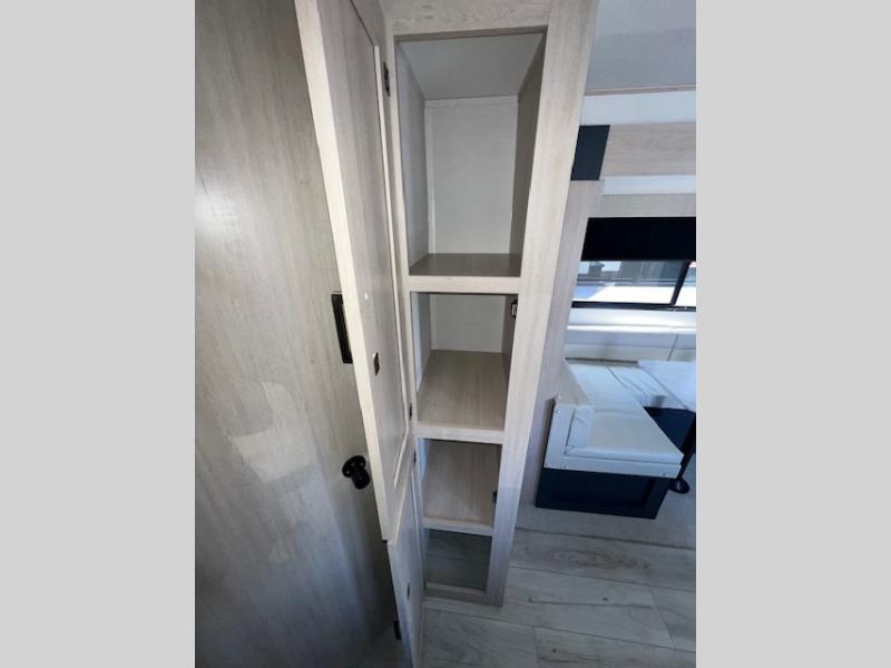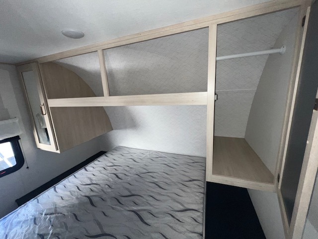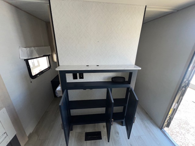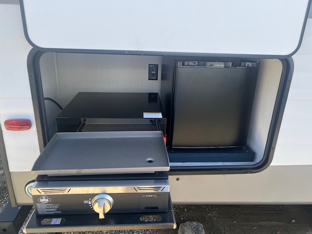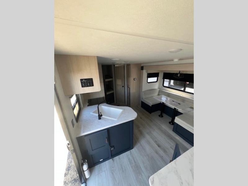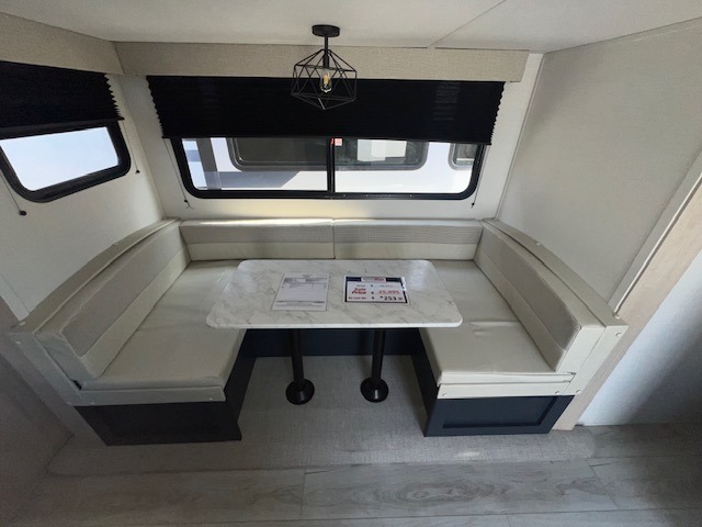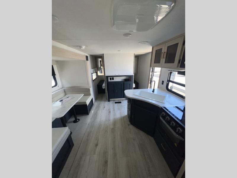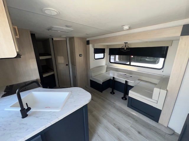 Gather the crew, load up and head out to enjoy a long-weekend at the state park! This trailer offers sleeping accommodations for eight because of the double-size bunks, the U-shaped dinette, and the queen bed. There is a rear corner full bathroom with a medicine cabinet to store personal belongings. You will find full kitchen amenities inside, as well as an outdoor kitchen where you can watch the kids play while making dinner. The single slide provides more living space in the interior, as well as extra sleeping space on the U-shaped dinette.