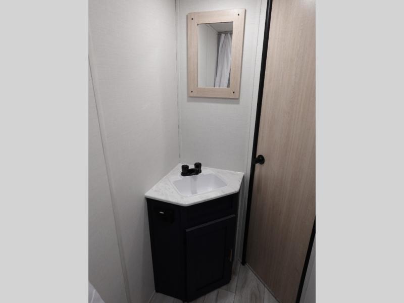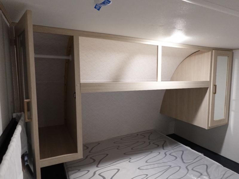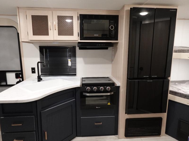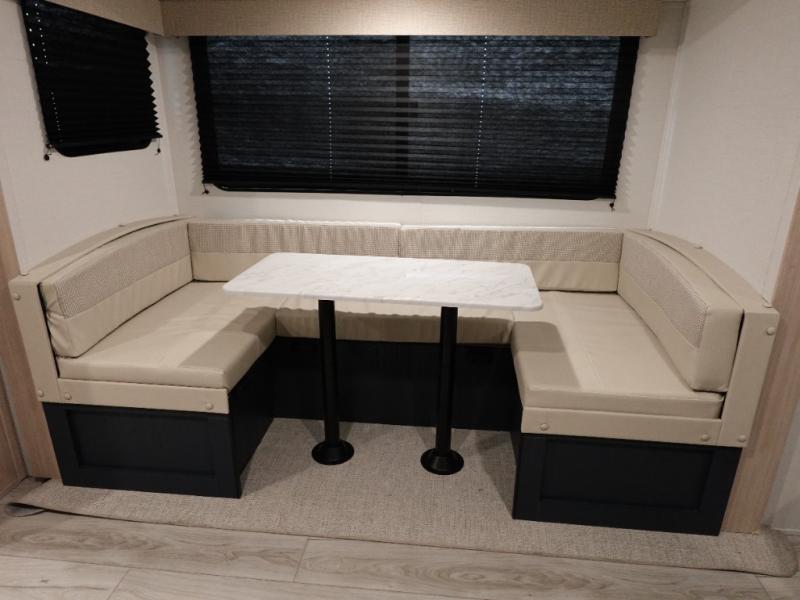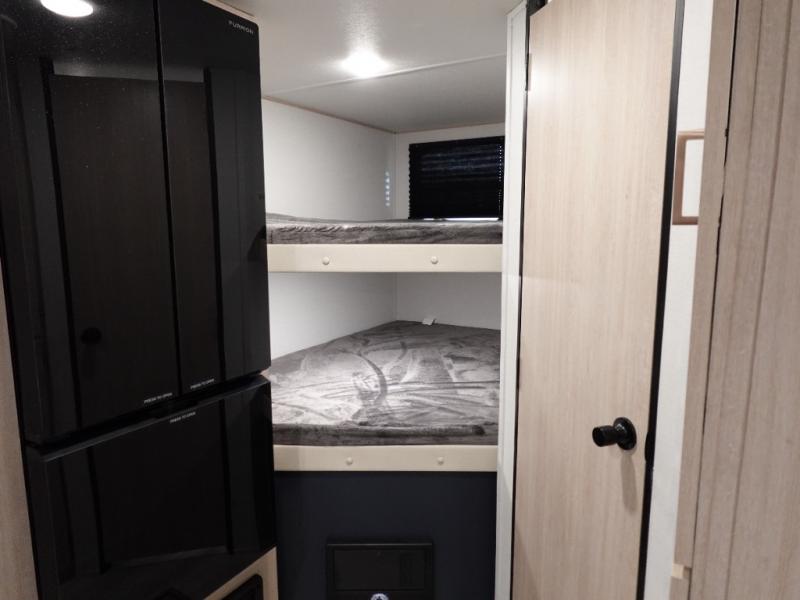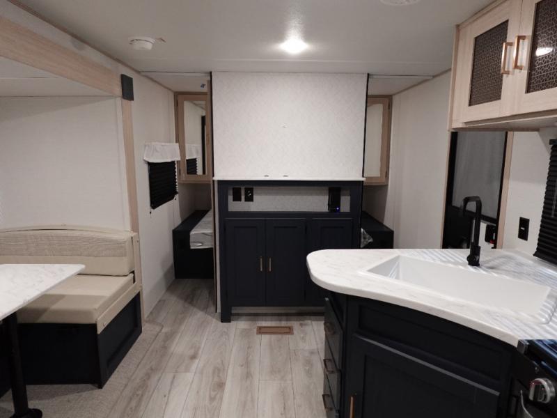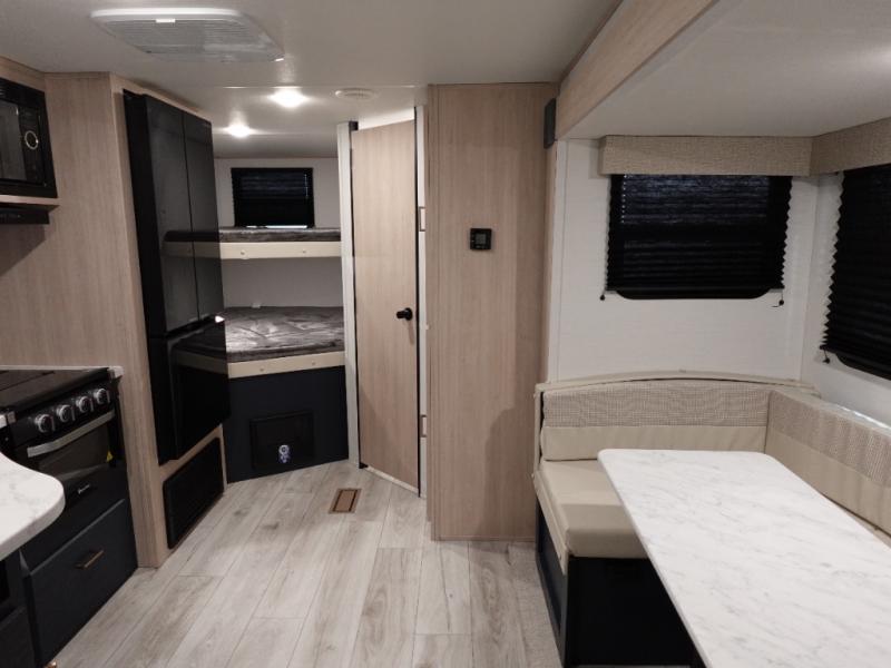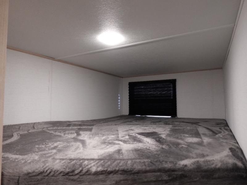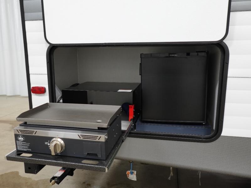 Gather the crew, load up and head out to enjoy a long-weekend at the state park! This trailer offers sleeping accommodations for eight because of the double-size bunks, the U-shaped dinette, and the queen bed. There is a rear corner full bathroom with a medicine cabinet to store personal belongings. You will find full kitchen amenities inside, as well as an outdoor kitchen where you can watch the kids play while making dinner. The single slide provides more living space in the interior, as well as extra sleeping space on the U-shaped dinette.