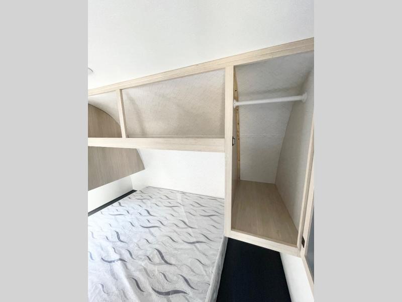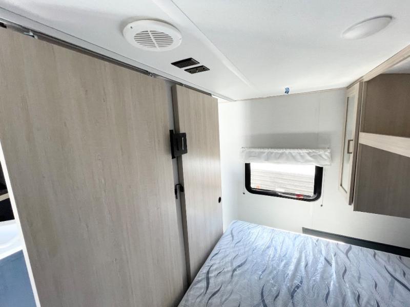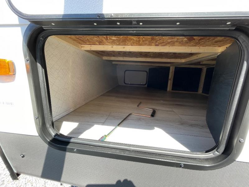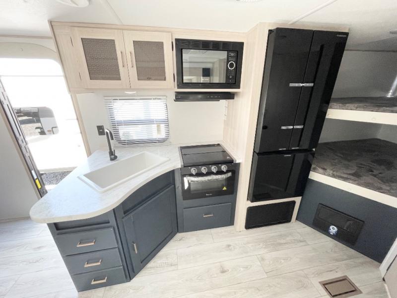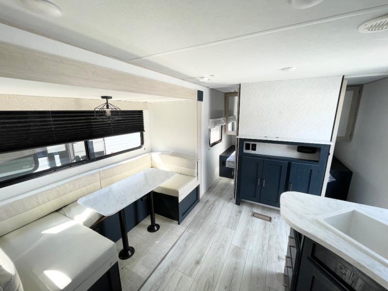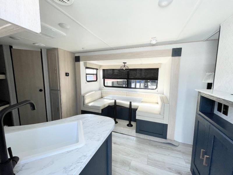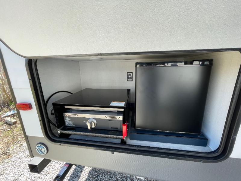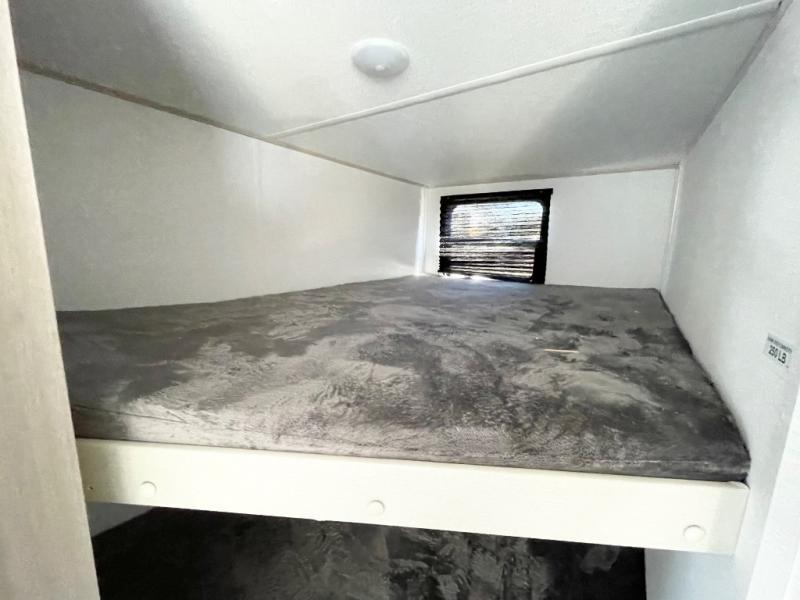 Gather the crew, load up and head out to enjoy a long-weekend at the state park! This trailer offers sleeping accommodations for eight because of the double-size bunks, the U-shaped dinette, and the queen bed. There is a rear corner full bathroom with a medicine cabinet to store personal belongings. You will find full kitchen amenities inside, as well as an outdoor kitchen where you can watch the kids play while making dinner. The single slide provides more living space in the interior, as well as extra sleeping space on the U-shaped dinette.