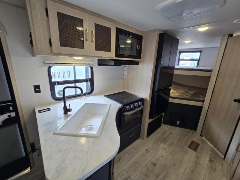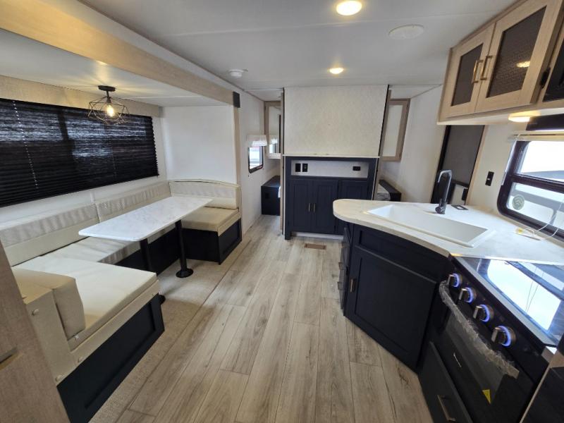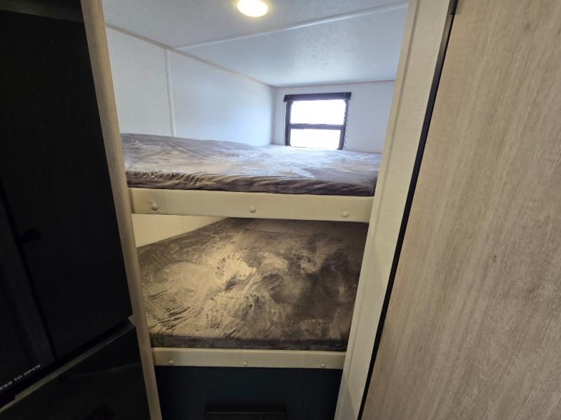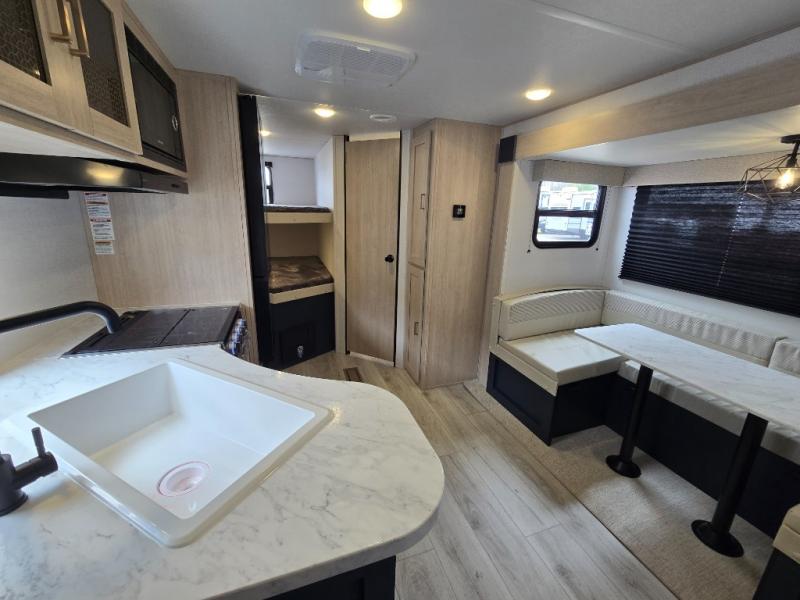 Gather the crew, load up and head out to enjoy a long-weekend at the state park! This trailer offers sleeping accommodations for eight because of the double-size bunks, the U-shaped dinette, and the queen bed. There is a rear corner full bathroom with a medicine cabinet to store personal belongings. You will find full kitchen amenities inside, as well as an outdoor kitchen where you can watch the kids play while making dinner. The single slide provides more living space in the interior, as well as extra sleeping space on the U-shaped dinette.