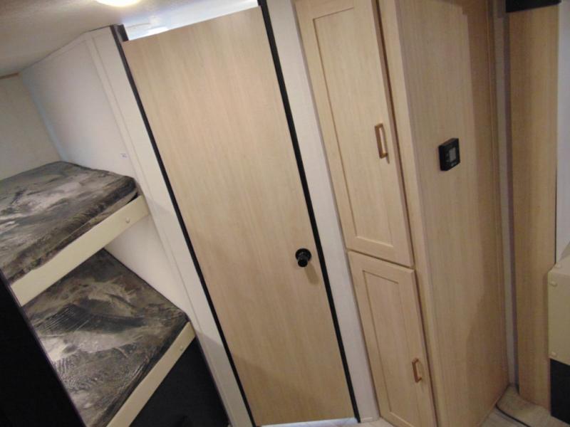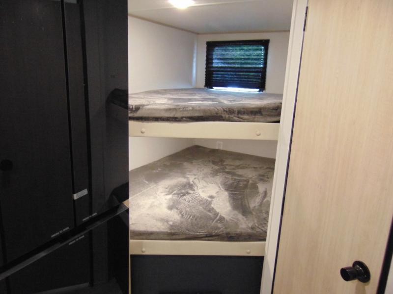 Gather the crew, load up and head out to enjoy a long-weekend at the state park! This trailer offers sleeping accommodations for eight because of the double-size bunks, the U-shaped dinette, and the queen bed. There is a rear corner full bathroom with a medicine cabinet to store personal belongings. You will find full kitchen amenities inside, as well as an outdoor kitchen where you can watch the kids play while making dinner. The single slide provides more living space in the interior, as well as extra sleeping space on the U-shaped dinette.