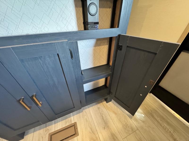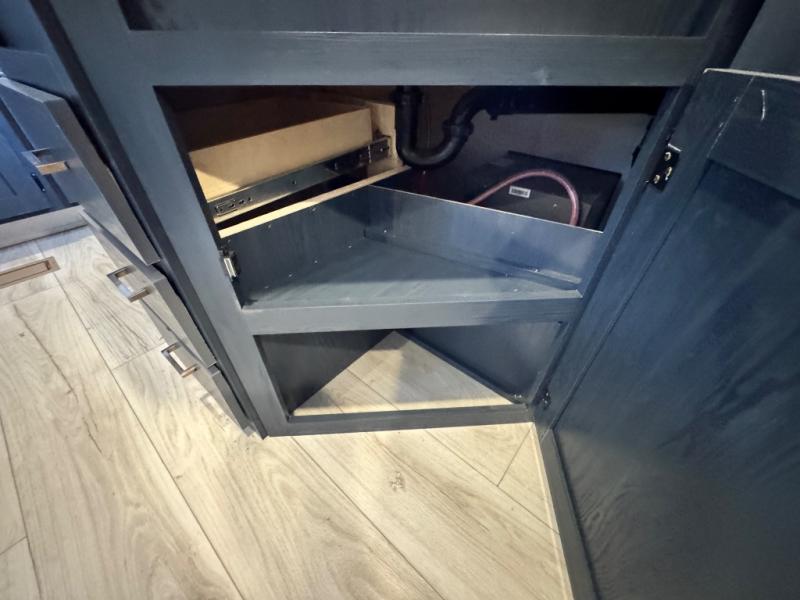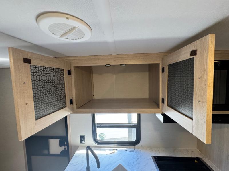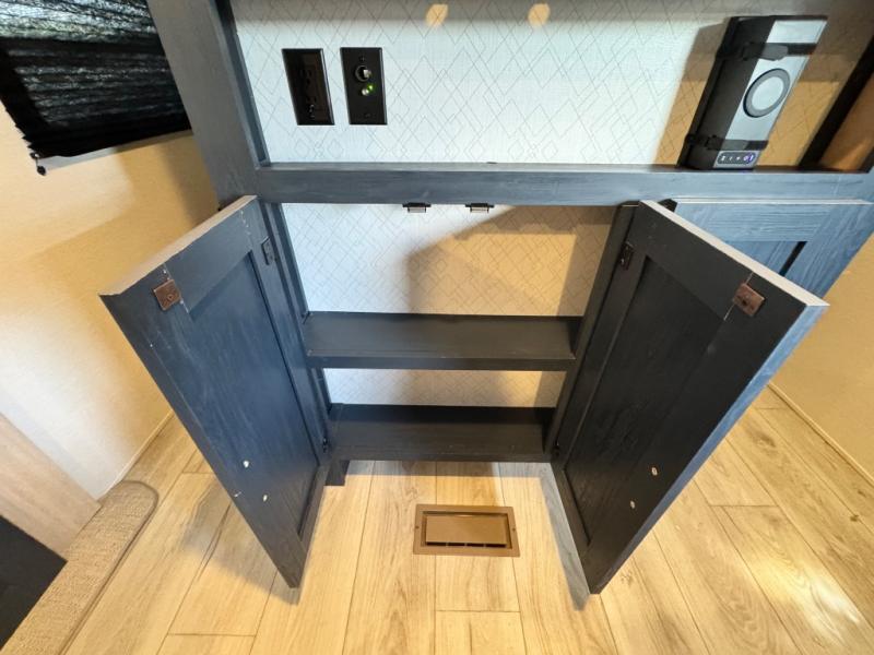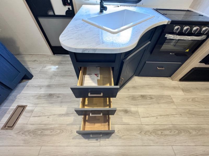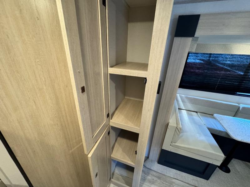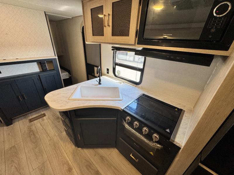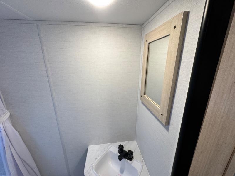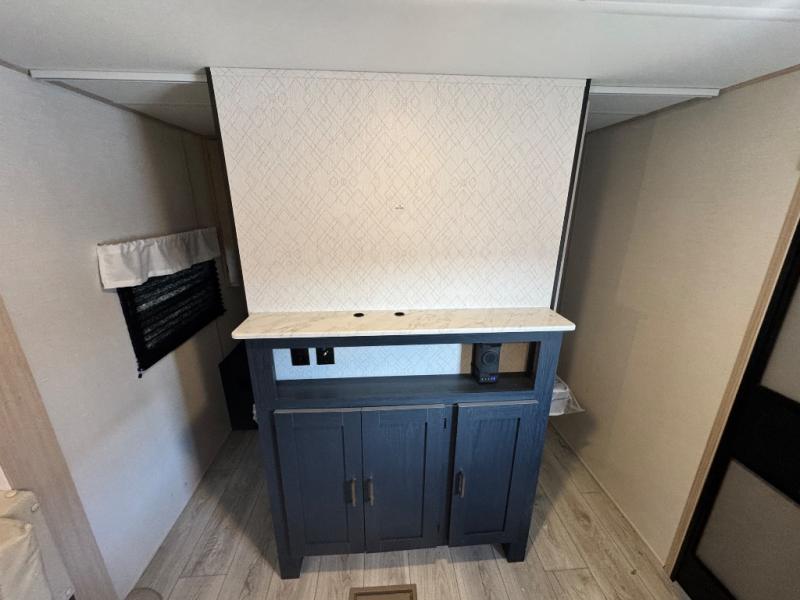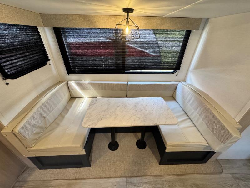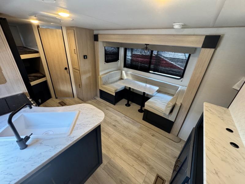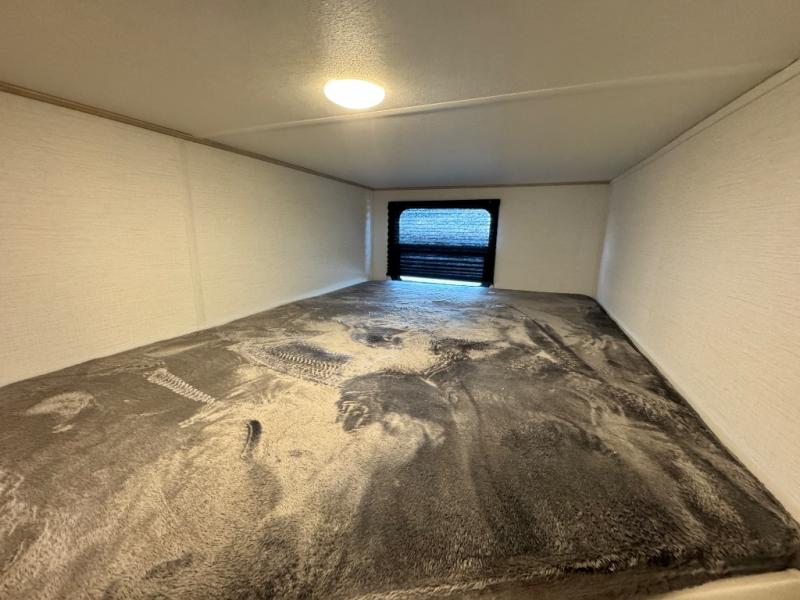 Gather the crew, load up and head out to enjoy a long-weekend at the state park! This trailer offers sleeping accommodations for eight because of the double-size bunks, the U-shaped dinette, and the queen bed. There is a rear corner full bathroom with a medicine cabinet to store personal belongings. You will find full kitchen amenities inside, as well as an outdoor kitchen where you can watch the kids play while making dinner. The single slide provides more living space in the interior, as well as extra sleeping space on the U-shaped dinette.