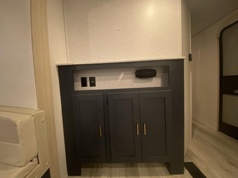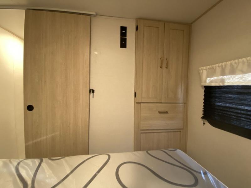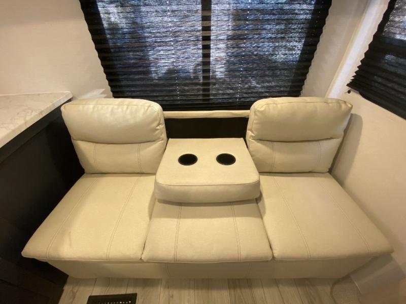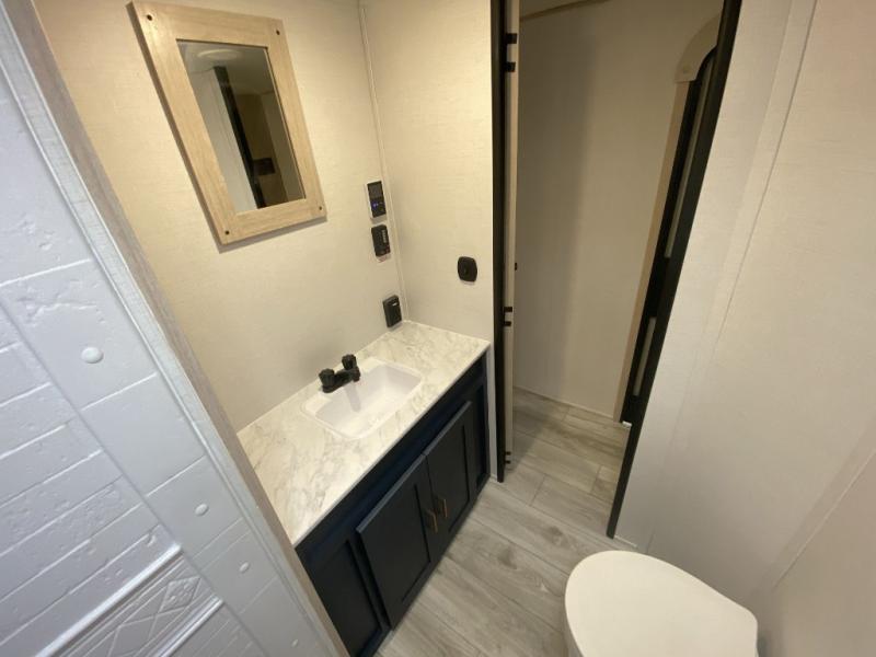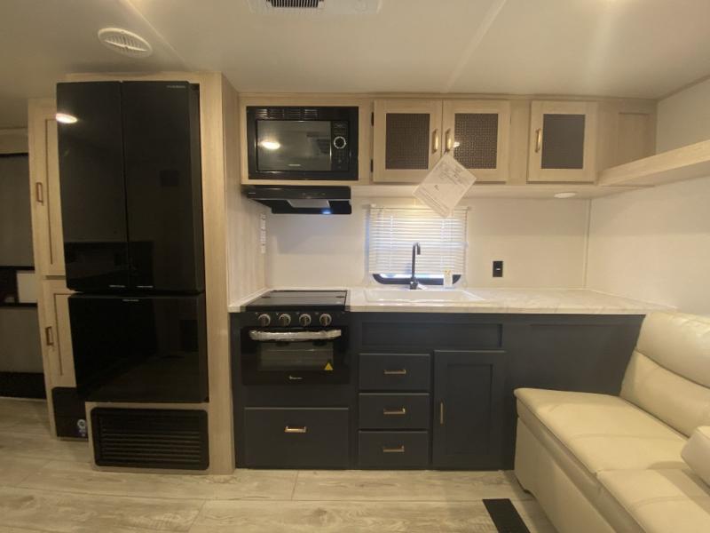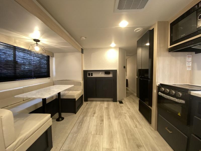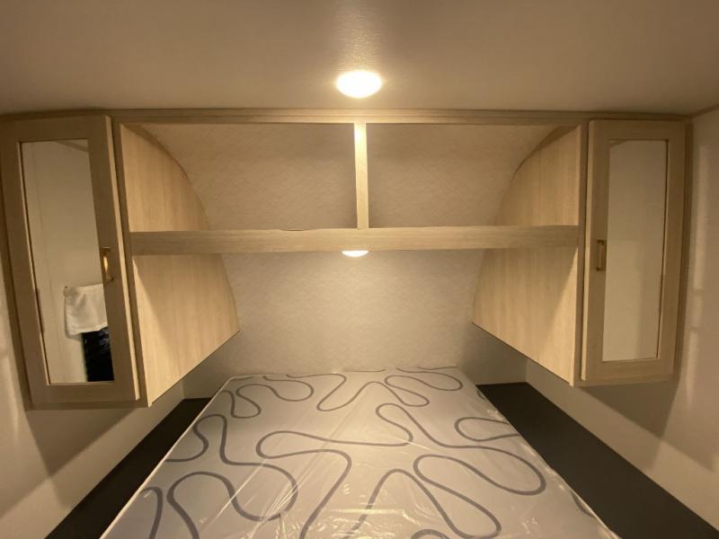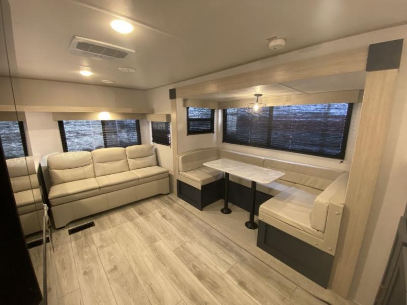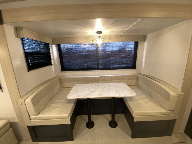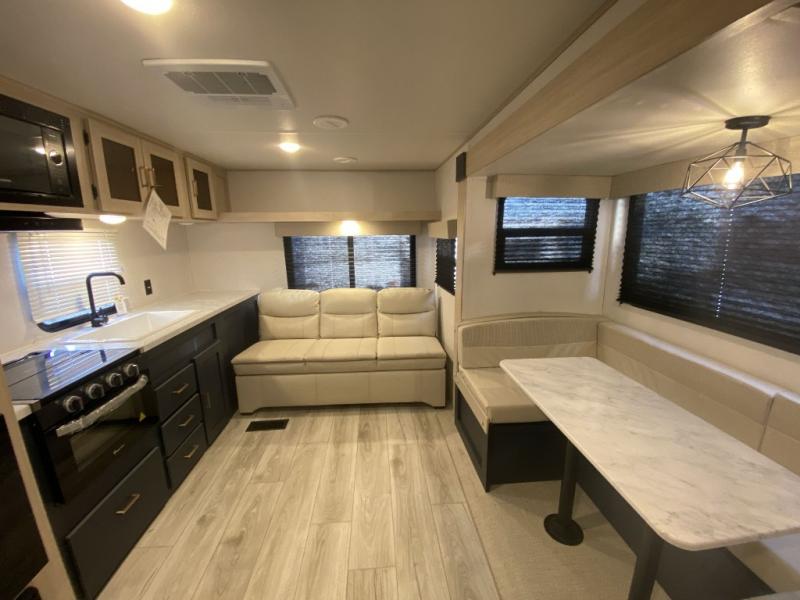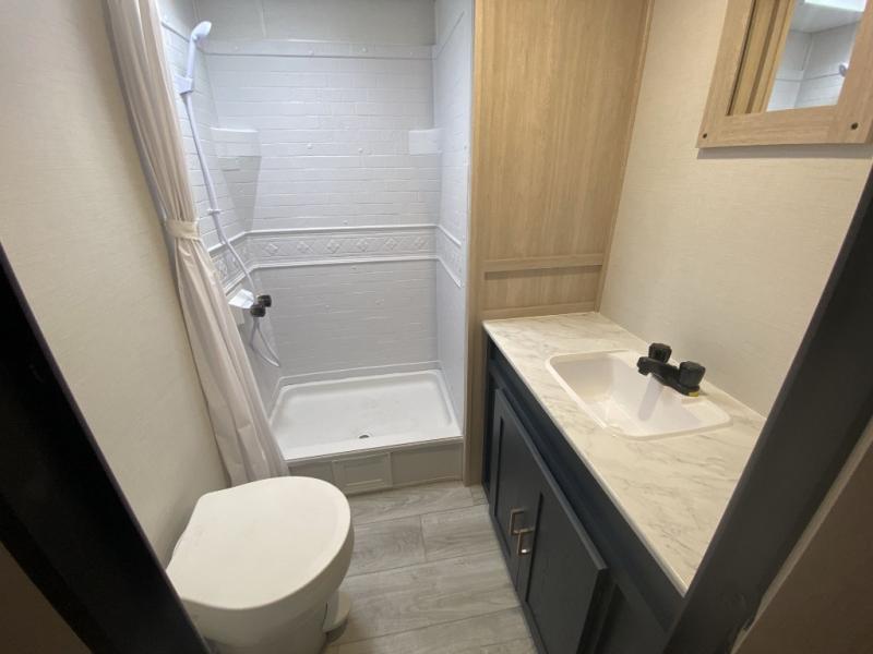 Relax indoors at your campsite in this spacious rear living area trailer that offers a U-shaped dinette slide and a rear sofa. This combined living and kitchen area also offers the cook counter space, a deep basin sink, and full amenities to whip up a meal while everyone enjoys the entertainment center. There is a full bathroom with easy access from this area as well as the entry. And the front private bedroom offers a queen bed and three wardrobes to hold your belongings.