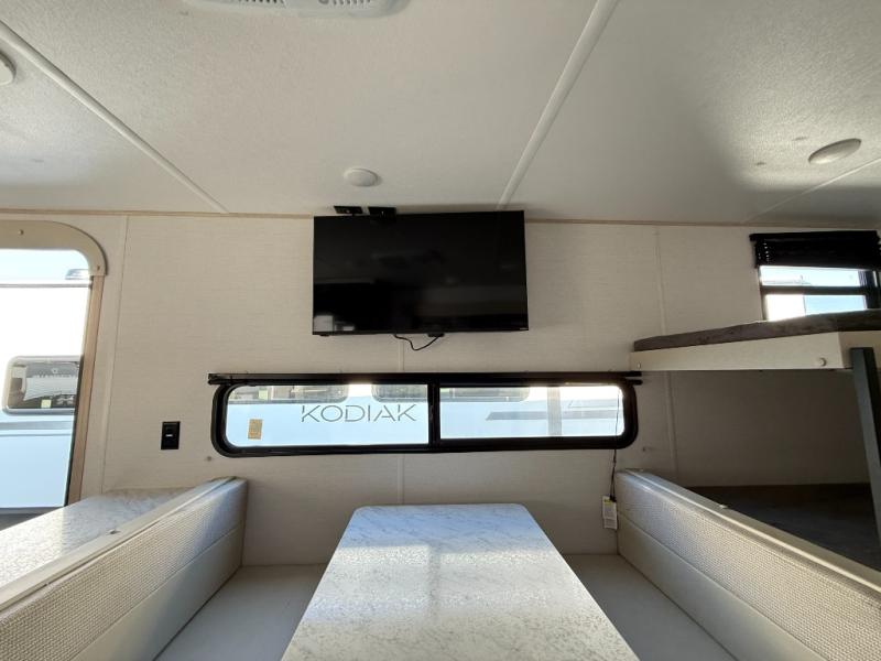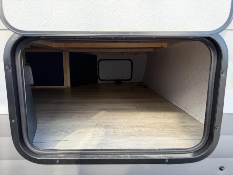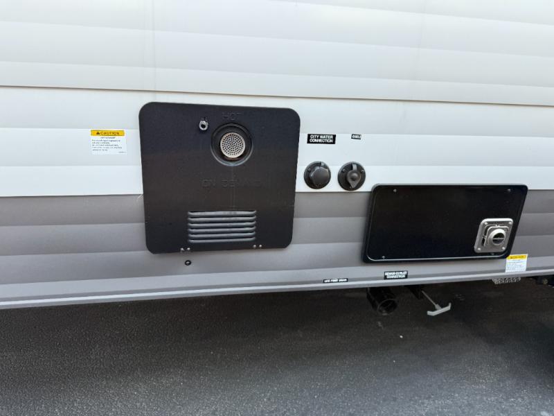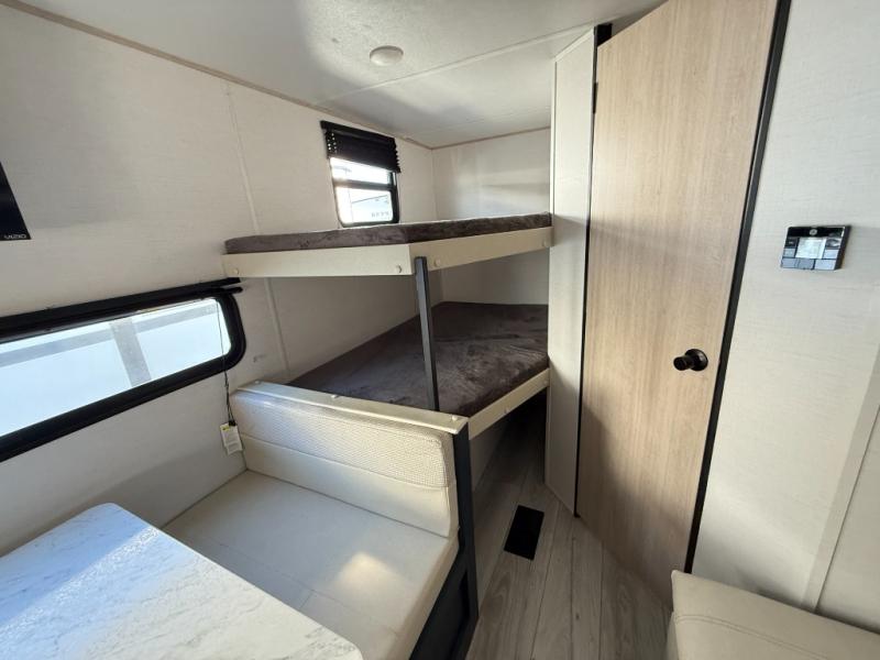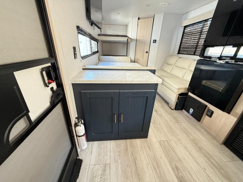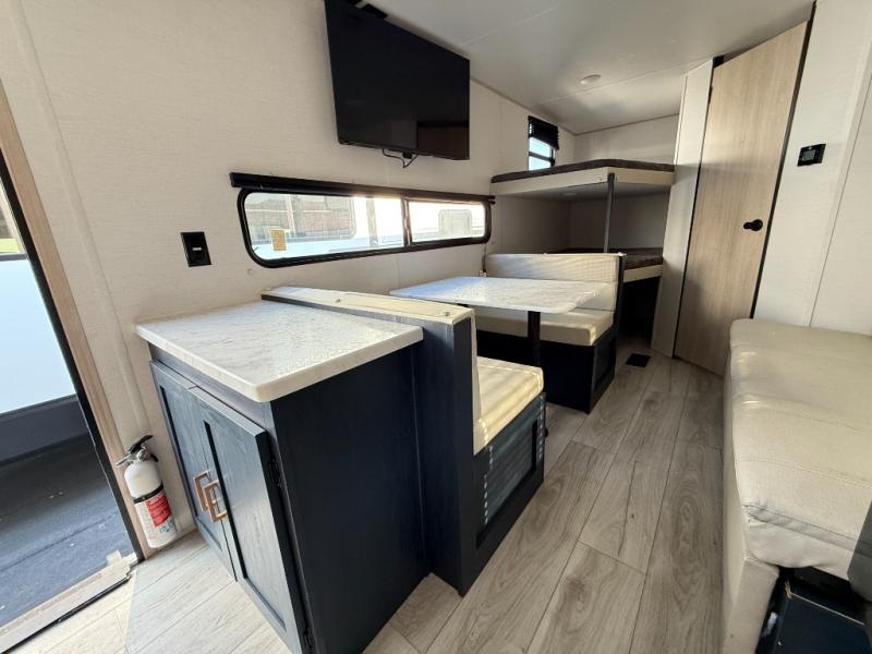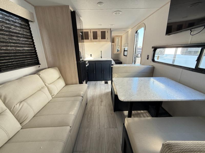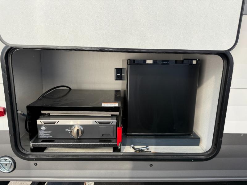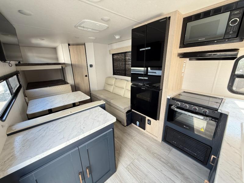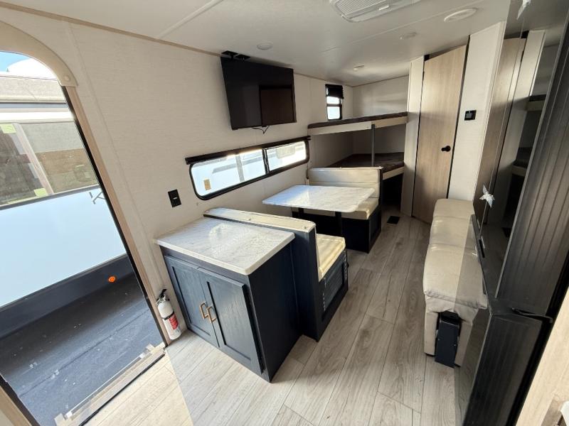 The whole family can go camping in this travel trailer! This trailer offers sleeping accommodations for up to eight because of the double-size bunk beds, the booth dinette, the sofa and the queen bed. There is a rear corner full bathroom with a medicine cabinet to store personal belongings. You will find full kitchen amenities inside, as well as an outdoor kitchen where you can watch the kids play while making dinner. The front private bedroom offers a place to retreat and relax after a fun day of playing at the beach!