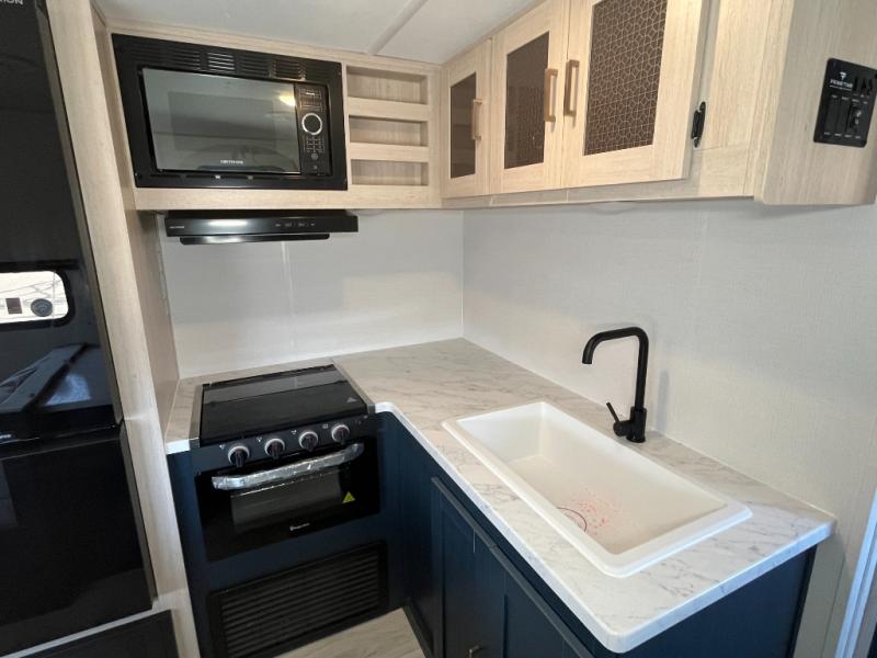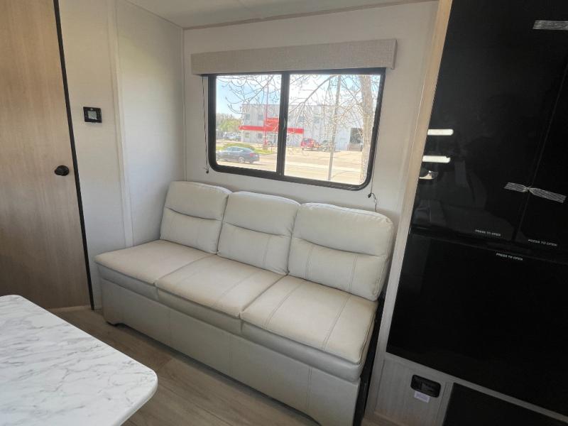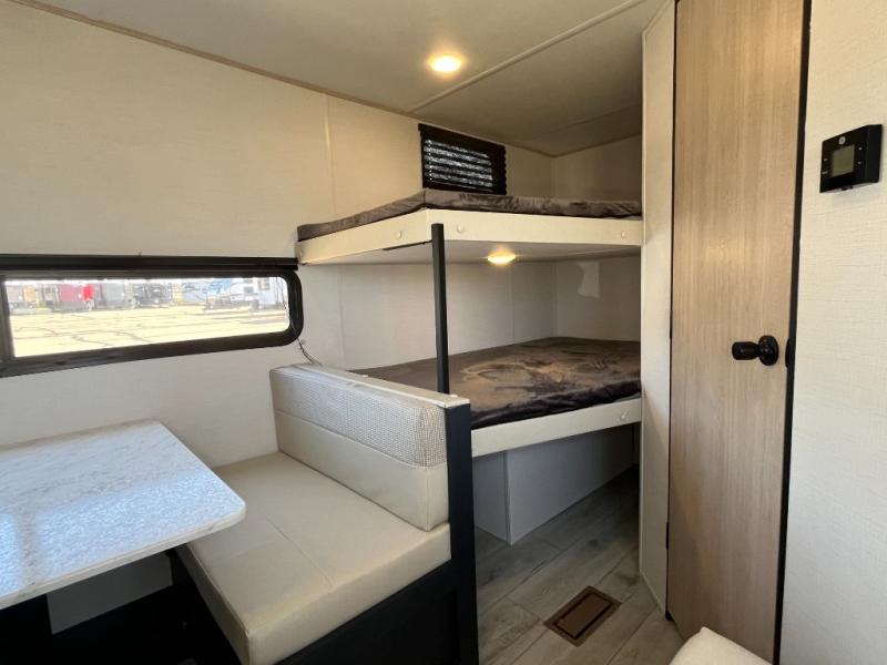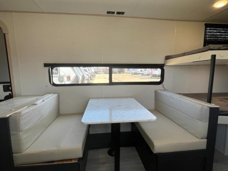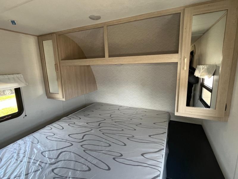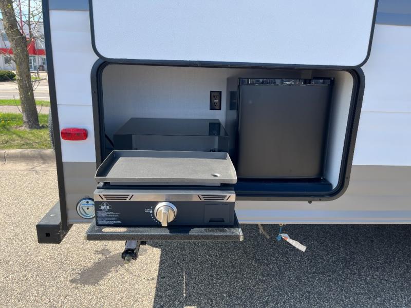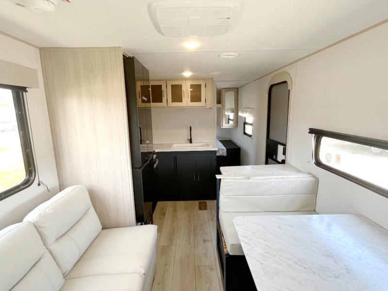 The whole family can go camping in this travel trailer! This trailer offers sleeping accommodations for up to eight because of the double-size bunk beds, the booth dinette, the sofa and the queen bed. There is a rear corner full bathroom with a medicine cabinet to store personal belongings. You will find full kitchen amenities inside, as well as an outdoor kitchen where you can watch the kids play while making dinner. The front private bedroom offers a place to retreat and relax after a fun day of playing at the beach!