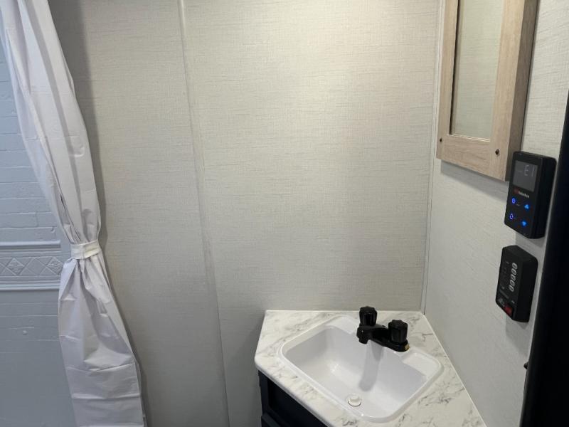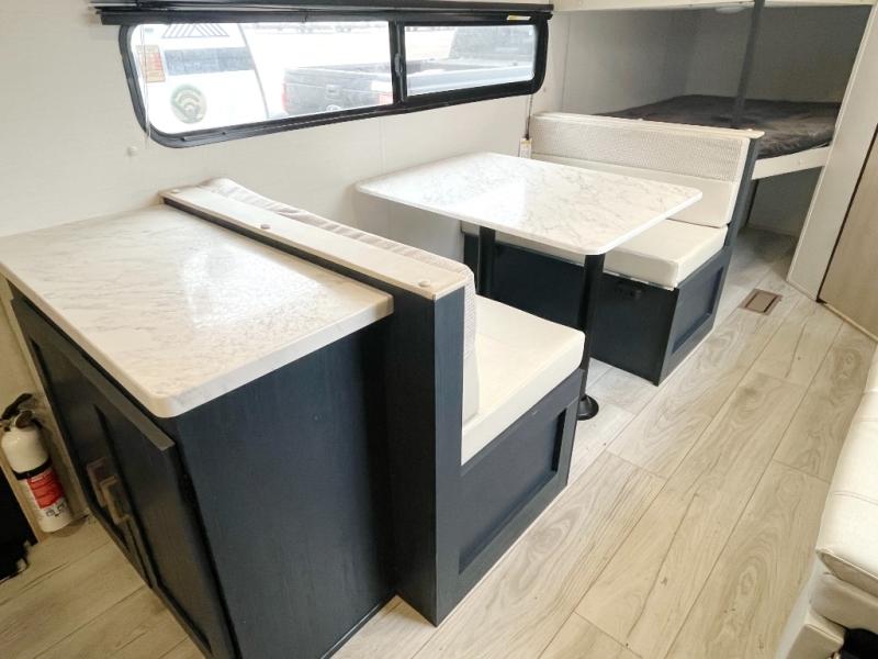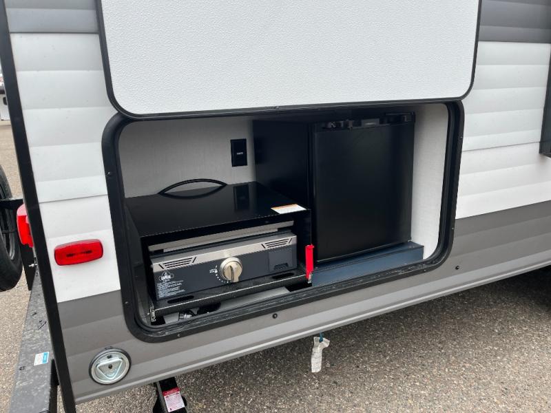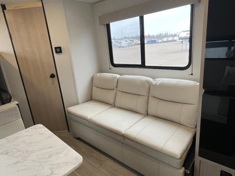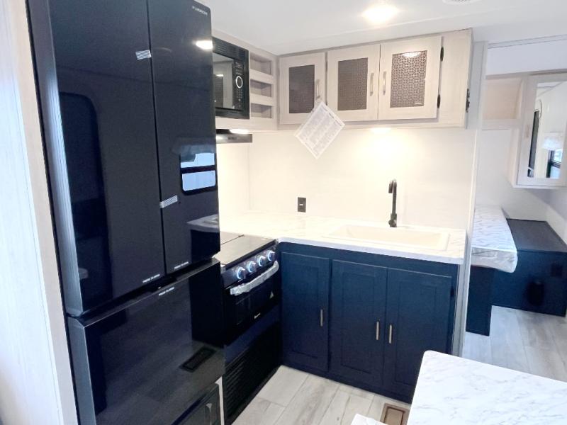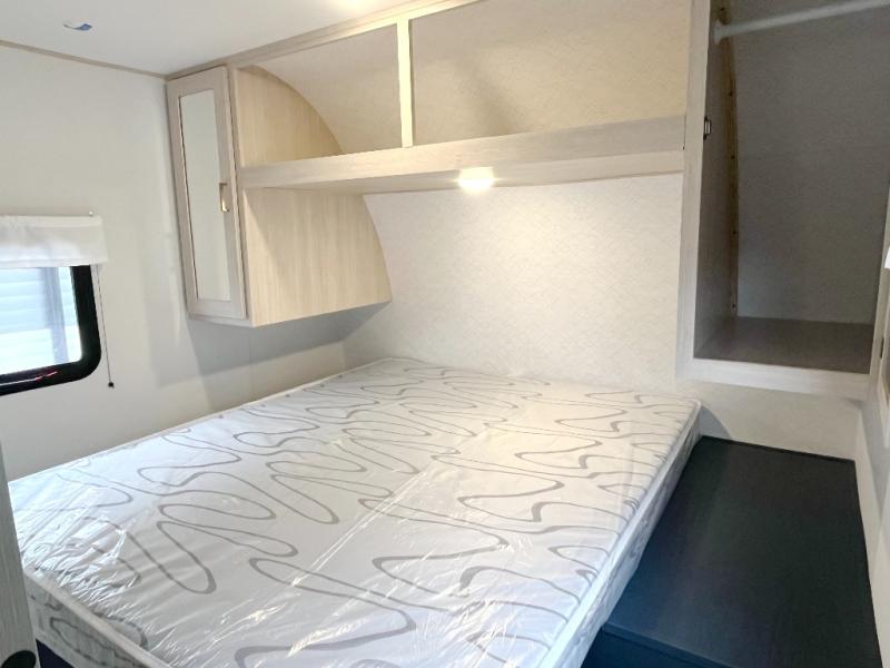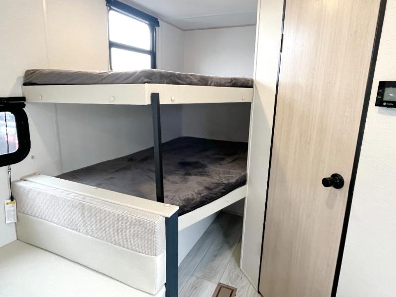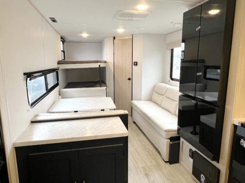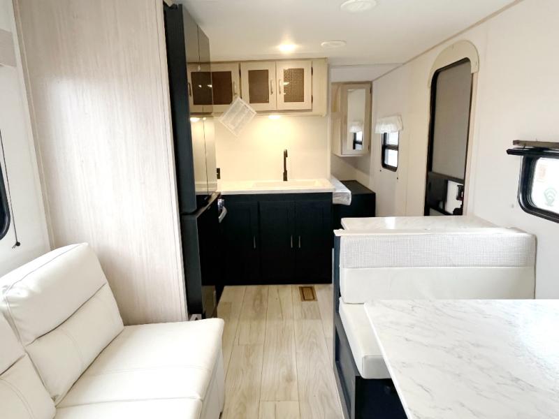 The whole family can go camping in this travel trailer! This trailer offers sleeping accommodations for up to eight because of the double-size bunk beds, the booth dinette, the sofa and the queen bed. There is a rear corner full bathroom with a medicine cabinet to store personal belongings. You will find full kitchen amenities inside, as well as an outdoor kitchen where you can watch the kids play while making dinner. The front private bedroom offers a place to retreat and relax after a fun day of playing at the beach!