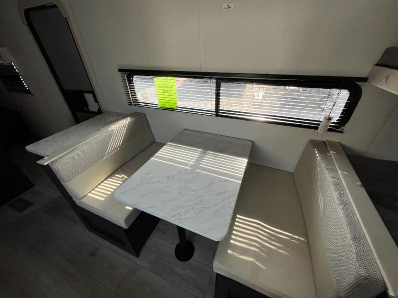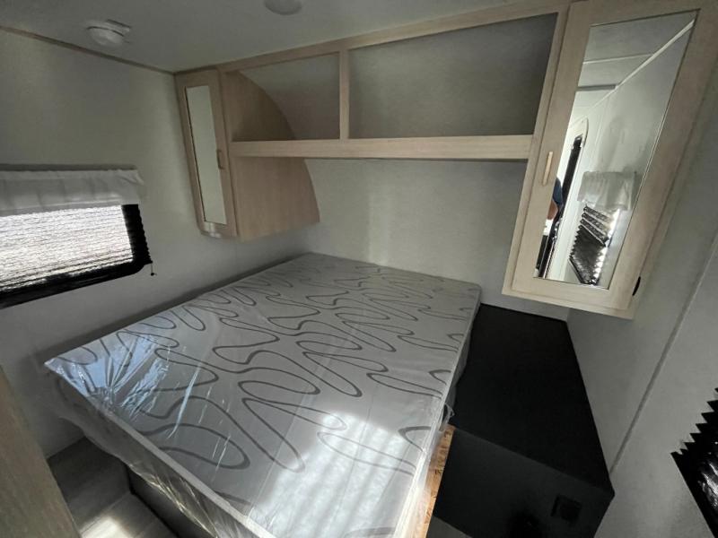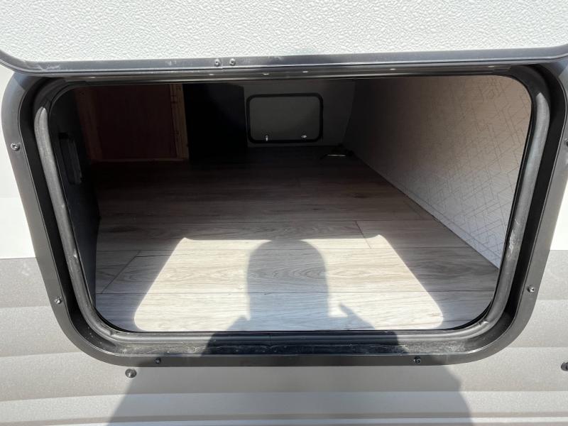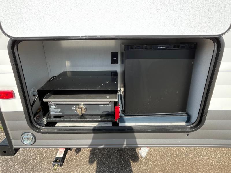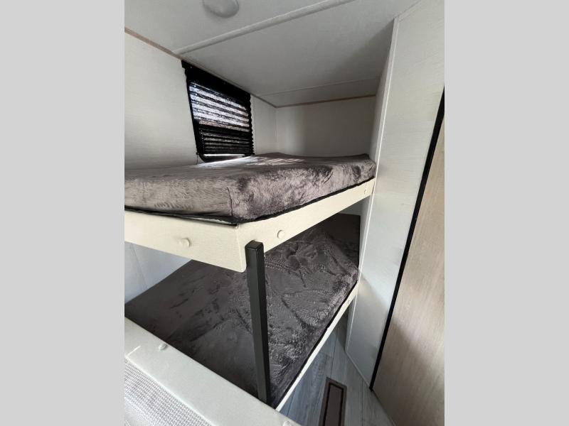 The whole family can go camping in this travel trailer! This trailer offers sleeping accommodations for up to eight because of the double-size bunk beds, the booth dinette, the sofa and the queen bed. There is a rear corner full bathroom with a medicine cabinet to store personal belongings. You will find full kitchen amenities inside, as well as an outdoor kitchen where you can watch the kids play while making dinner. The front private bedroom offers a place to retreat and relax after a fun day of playing at the beach!