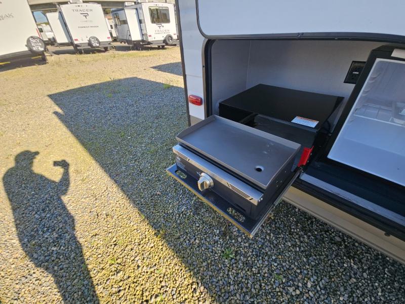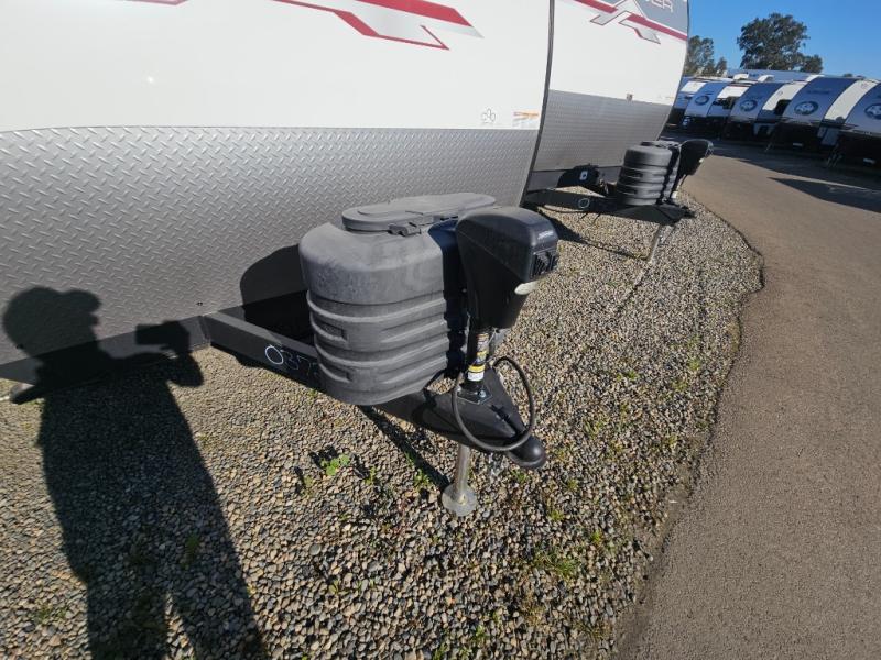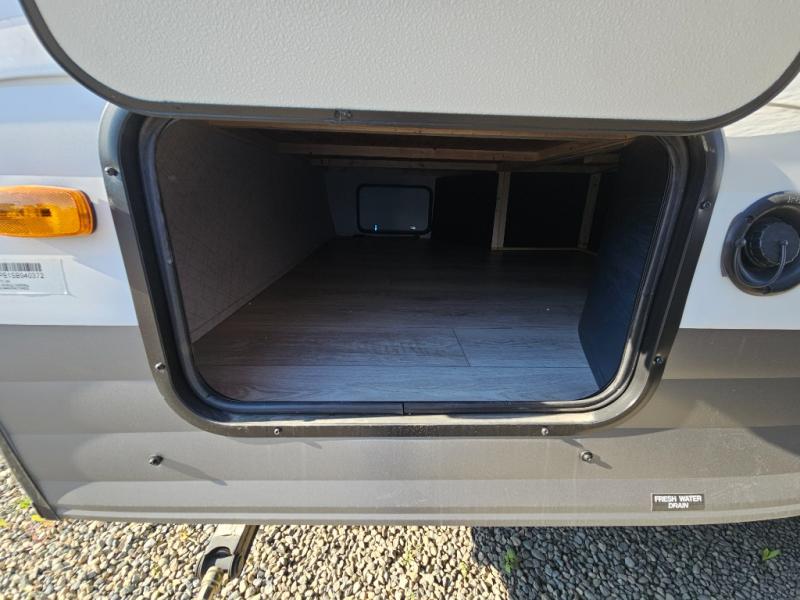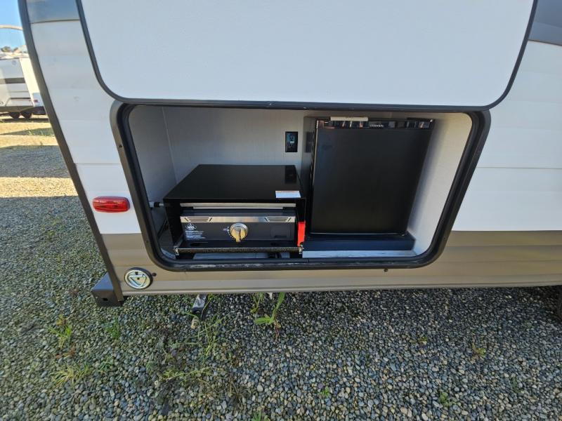 The whole family can go camping in this travel trailer! This trailer offers sleeping accommodations for up to eight because of the double-size bunk beds, the booth dinette, the sofa and the queen bed. There is a rear corner full bathroom with a medicine cabinet to store personal belongings. You will find full kitchen amenities inside, as well as an outdoor kitchen where you can watch the kids play while making dinner. The front private bedroom offers a place to retreat and relax after a fun day of playing at the beach!