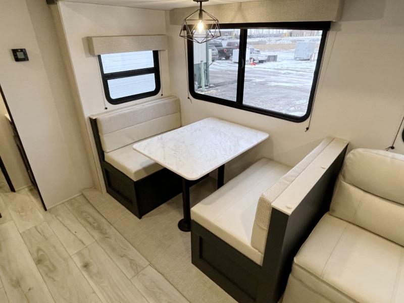 Looking for a trailer that houses everyone? This trailer offers lots of sleeping choices with a set of double-size bunks, a queen bed and furniture that doubles as sleeping space! You will also appreciate the added interior space thanks to the large slide in the living area that features a booth dinette and sofa. Up front, there is a private bedroom where you can retreat to at night away from the bunks in the back, and the bedroom features ample storage with dual wardrobes and an overhead shelf for your things.
