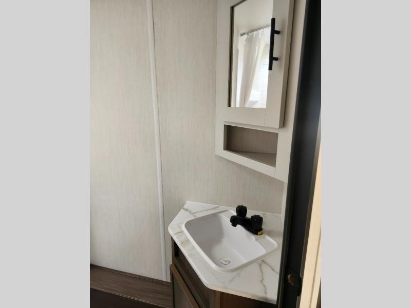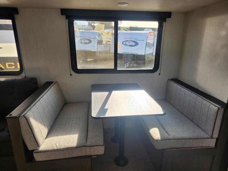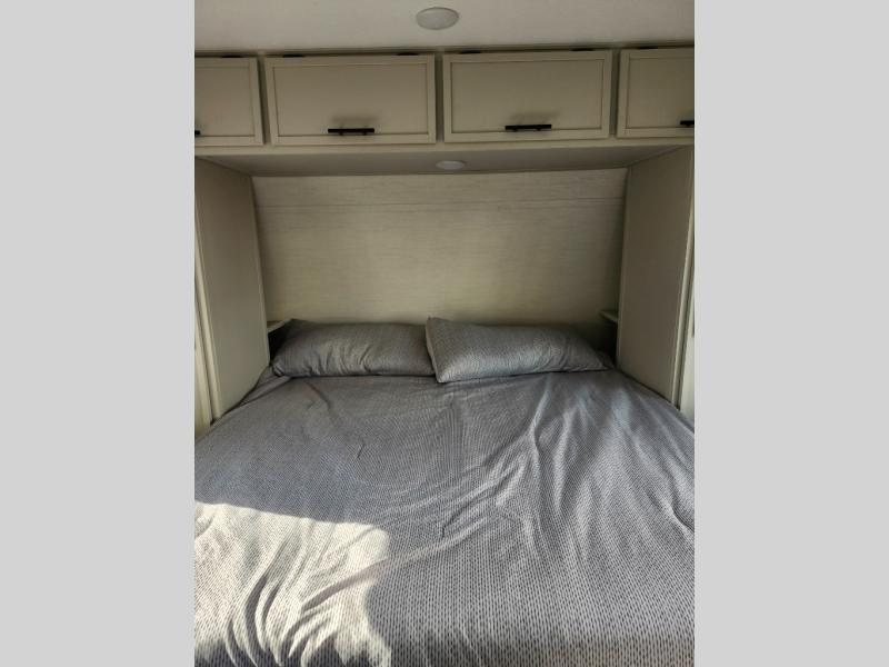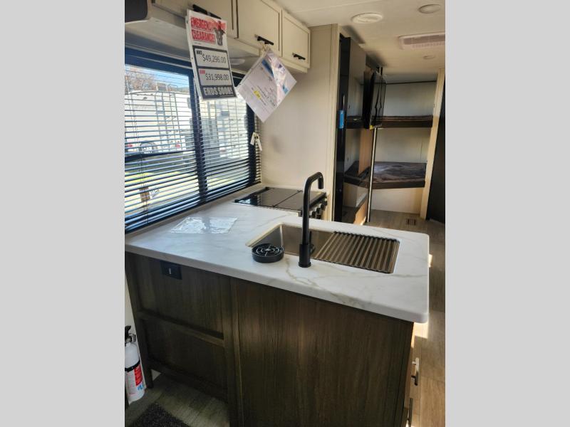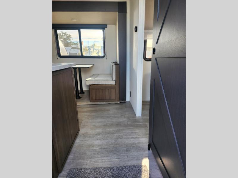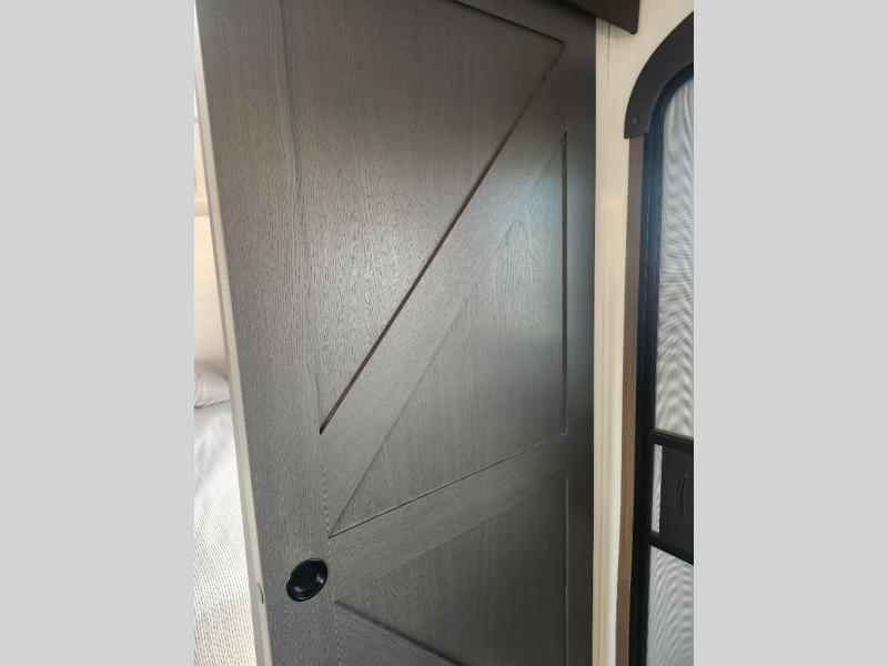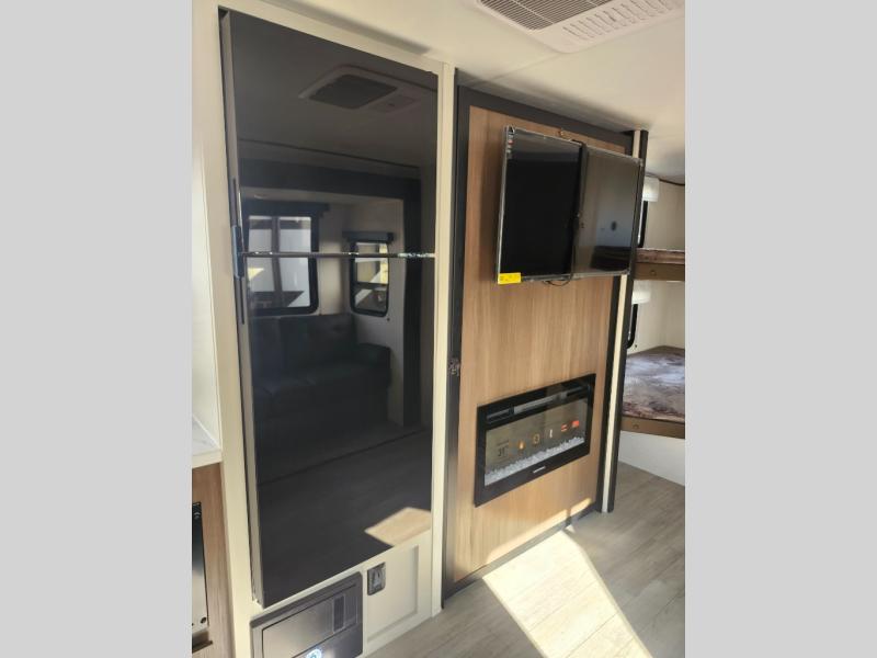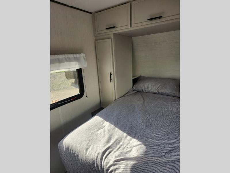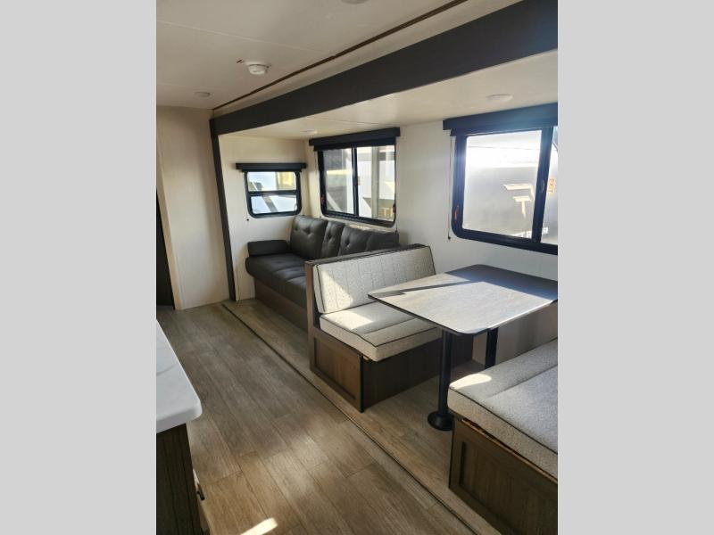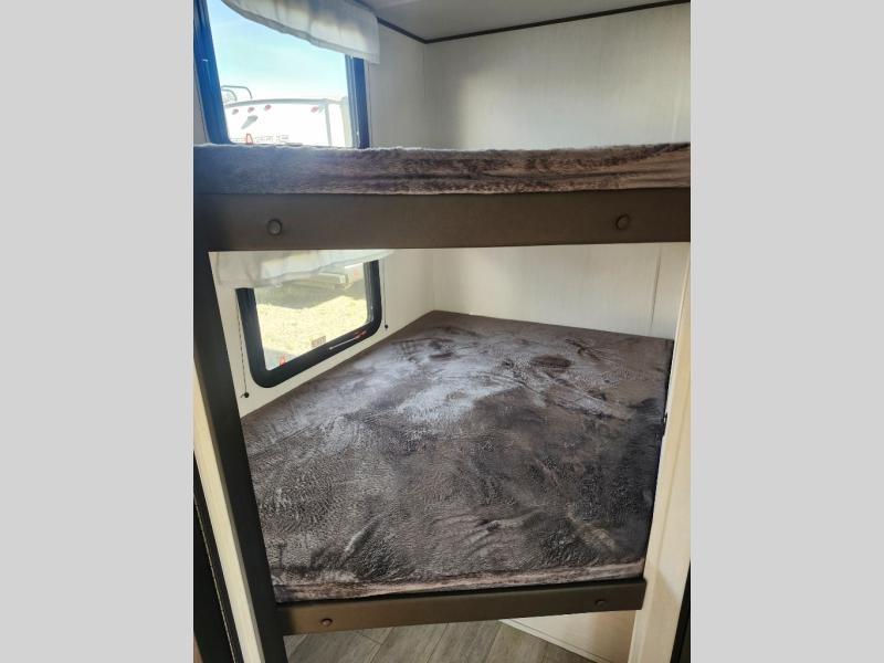 Looking for a trailer that houses everyone? This trailer offers lots of sleeping choices with a set of double-size bunks, a queen bed and furniture that doubles as sleeping space! You will also appreciate the added interior space thanks to the large slide in the living area that features a booth dinette and sofa. Up front, there is a private bedroom where you can retreat to at night away from the bunks in the back, and the bedroom features ample storage with dual wardrobes and an overhead shelf for your things.