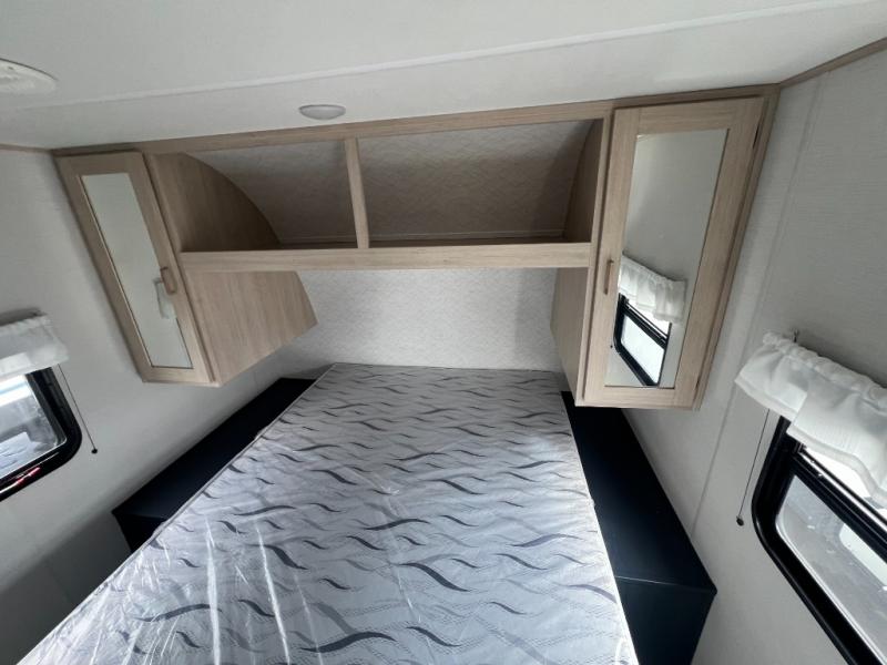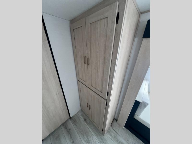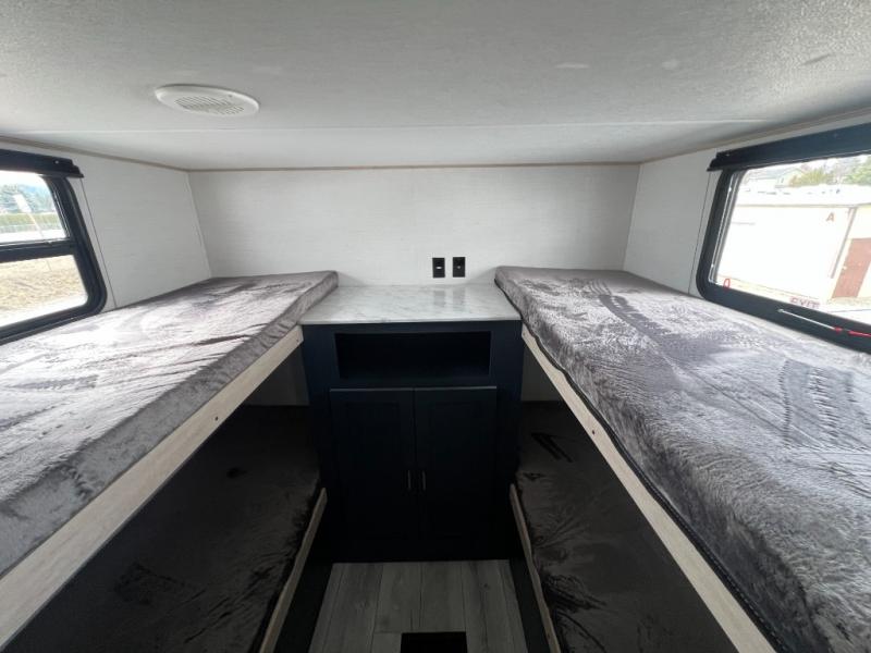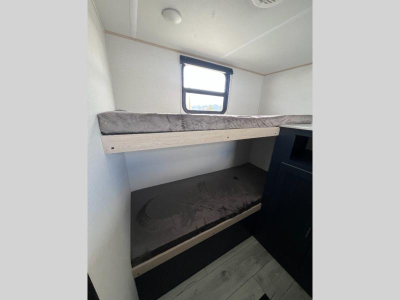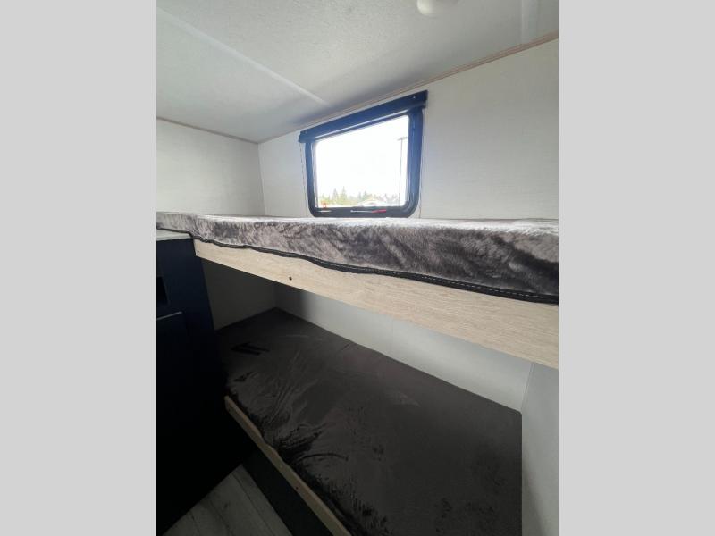 Get ready for outdoor fun and inside comforts and privacy in this trailer! The rear private bunkhouse features four bunk beds with a wardrobe in between which is perfect for keeping the room tidy. The front private bedroom offers a walk-around queen bed along with dual wardrobes and an overhead shelf to place more items. The large slide will provide the space you desire when inside relaxing, and even while preparing meals in the kitchen, there is ample room for movement throughout. A booth dinette and sofa create seating for several which is perfect for meals, game playing, or when entertaining your family and friends. And you can have some sleep on the furniture as well.