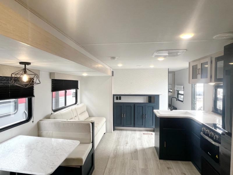 Get ready for outdoor fun and inside comforts and privacy in this trailer! The rear private bunkhouse features four bunk beds with a wardrobe in between which is perfect for keeping the room tidy. The front private bedroom offers a walk-around queen bed along with dual wardrobes and an overhead shelf to place more items. The large slide will provide the space you desire when inside relaxing, and even while preparing meals in the kitchen, there is ample room for movement throughout. A booth dinette and sofa create seating for several which is perfect for meals, game playing, or when entertaining your family and friends. And you can have some sleep on the furniture as well.