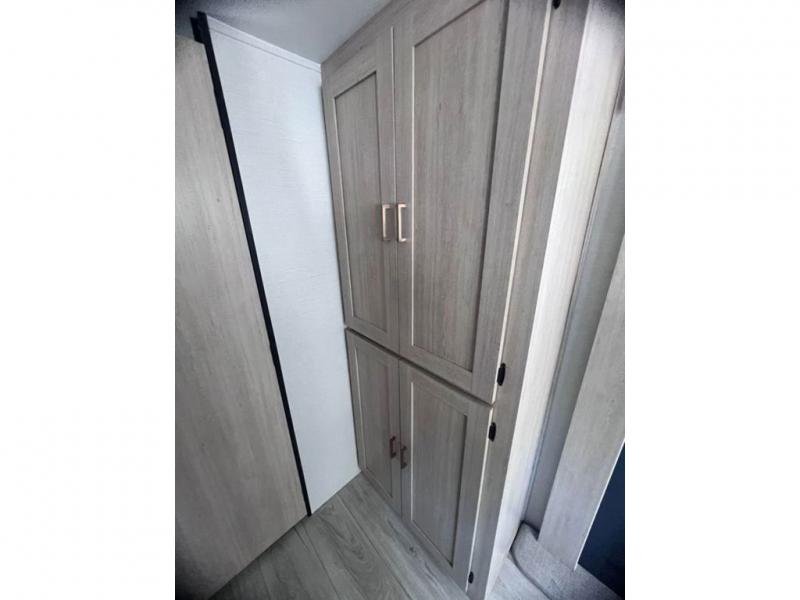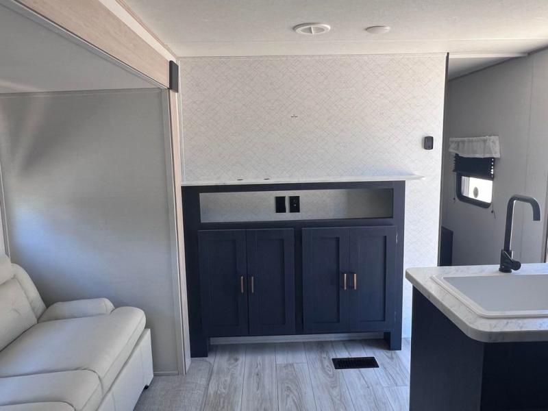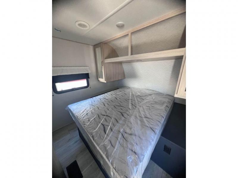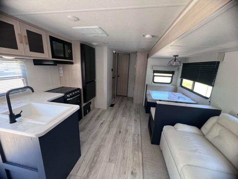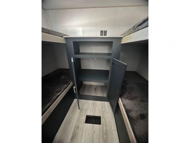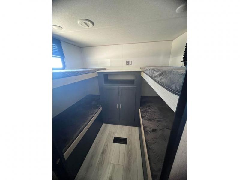 Get ready for outdoor fun and inside comforts and privacy in this trailer! The rear private bunkhouse features four bunk beds with a wardrobe in between which is perfect for keeping the room tidy. The front private bedroom offers a walk-around queen bed along with dual wardrobes and an overhead shelf to place more items. The large slide will provide the space you desire when inside relaxing, and even while preparing meals in the kitchen, there is ample room for movement throughout. A booth dinette and sofa create seating for several which is perfect for meals, game playing, or when entertaining your family and friends. And you can have some sleep on the furniture as well.