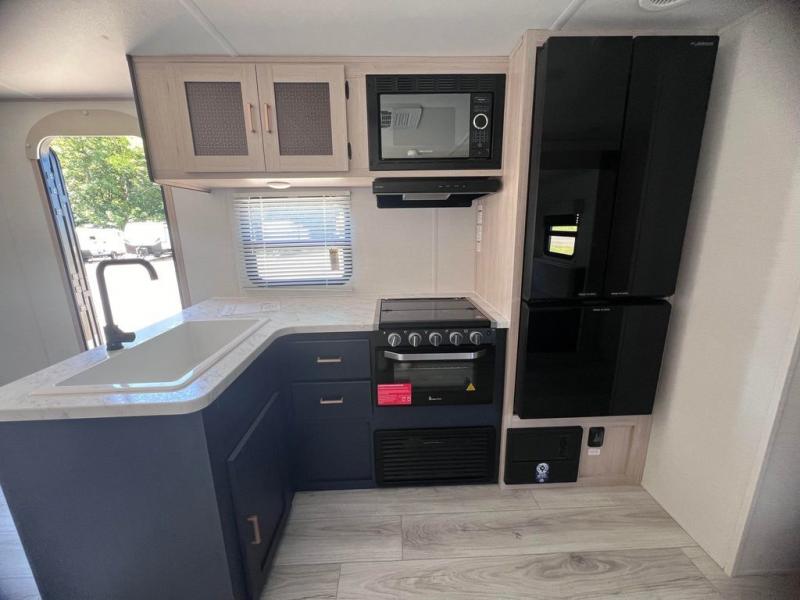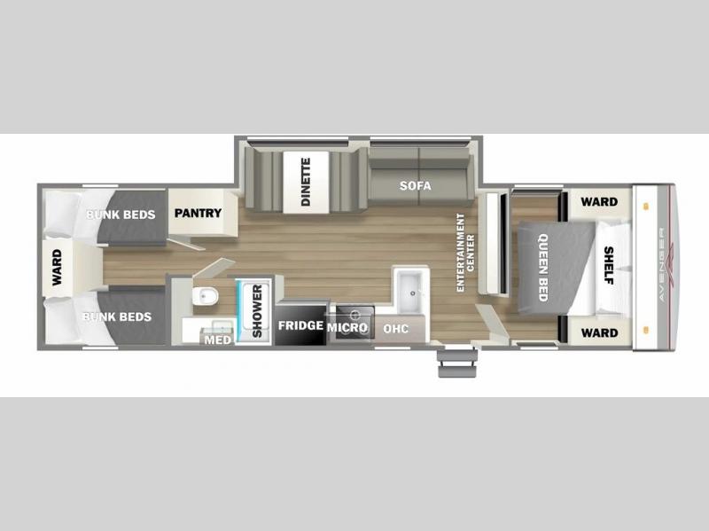 With any Avenger LE travel trailer by Prime Time RV you will enjoy at-home comforts while at the campground! Durable construction begins with an enclosed and heated underbelly, a one-piece roof membrane, and diamond plate front rock guard for added protection against debris during transport. There are also locking magnetic latches on the baggage doors, fully vented windows throughout, four stabilizer jacks, plus solar prep if you want the option to go off-grid. The interior will have you feeling right at home with residential extended ball bearing drawer glides, seamless Carefree Congoleum flooring, an XL single basin kitchen sink, and shower pans in all models that will make it easy to get in and out of the bath. Some of the convenient appliances and equipment you will appreciate are the 15,000 BTU A/C, 12V high-capacity water pump, Slim Profile range hood, and the Winegard 360+ antenna with Wi-Fi prep!