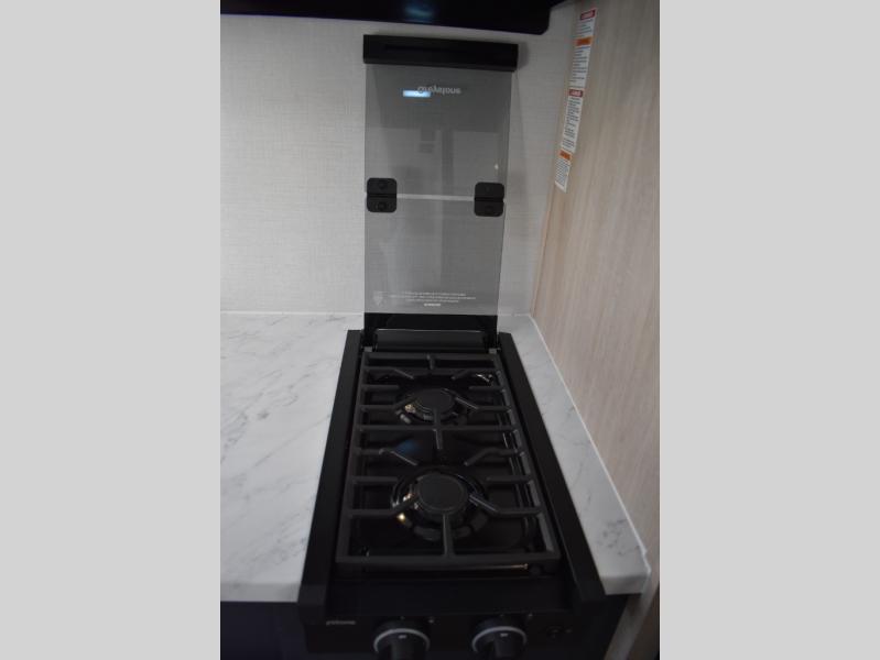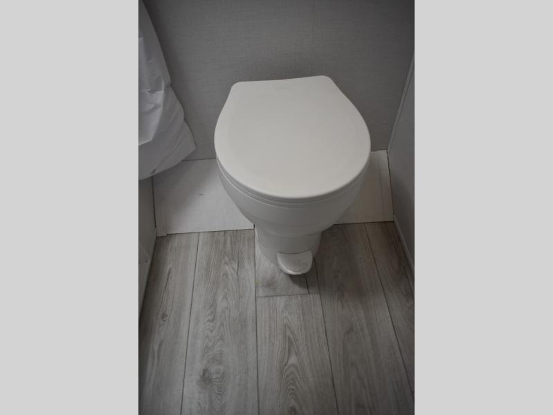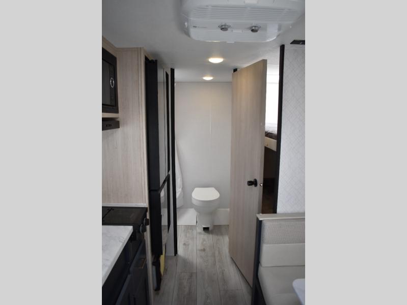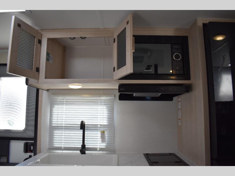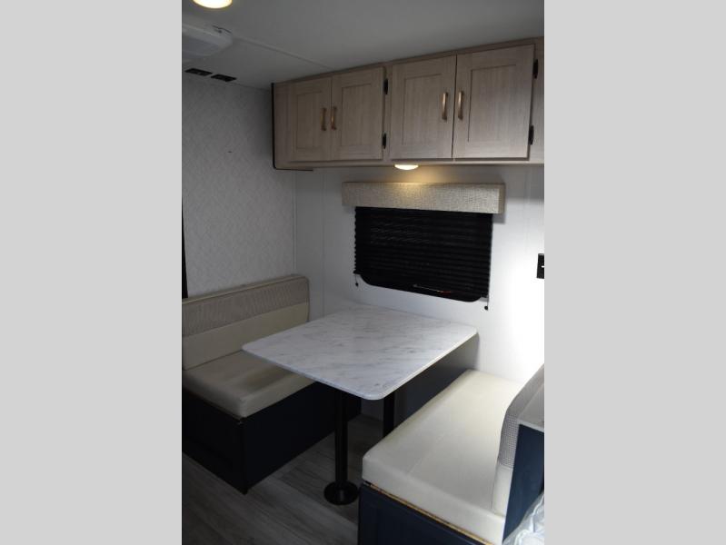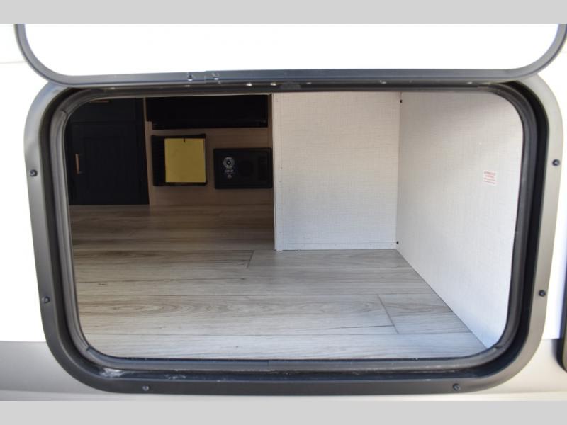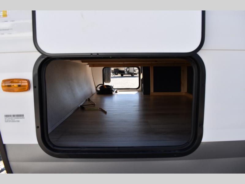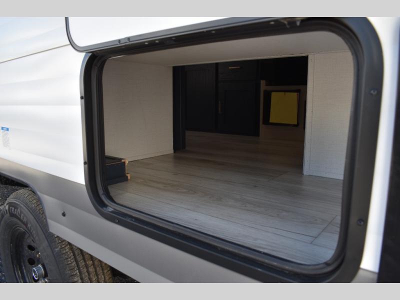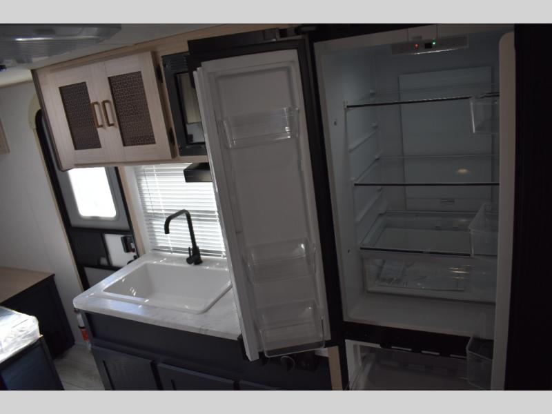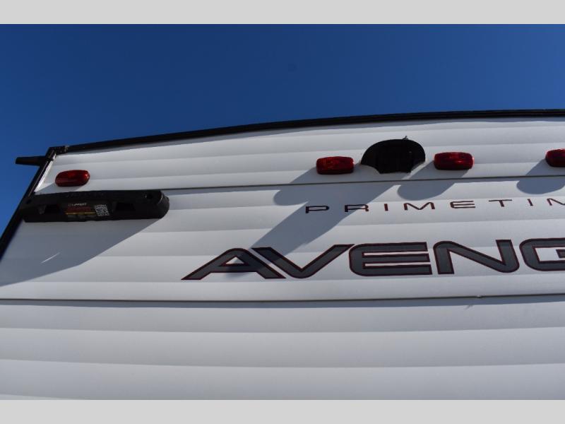 With any Avenger LT travel trailer by Prime Time, the exterior includes an aerodynamic smooth front metal, a front diamond plate for protection on the road, and two stabilizer jacks. There is also exclusive Everlast construction, a PVC roof membrane, and solar prep for the option to go off-grid. The interior offers seamless Carefree Congoleum flooring for easy cleanup and durability, pleated night shades throughout for privacy, a bottle opener, and residential extended ball bearing drawer guides.