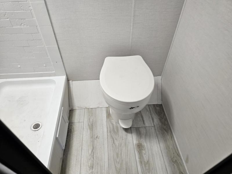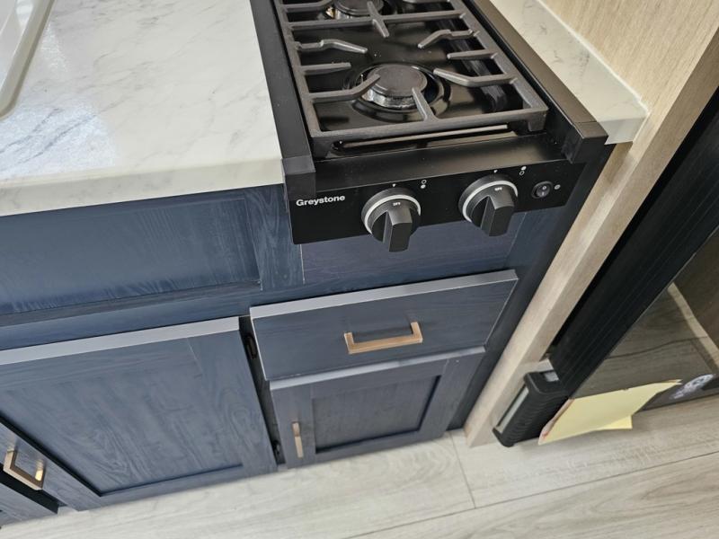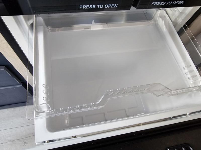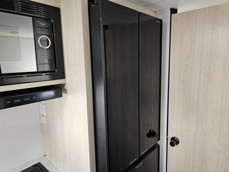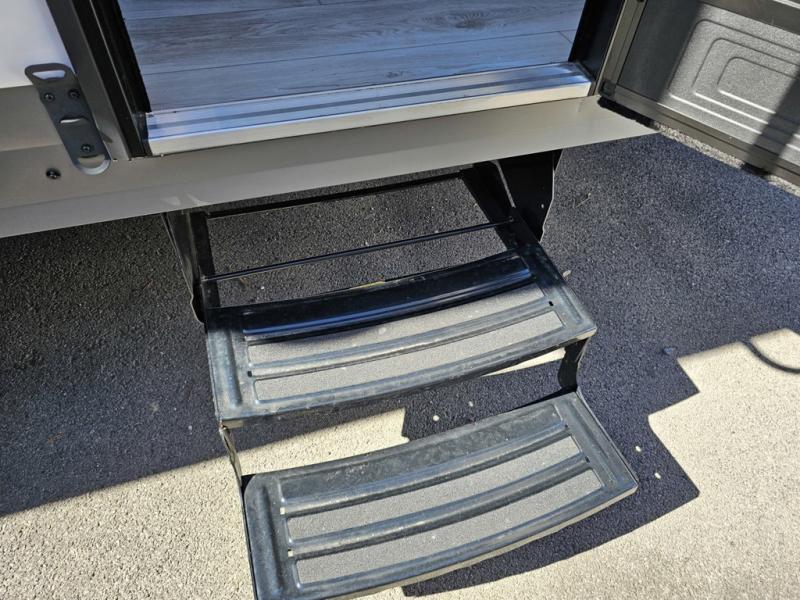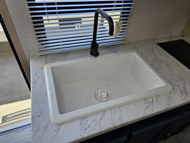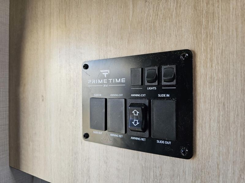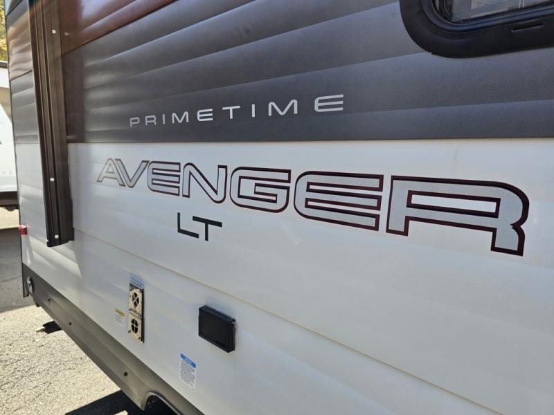 With any Avenger LT travel trailer by Prime Time, the exterior includes an aerodynamic smooth front metal, a front diamond plate for protection on the road, and two stabilizer jacks. There is also exclusive Everlast construction, a PVC roof membrane, and solar prep for the option to go off-grid. The interior offers seamless Carefree Congoleum flooring for easy cleanup and durability, pleated night shades throughout for privacy, a bottle opener, and residential extended ball bearing drawer guides.
