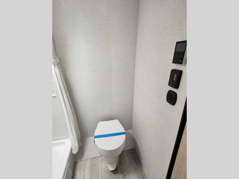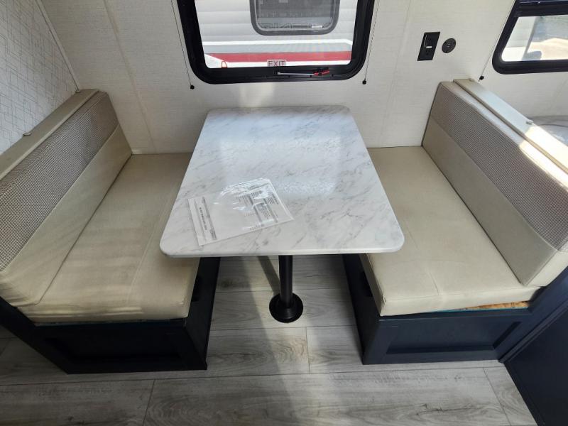 With any Avenger LT travel trailer by Prime Time, the exterior includes an aerodynamic smooth front metal, a front diamond plate for protection on the road, and two stabilizer jacks. There is also exclusive Everlast construction, a PVC roof membrane, and solar prep for the option to go off-grid. The interior offers seamless Carefree Congoleum flooring for easy cleanup and durability, pleated night shades throughout for privacy, a bottle opener, and residential extended ball bearing drawer guides.