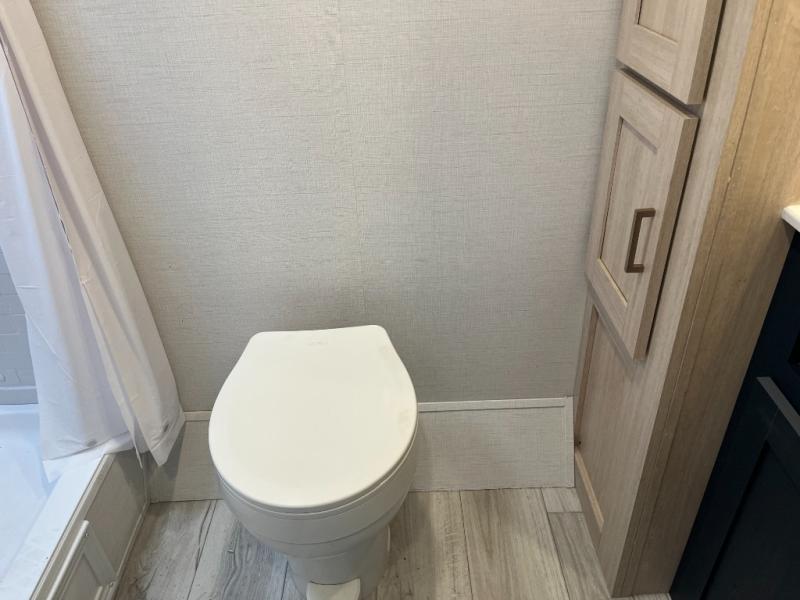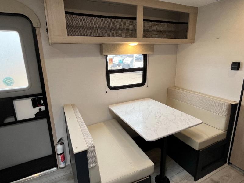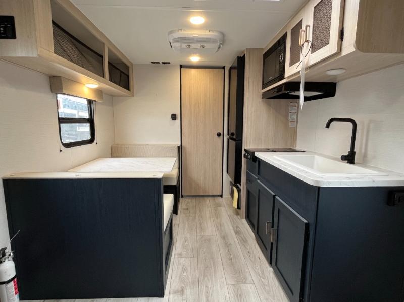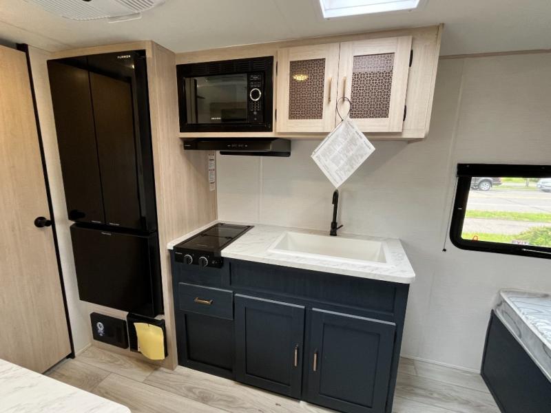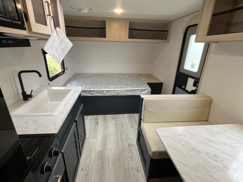 You'll love spending time outdoors with the LED-lit power awning. When you get tired from your day of hiking, relax on the front bed with dual wardrobes and overhead cabinets to hold your clothing and such. And you'll appreciate the extra lighting from the kitchen skylight as you cook with the two-burner cooktop or microwave.