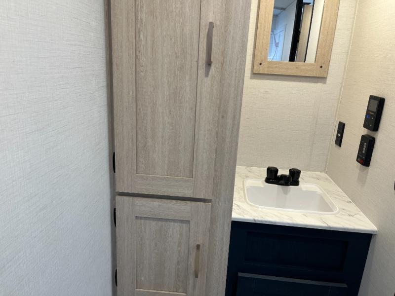 With any Avenger LT travel trailer by Prime Time, the exterior includes an aerodynamic smooth front metal, a front diamond plate for protection on the road, and two stabilizer jacks. There is also exclusive Everlast construction, a PVC roof membrane, and solar prep for the option to go off-grid. The interior offers seamless Carefree Congoleum flooring for easy cleanup and durability, pleated night shades throughout for privacy, a bottle opener, and residential extended ball bearing drawer guides.
